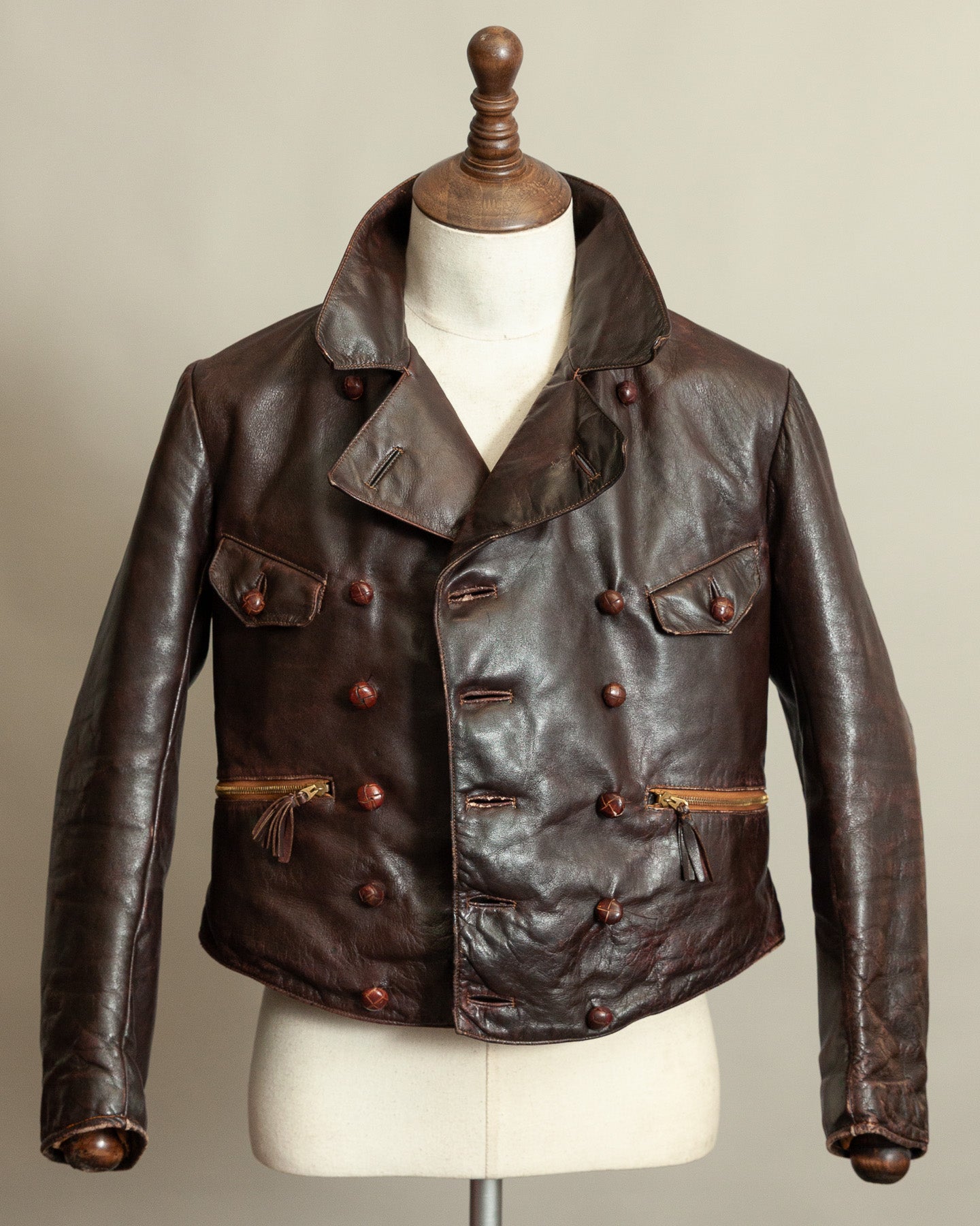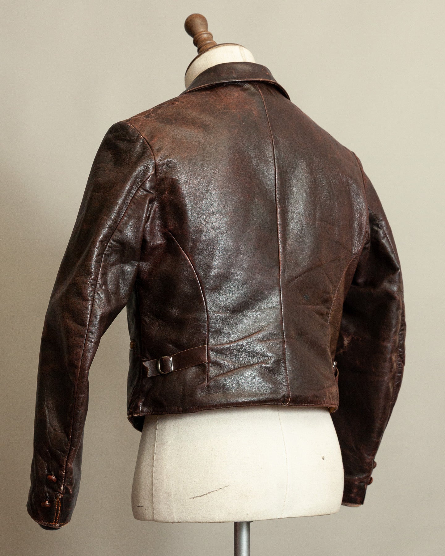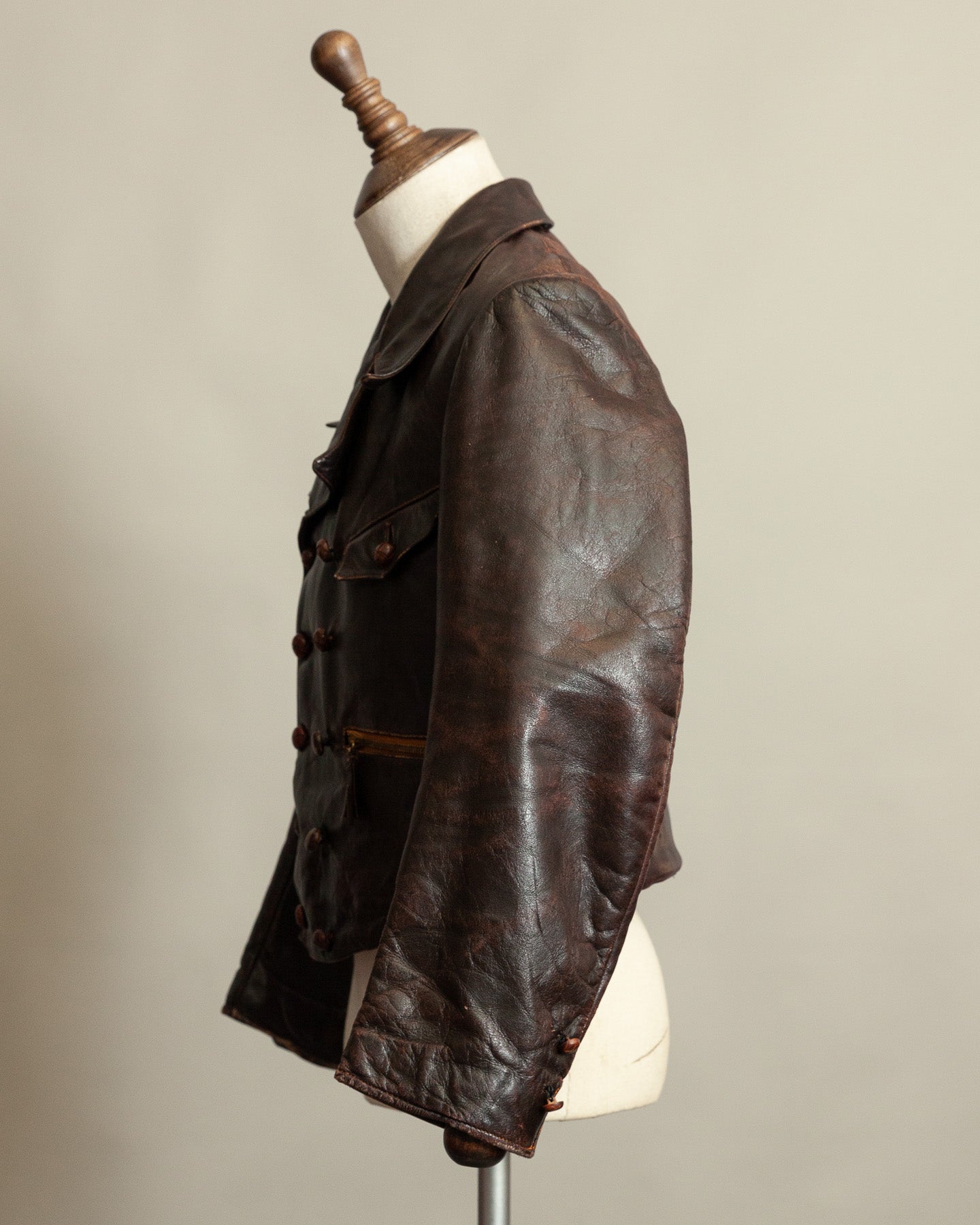 The leather remains supple, evenly toned and structurally strong. Surface wear is consistent with period use and long term preservation. There are no signs of cracking, panel weakness or instability. The majority of buttons are original, with a small number of period matched replacements added historically. Rheinnadel D.R.P. pocket zippers function correctly. Side buckles remain intact and operational. The moleskin lining is clean and well preserved.