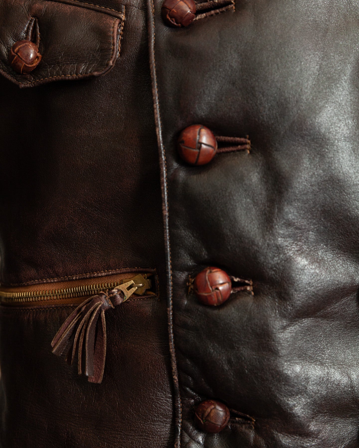 Constructed from high quality mid-weight German leather, most consistent with chrome tanned cowhide typical of private purchase Luftwaffe officer jackets of the period, the hide displays a natural drape rather than stiffness. The surface shows tight, even grain and a deep brown tone that has matured evenly over time. Wear is honest and consistent with age, with natural burnishing at high points but no dryness, brittleness or structural weakness. The leather remains supple and stable throughout.