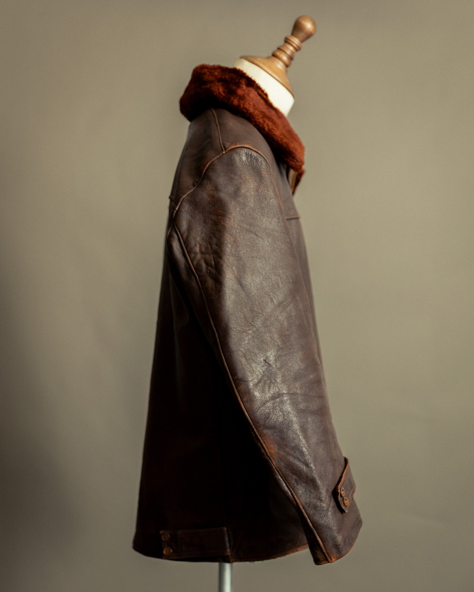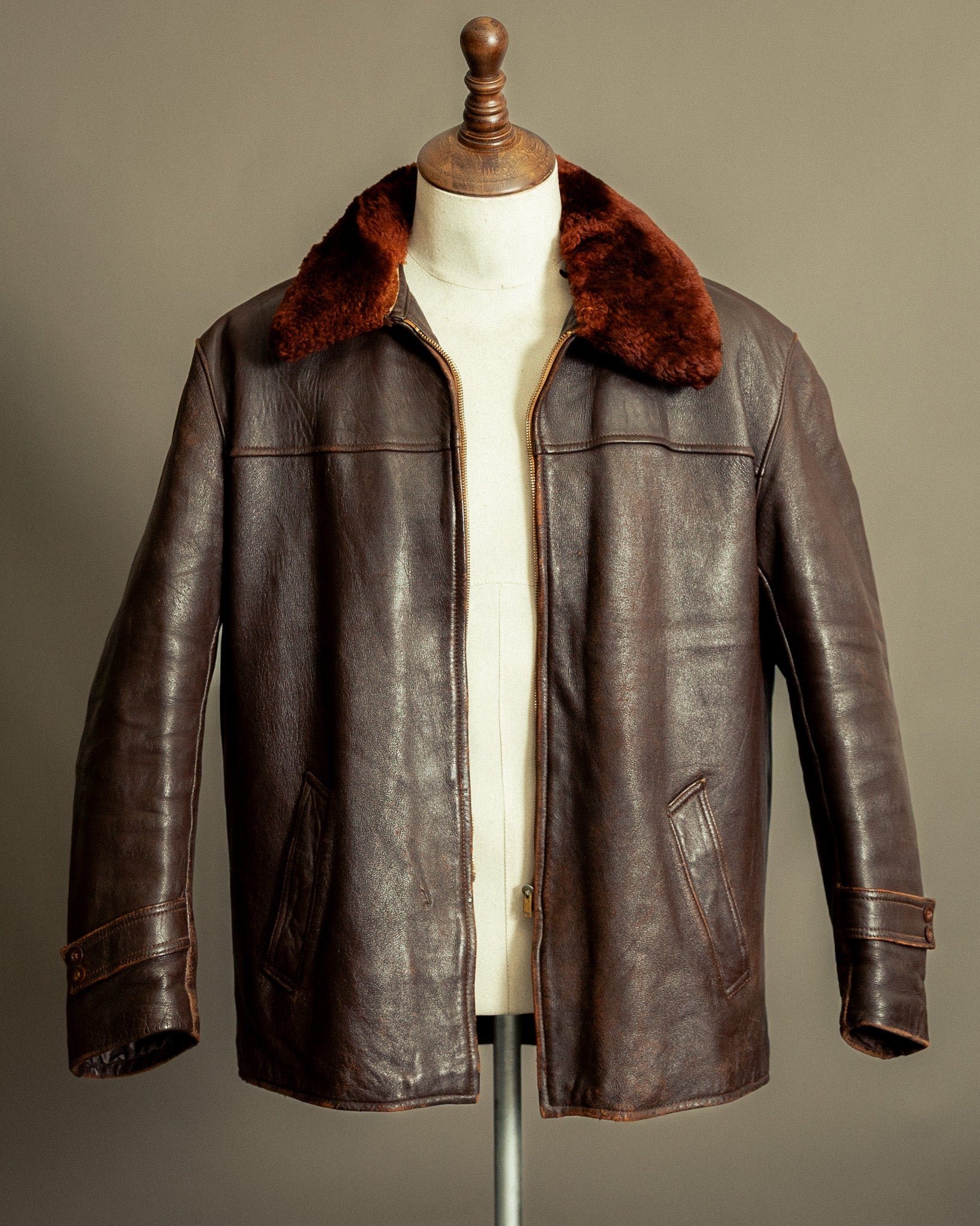 A superb example of late-1940s French workwear design — this blouson captures the era’s blend of utility, craftsmanship, and understated elegance. Constructed from mid-weight full-grain cowhide and lined in warm brown moleskin cotton, it was built for durability and everyday function, yet carries the refined structure that defined French tailoring of the postwar years.