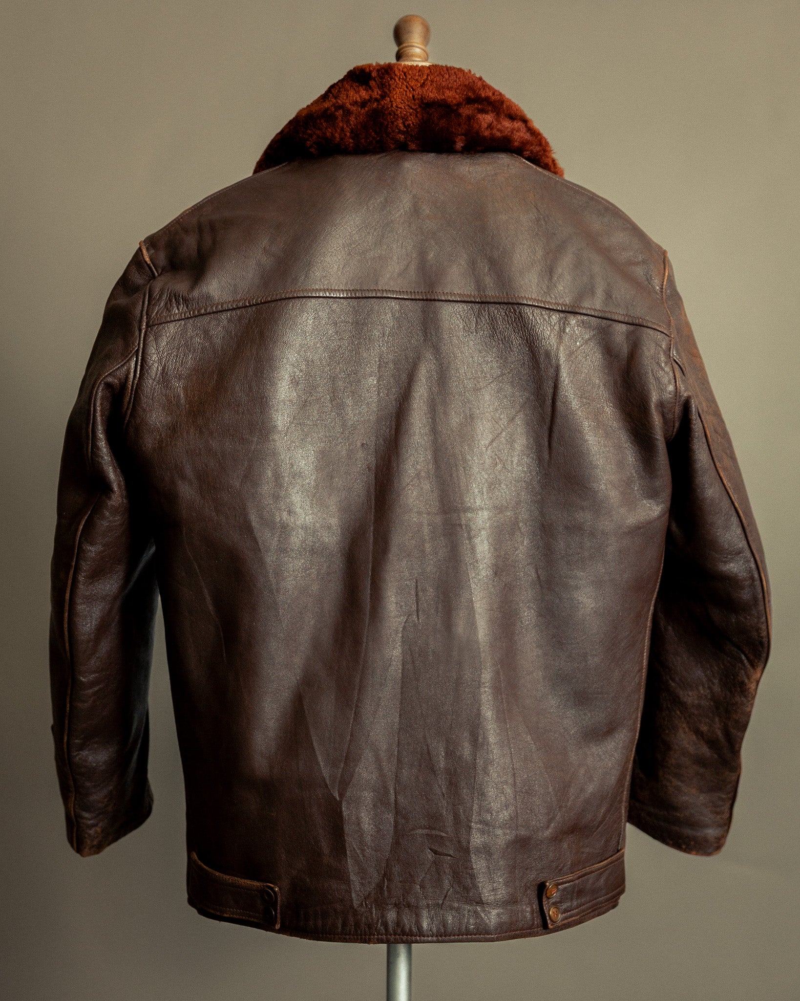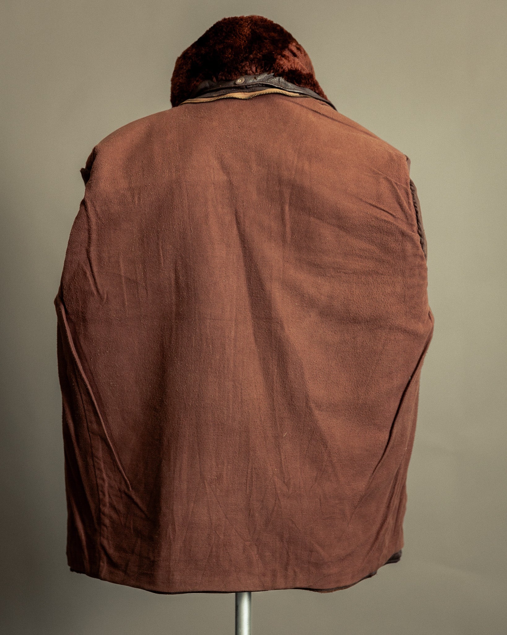 Condition is very good vintage, with a naturally distressed and storied surface that enhances its charm. The leather is strong and supple, all seams are secure, and the interior remains clean. The zip functions perfectly, and the mouton collar retains its softness and depth of tone.