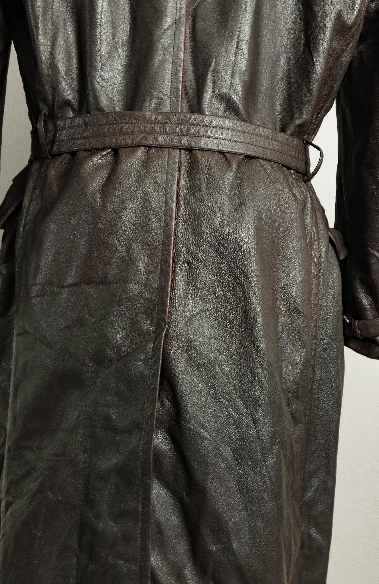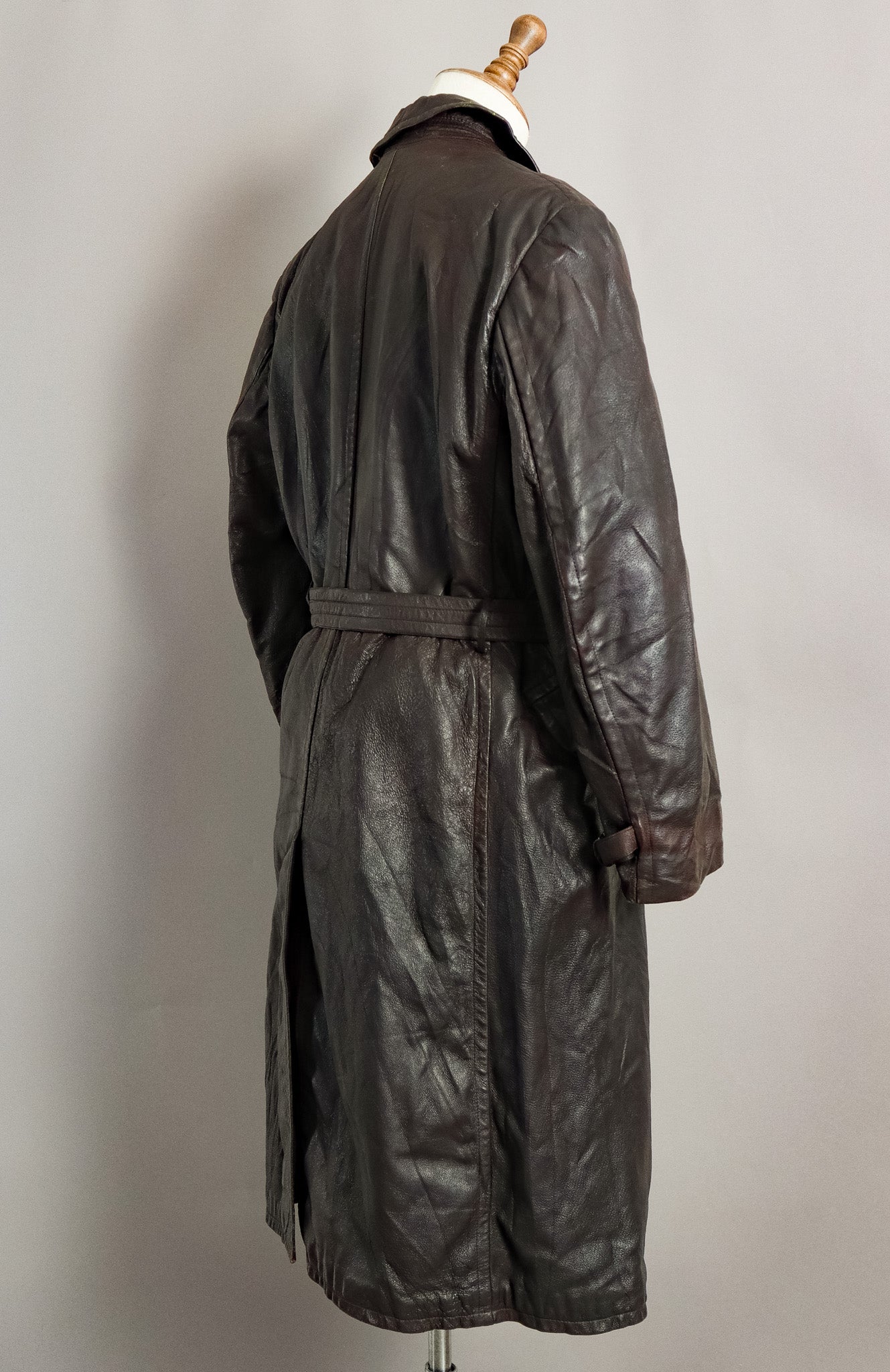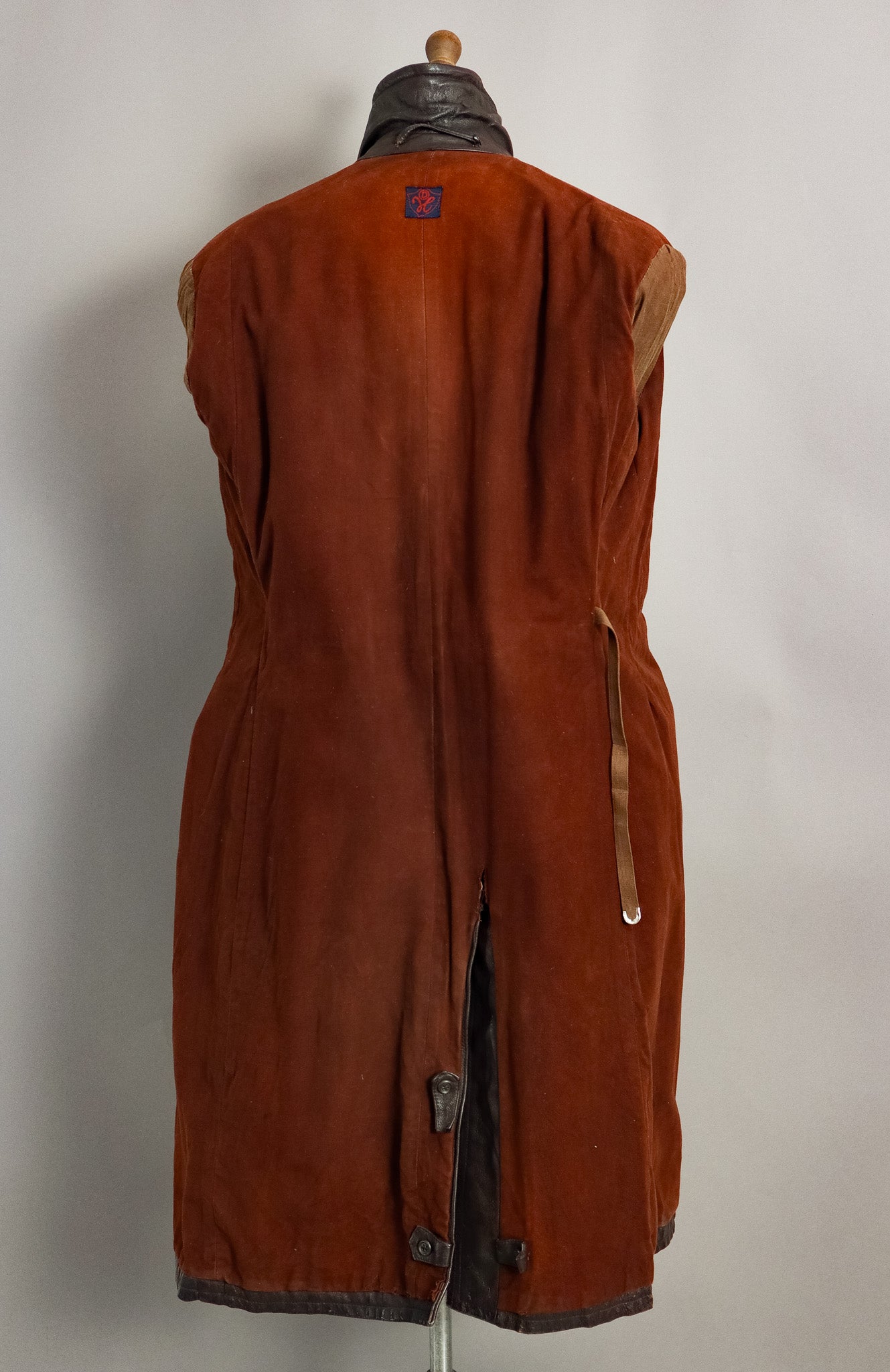 What sets this particular Ledermantel apart is its ingenious dual-belt system, featuring both the external belt with distinctive metal ring closure and the specialised internal body belt—a sophisticated insulation solution that created a microclimate between leather and body during harsh field operations. The original moleskin lining remains intact, demonstrating the superior material selection that distinguished officer garments from standard issue.
