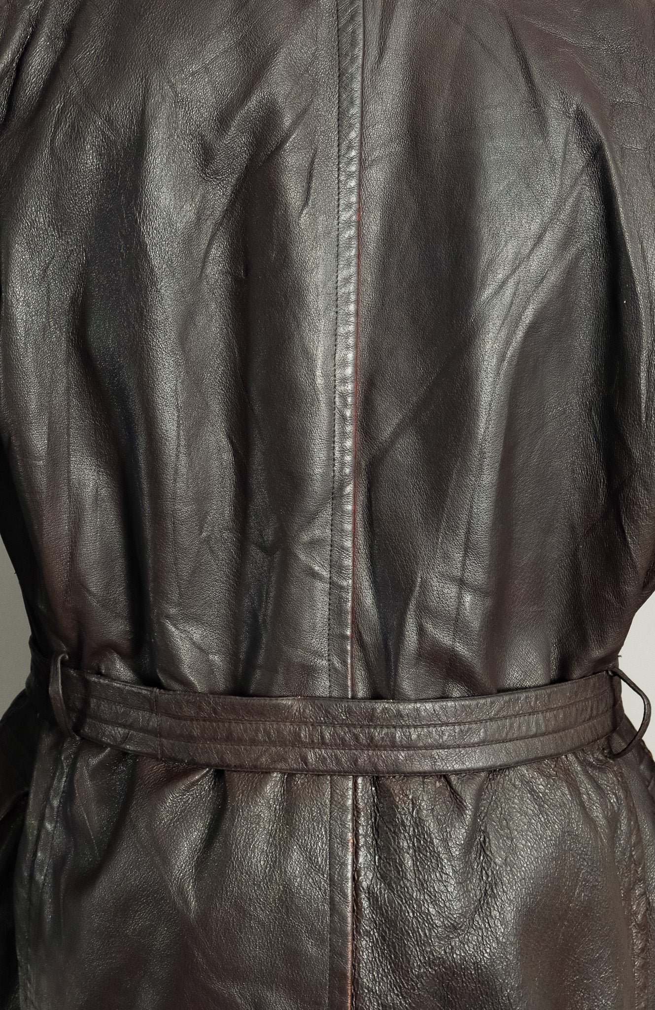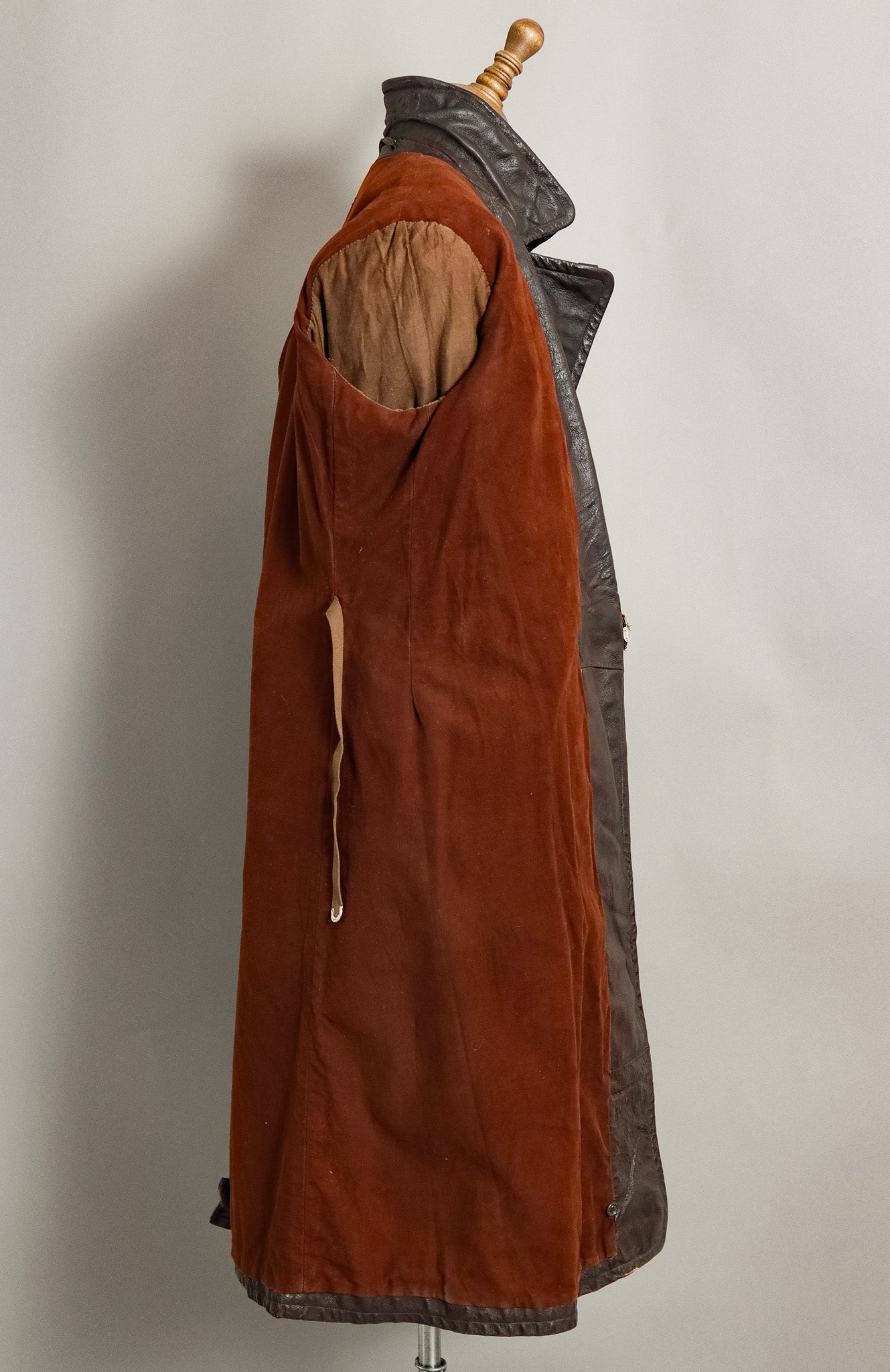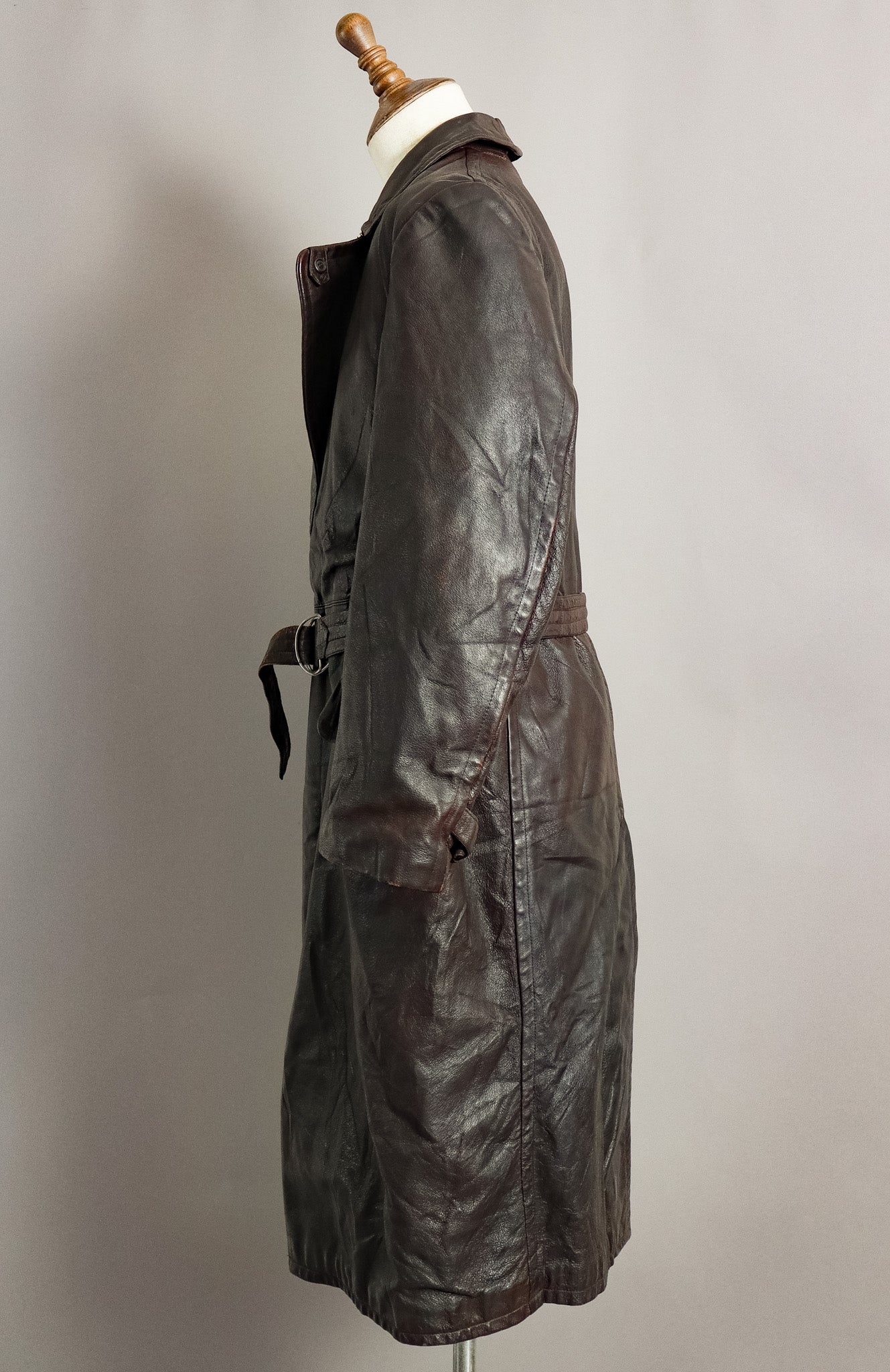 What sets this particular Ledermantel apart is its ingenious dual-belt system, featuring both the external belt with distinctive metal ring closure and the specialised internal body belt—a sophisticated insulation solution that created a microclimate between leather and body during harsh field operations. The original moleskin lining remains intact, demonstrating the superior material selection that distinguished officer garments from standard issue.