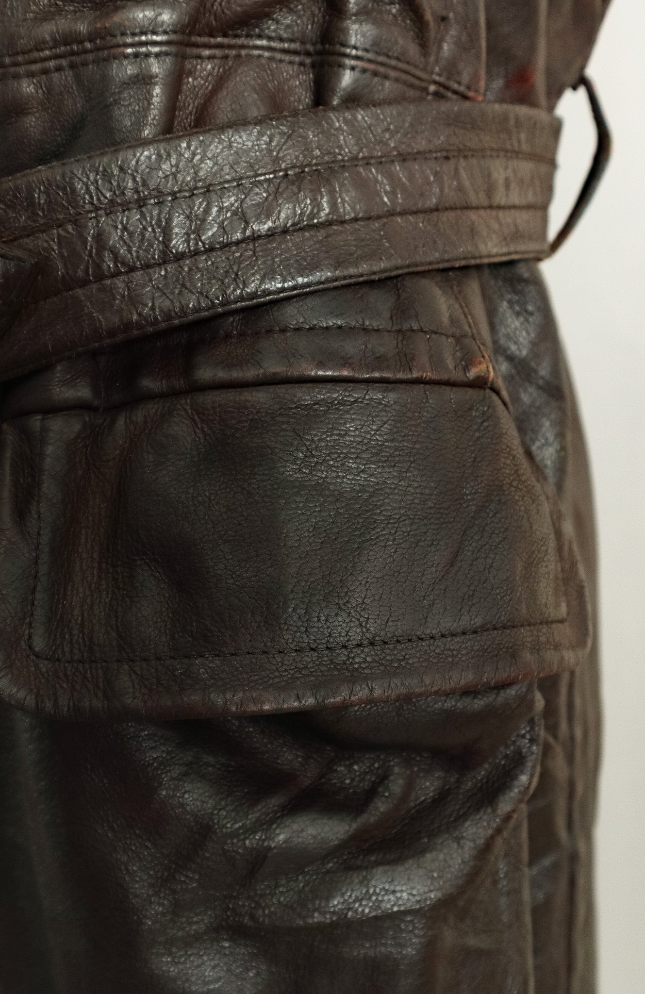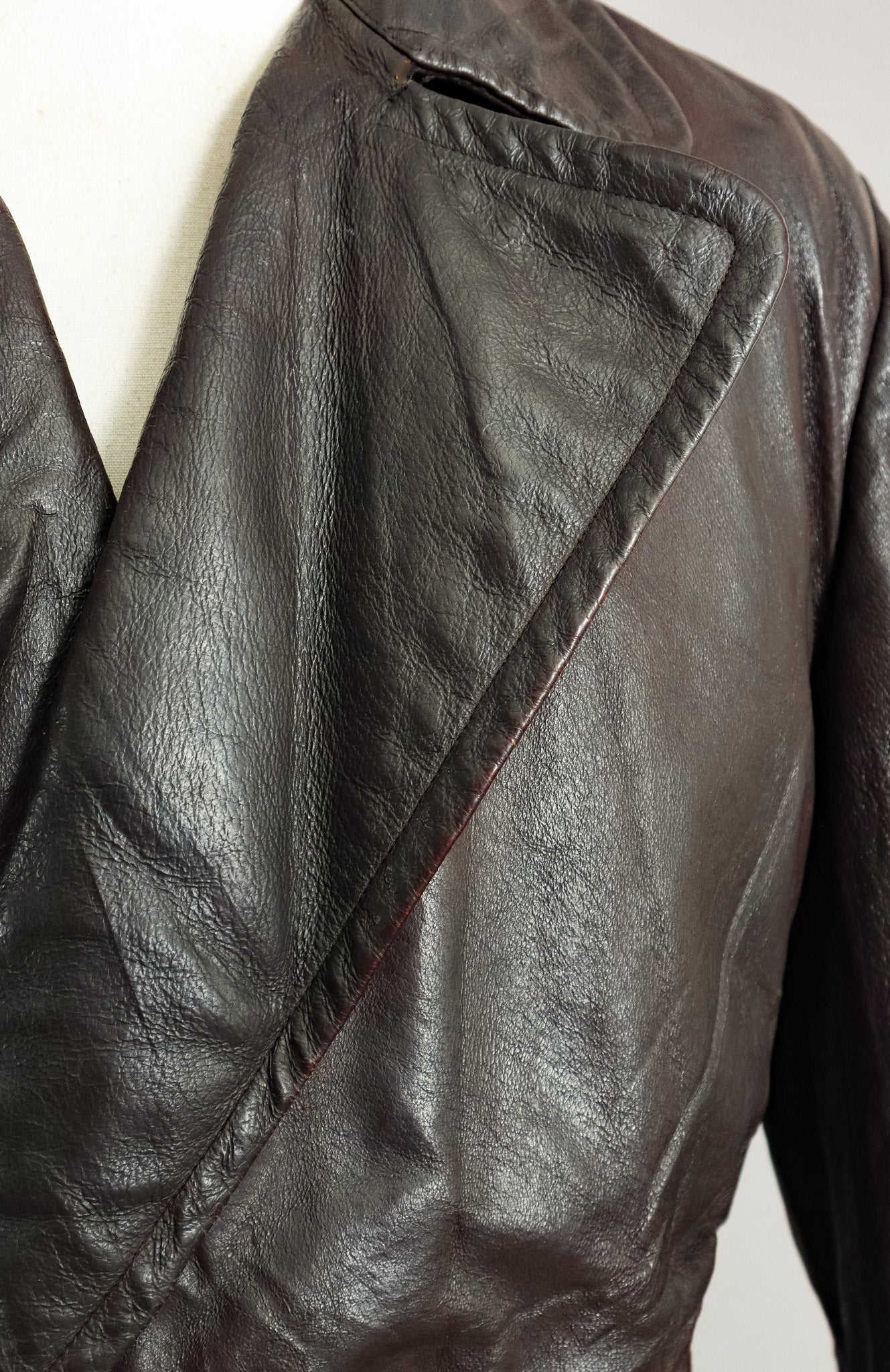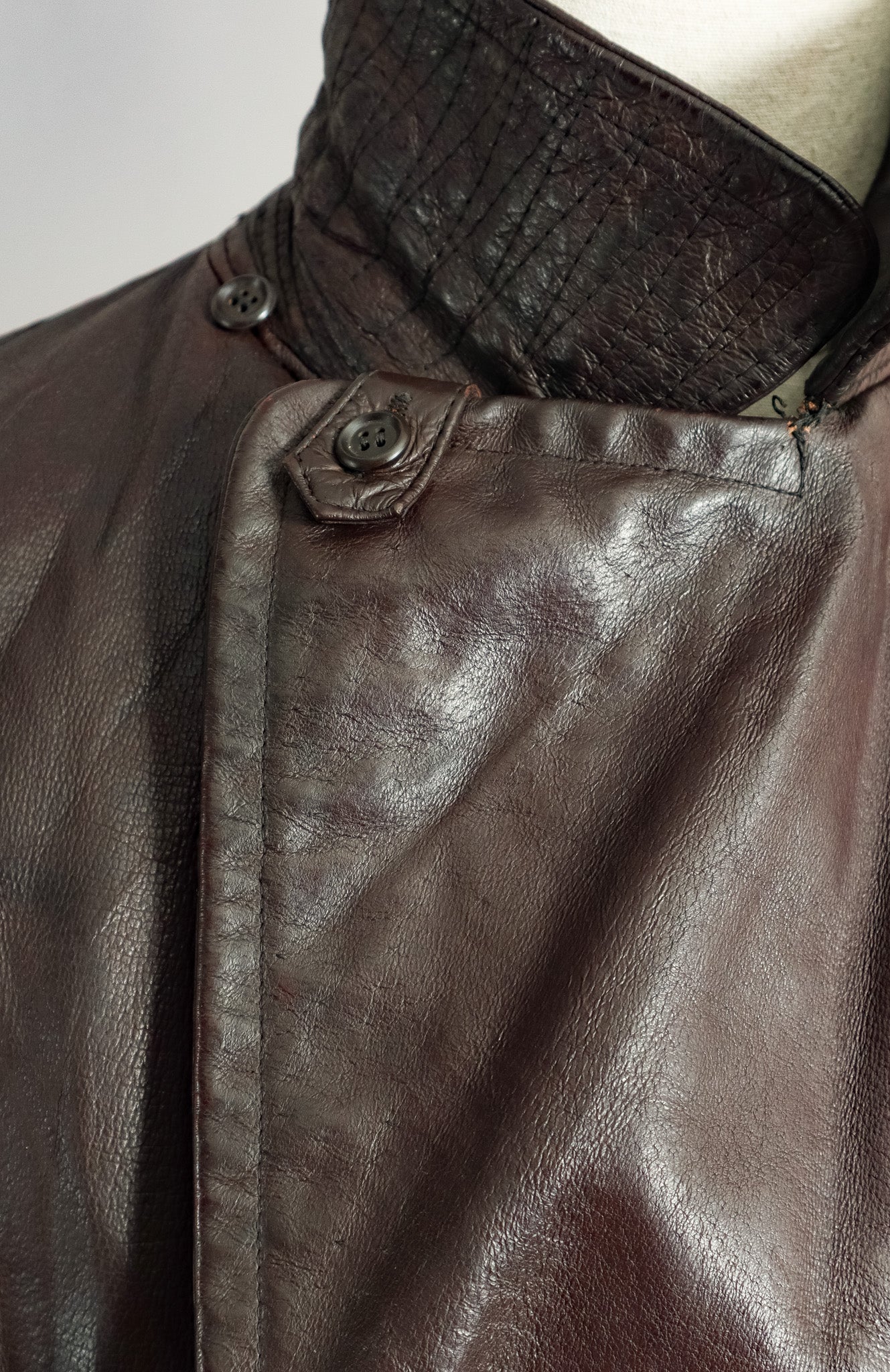 The goatskin leather, selected specifically for officer-grade garments has developed a character-rich patina over decades that simply cannot be replicated. Each crease and subtle mark tells the story of its journey through time, now carefully preserved through our signature restoration process.