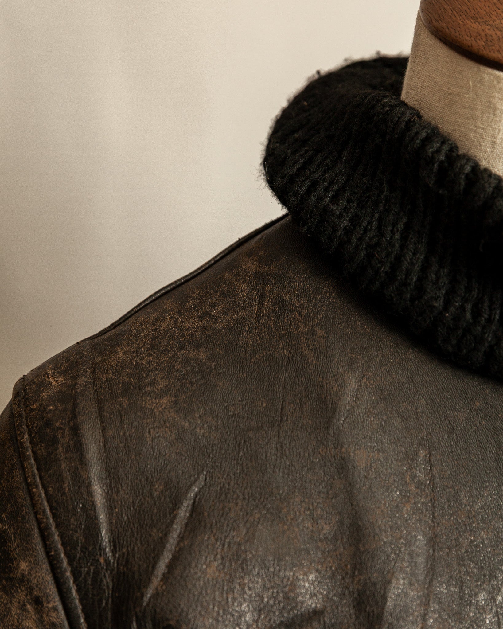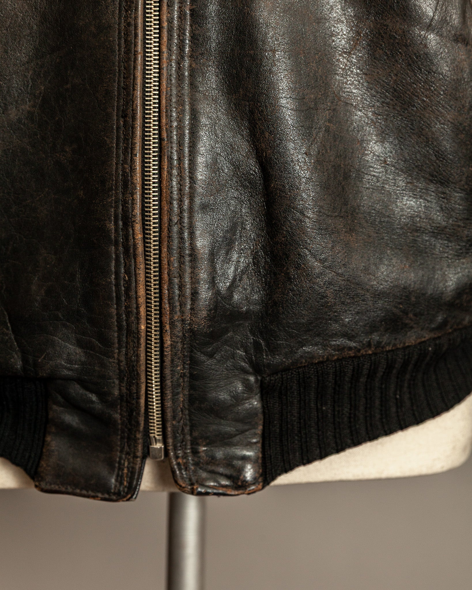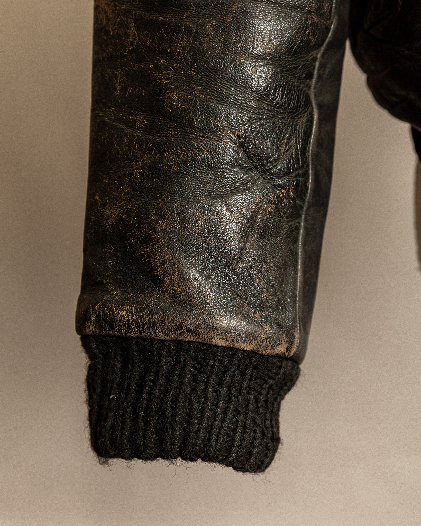 Every aspect of construction reflects quality and intention: clean panel lines, ribbed wool-knit collar, cuffs and waistband, and precise double-stitched seams throughout. Over the years, the jacket has had a small repair beneath the inner arm lining, as well as some discreet hand-stitched mends, each carried out with care and adding to its authenticity and narrative. It has been professionally cleaned and conditioned in-house, restoring suppleness while preserving the hide’s original finish. The leather remains strong, the knits resilient, and the hardware operates seamlessly. Surface variation and wear are consistent with honest use and add depth to its patina.