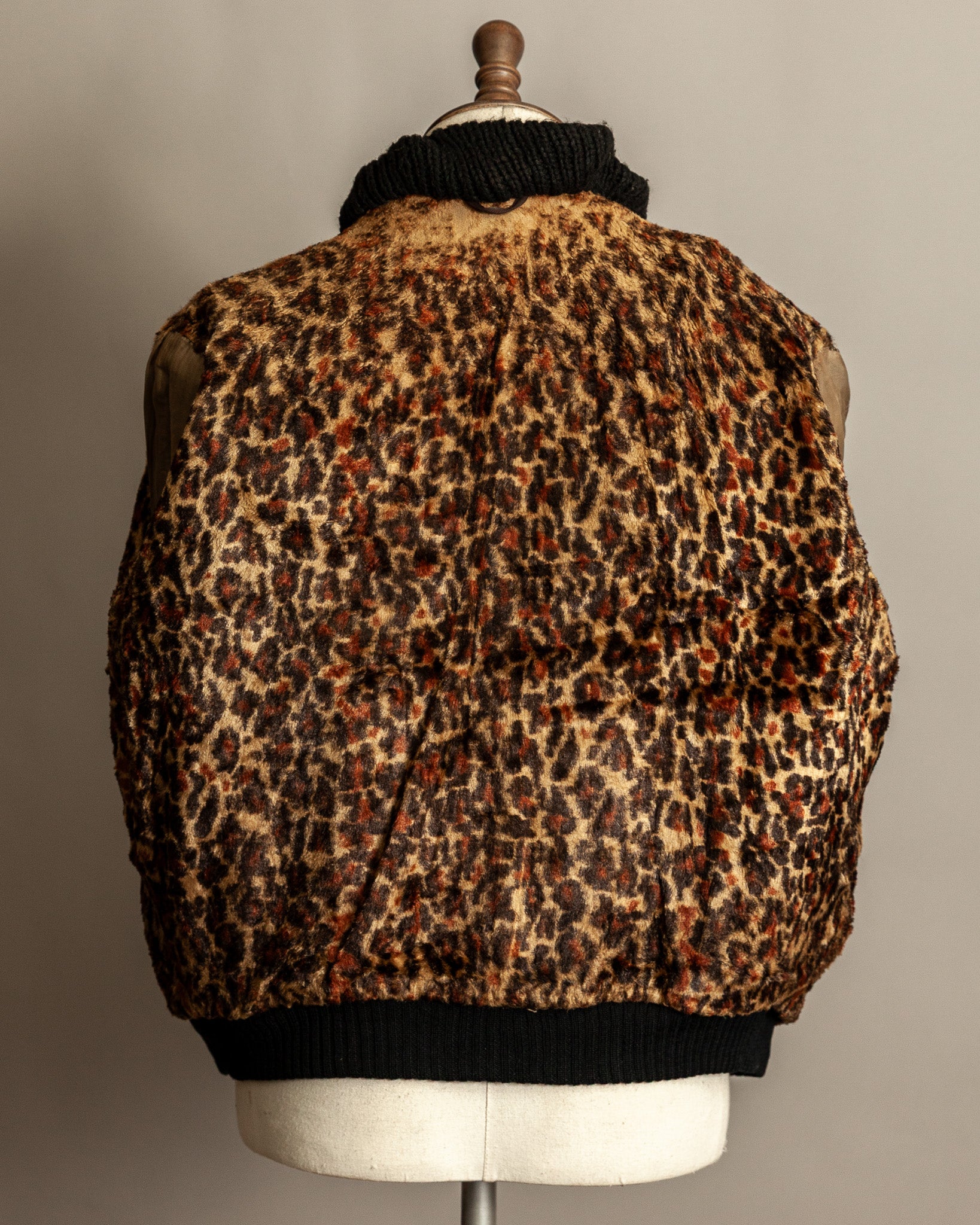 Constructed from buttery soft full-grain cowhide, the leather is unusually pliable for its age — dense yet supple, with a rich natural patina that reveals its decades of life and use. The hide’s surface carries tonal depth and quiet sheen, hallmarks of early vegetable-tanned German leathers. Inside, a leopard-print synthetic-pile lining adds warmth and character — a mid-century signature of postwar design — complemented by sateen-lined sleeves for comfort and freedom of movement. The heavy-gauge Opti metal zipper, produced in Germany during the 1950s, completes the front closure, functioning smoothly and confirming its period authenticity.