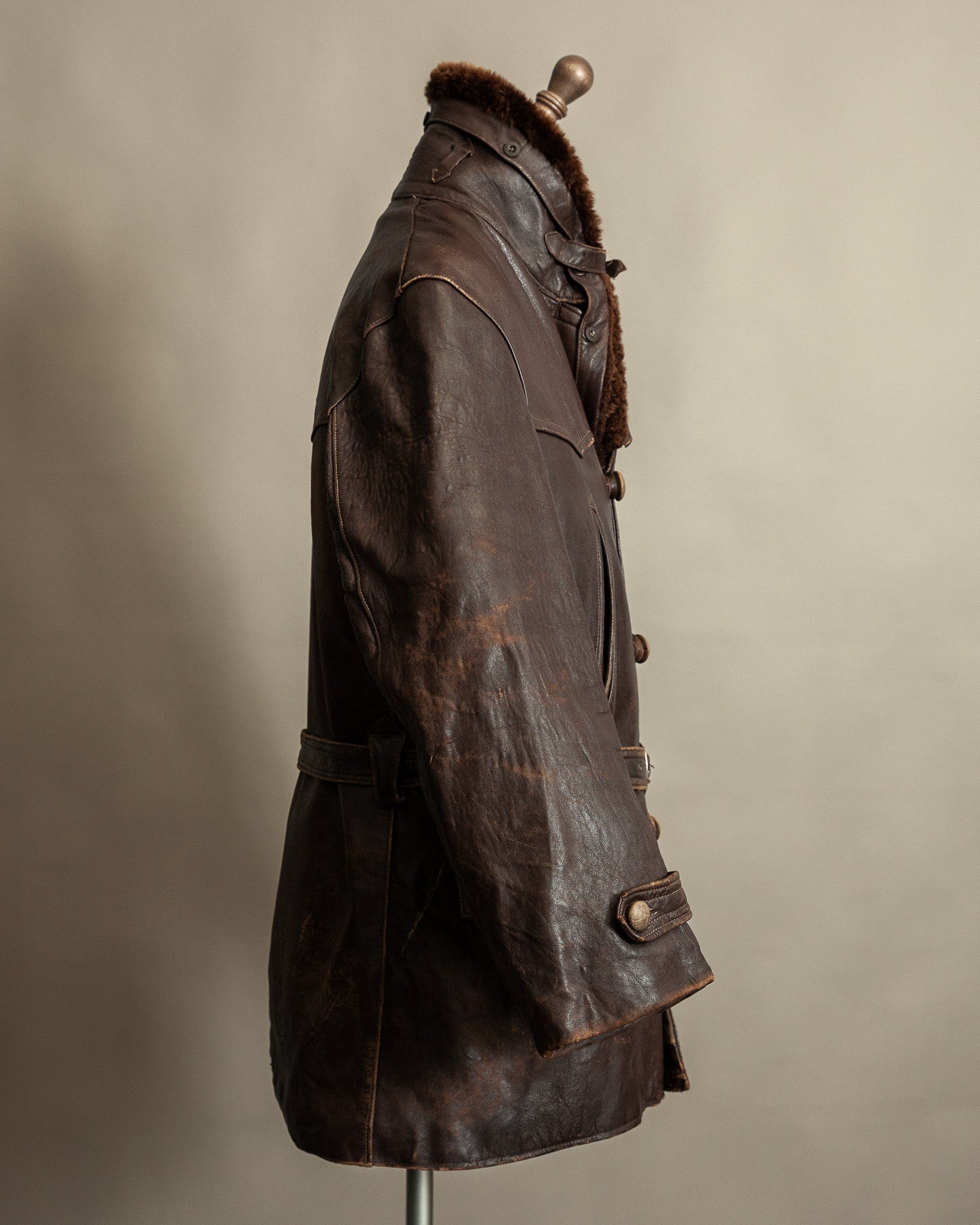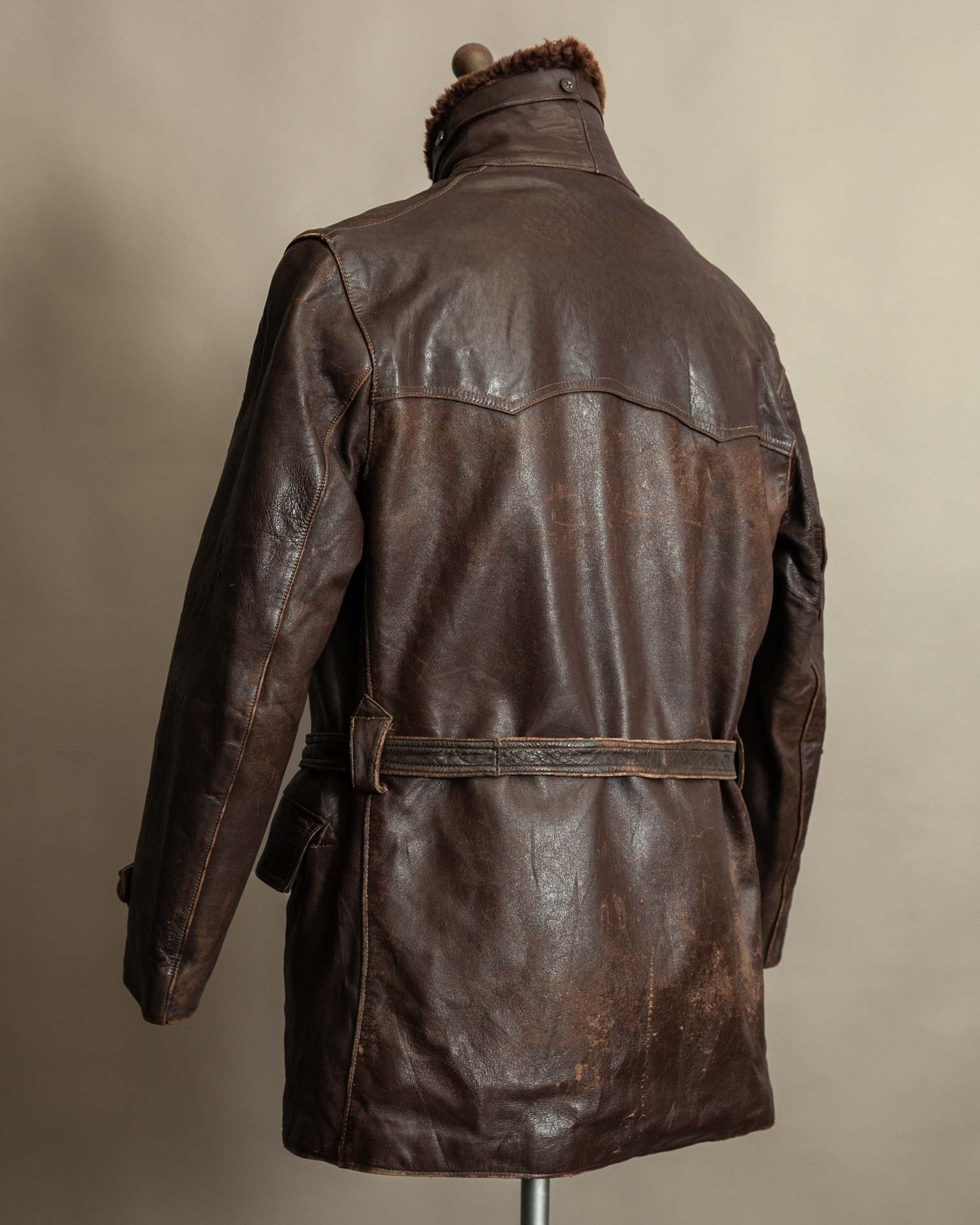 Condition is good for its age. The leather shows visible wear and patina in exposed areas but remains strong and stable. The belt shows deterioration consistent with long term use but continues to function as intended. The collar is full and well preserved. Stitching throughout the coat remains secure, and all buttons, fastenings, and adjustment points are intact and working.