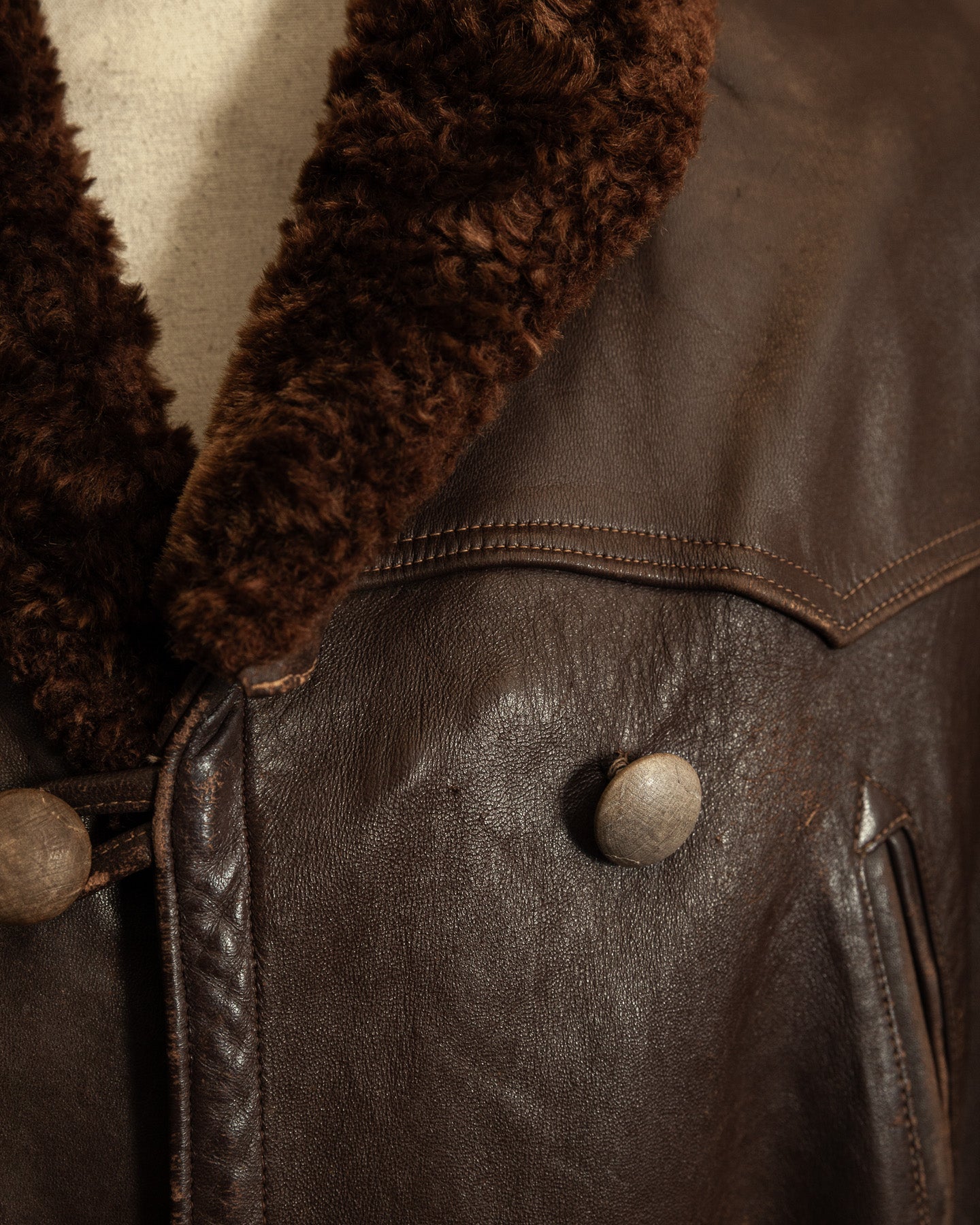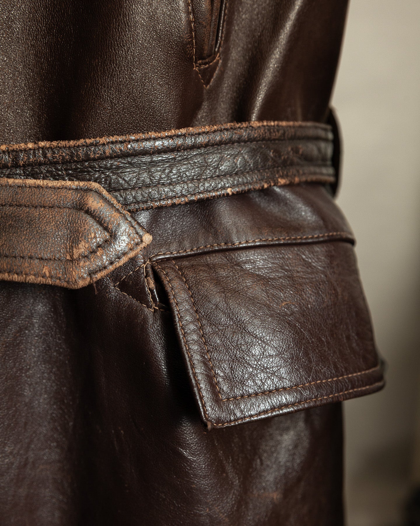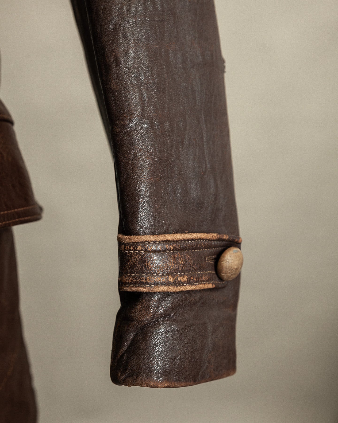 The leather carries a deep, uneven patina that has developed naturally over time. Surface wear is most noticeable across the lower front panels and along the arms, where the coat would have taken the brunt of daily use. These areas show scuffing and abrasion consistent with age, but the hide remains sound, holding its structure and weight without brittleness or weakness.