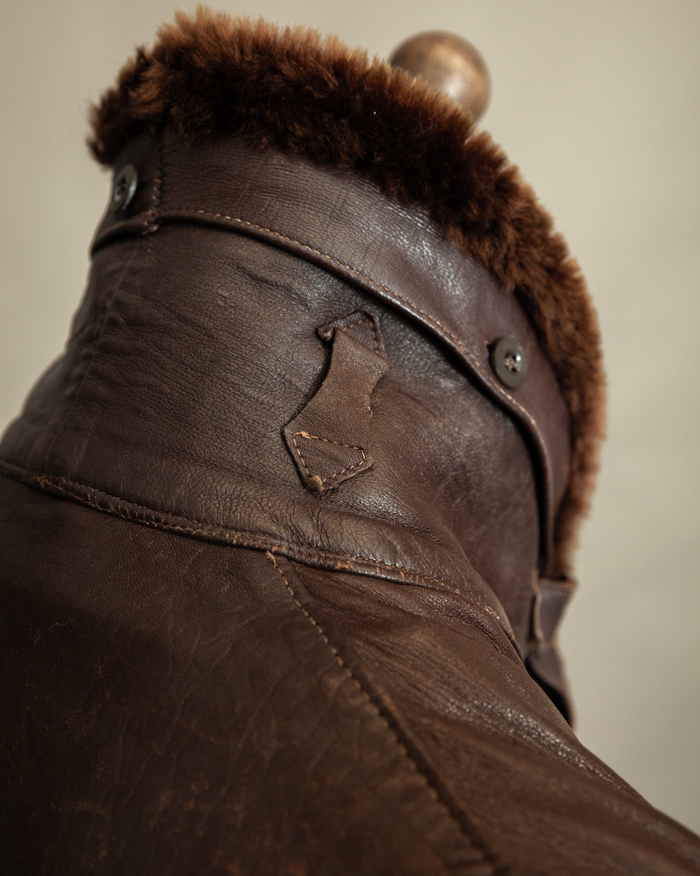 The coat fastens with its original wooden buttons, a clear period detail associated with wartime and immediate post war production. Their survival adds to the coat’s credibility and sense of age. At the neck, a working throat latch allows the collar to be secured closed. The collar itself is full and dense, retaining good volume and sitting comfortably whether worn open or fastened.