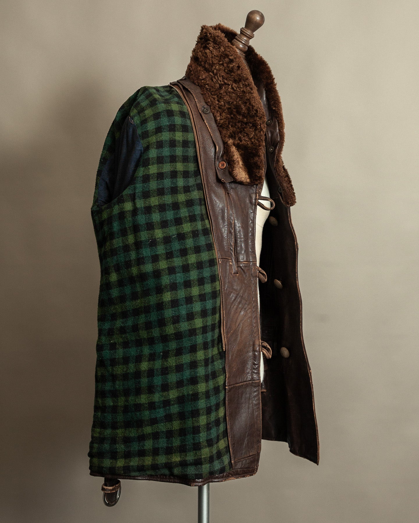 This French leather Canadienne barnstormer coat dates to the 1940s, a time when coats like this were made to be relied upon rather than styled. These were practical garments, worn in exposed conditions by motorists, outdoor workers, and civilians who spent long hours in wind and cold. They were designed to be adjusted, closed down, and lived in.