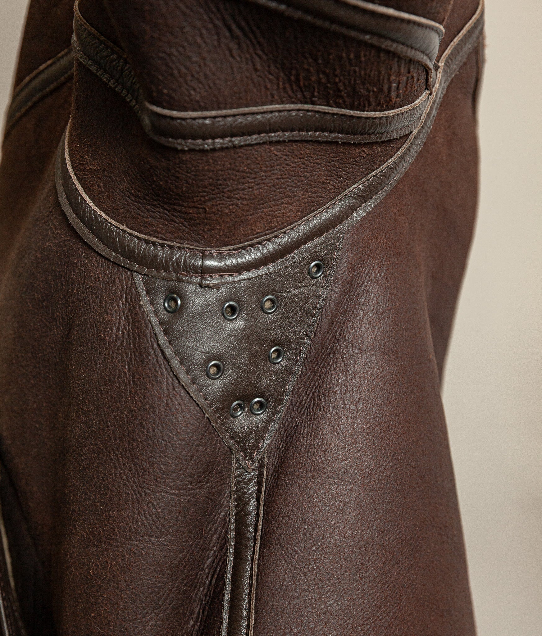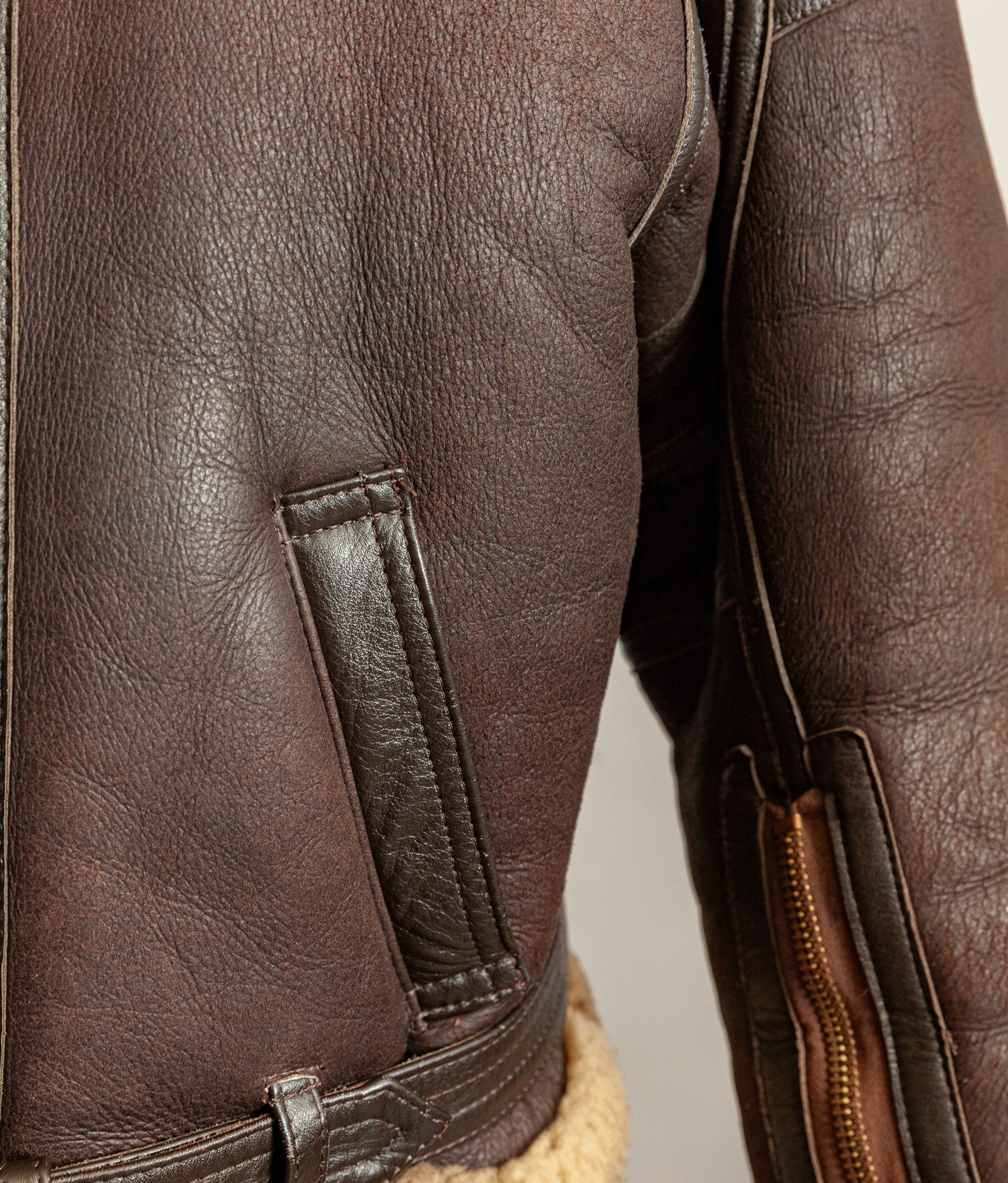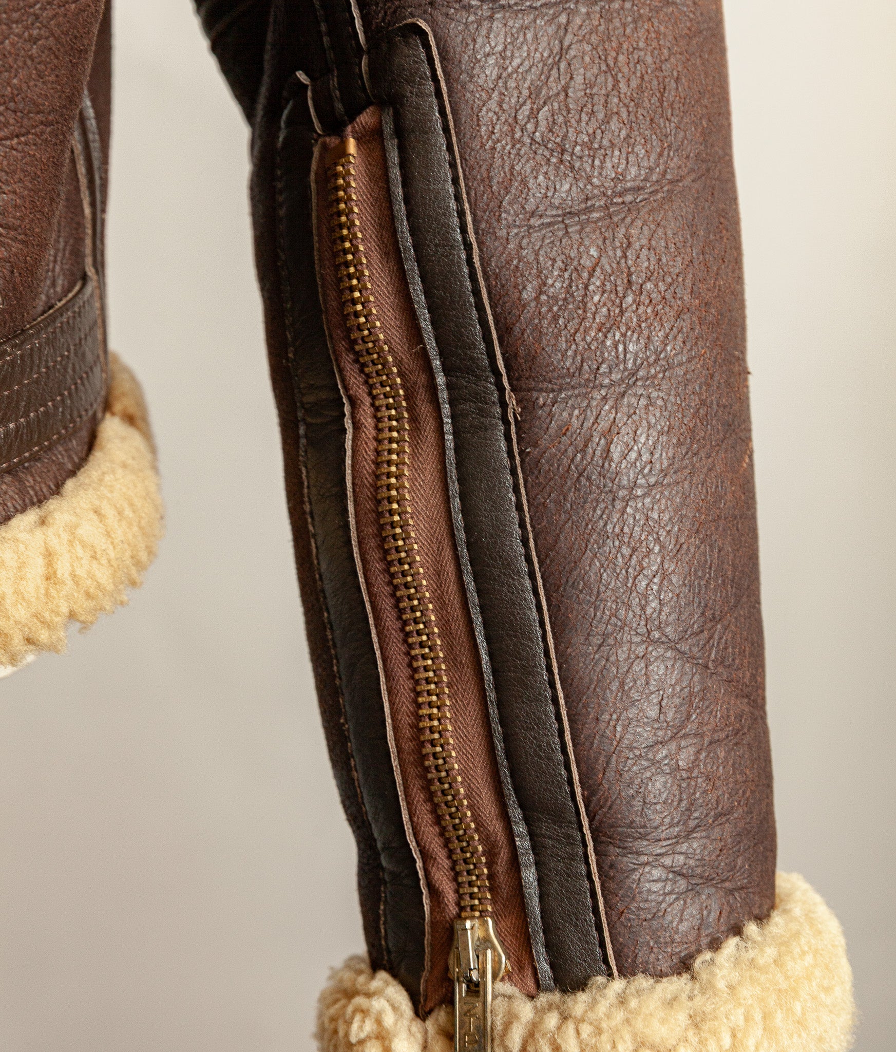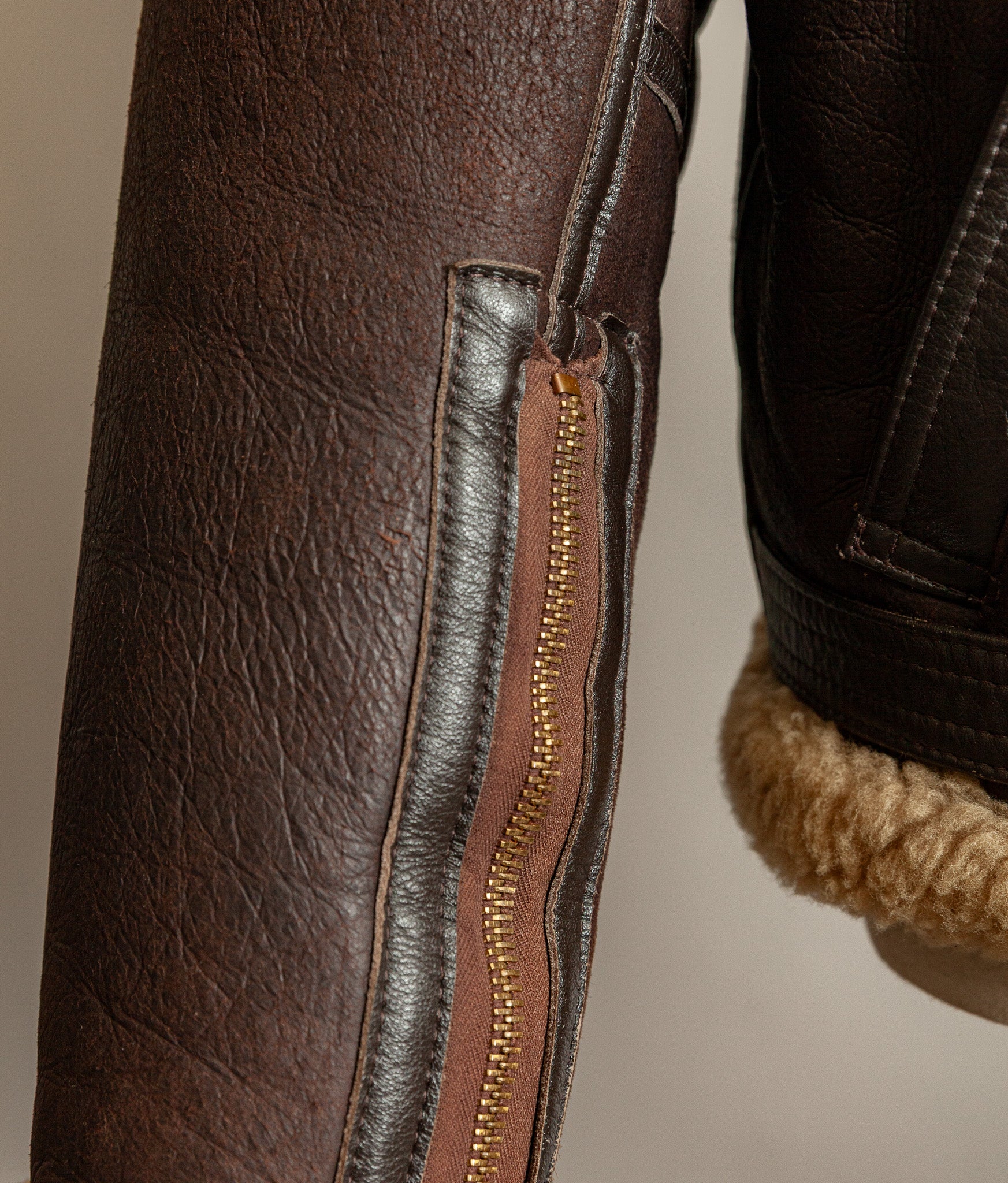 The exterior leather shows a deep, honest patina that has developed beautifully over time: textured, rugged, and full of natural tonal variation across the panels. Inside, the heavy honey-gold fleece delivers formidable insulation, with the dense pile and structure you only find on serious sheepskin from this period. The design follows the classic Irvin cues, high protective collar, long sleeve zips, reinforced seam binding, wide waist belt, and clean, functional pocketing, all rendered here with a solidity that immediately sets it apart from lighter modern reproductions.
