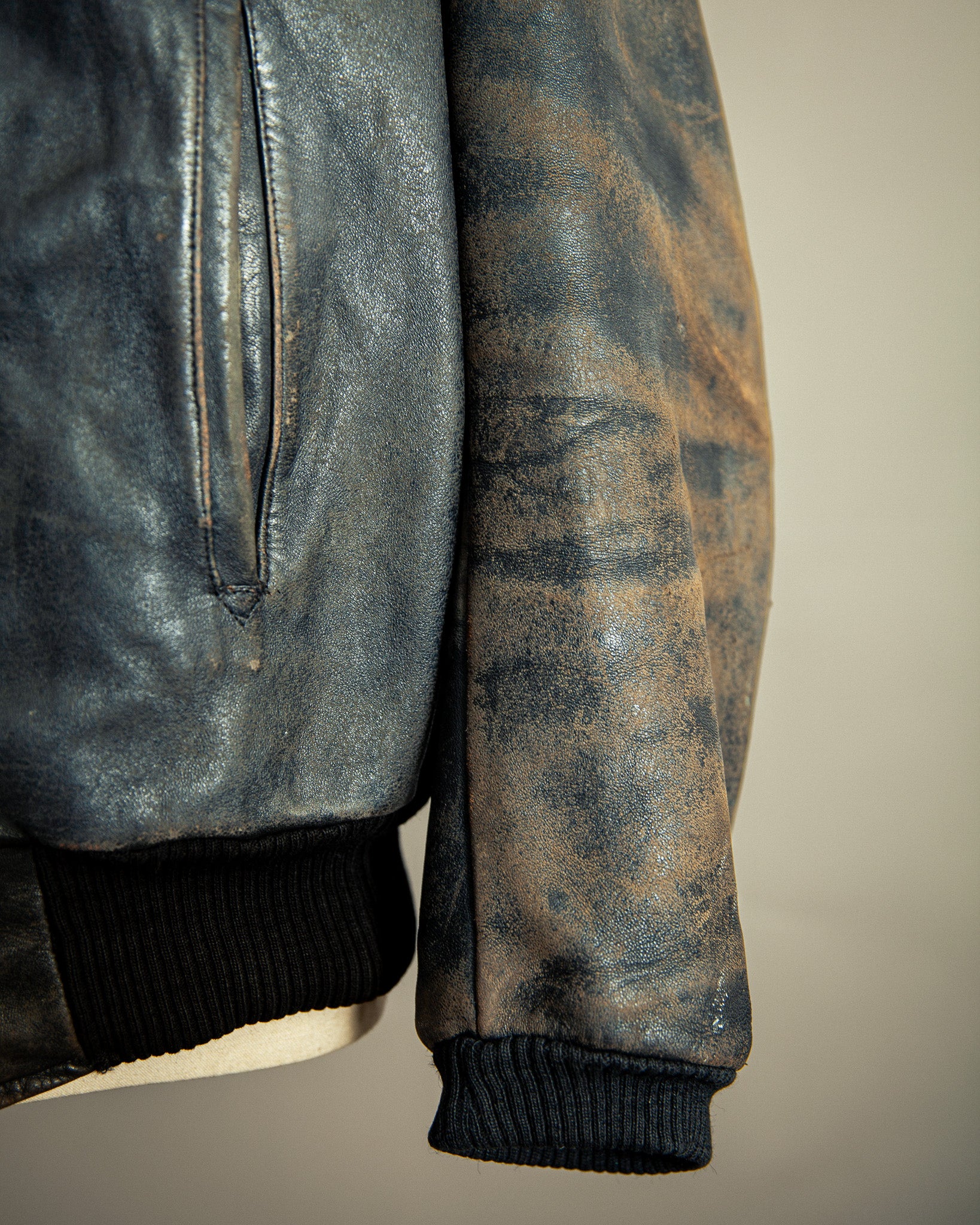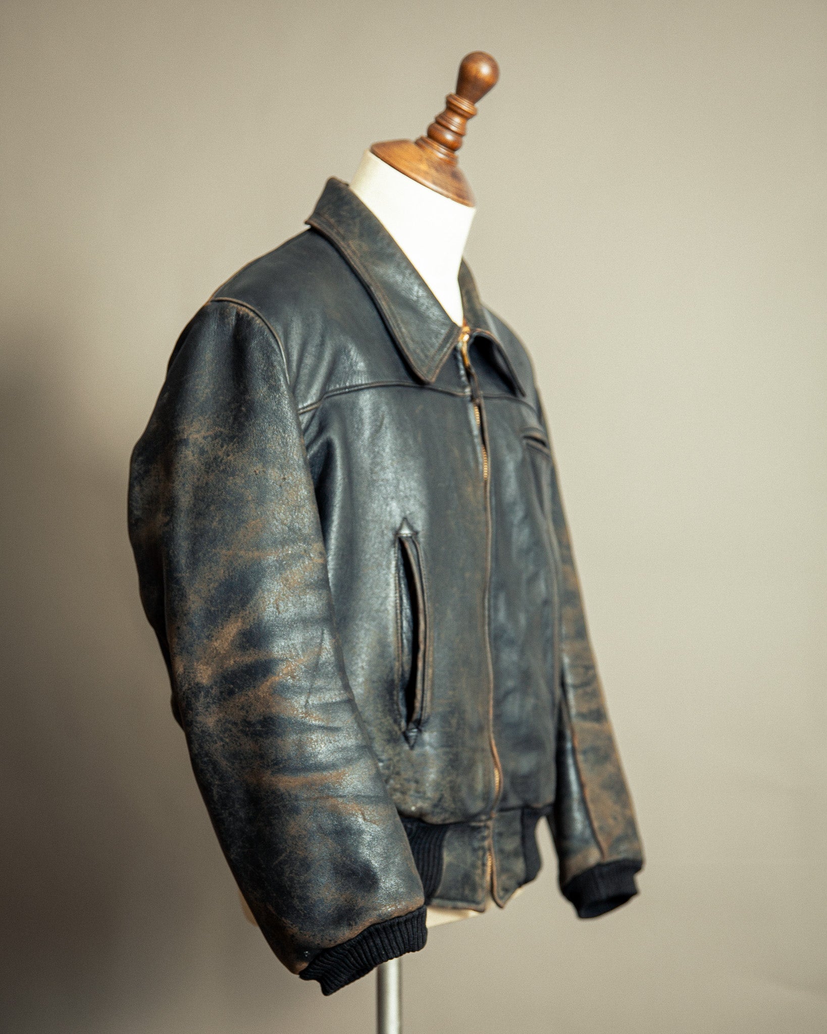 This piece has been professionally cleaned and conditioned to restore suppleness and preserve its longevity. The surface wear, creases, and scuffs add to its rugged beauty, presenting a jacket that is both collectible and eminently wearable.