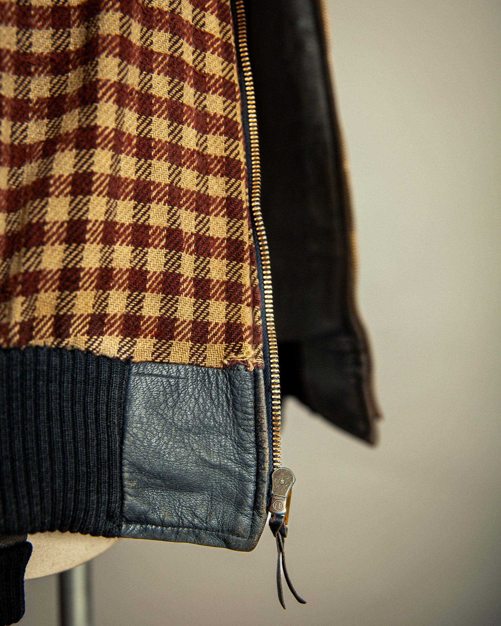 Cut from sturdy blackened leather, the jacket has developed a striking patina over time, with variations in tone that highlight the natural grain of the hide. A sharp collar, welted chest pocket, and two front hand-warmer pockets define its design, while ribbed cuffs and waistband ensure a close, protective fit. Inside, a red-and-cream checked wool lining captures the unmistakable French character of the period, balancing warmth with visual flair. The original Eclair zips remain intact — a hallmark of French manufacture that underlines its authenticity.