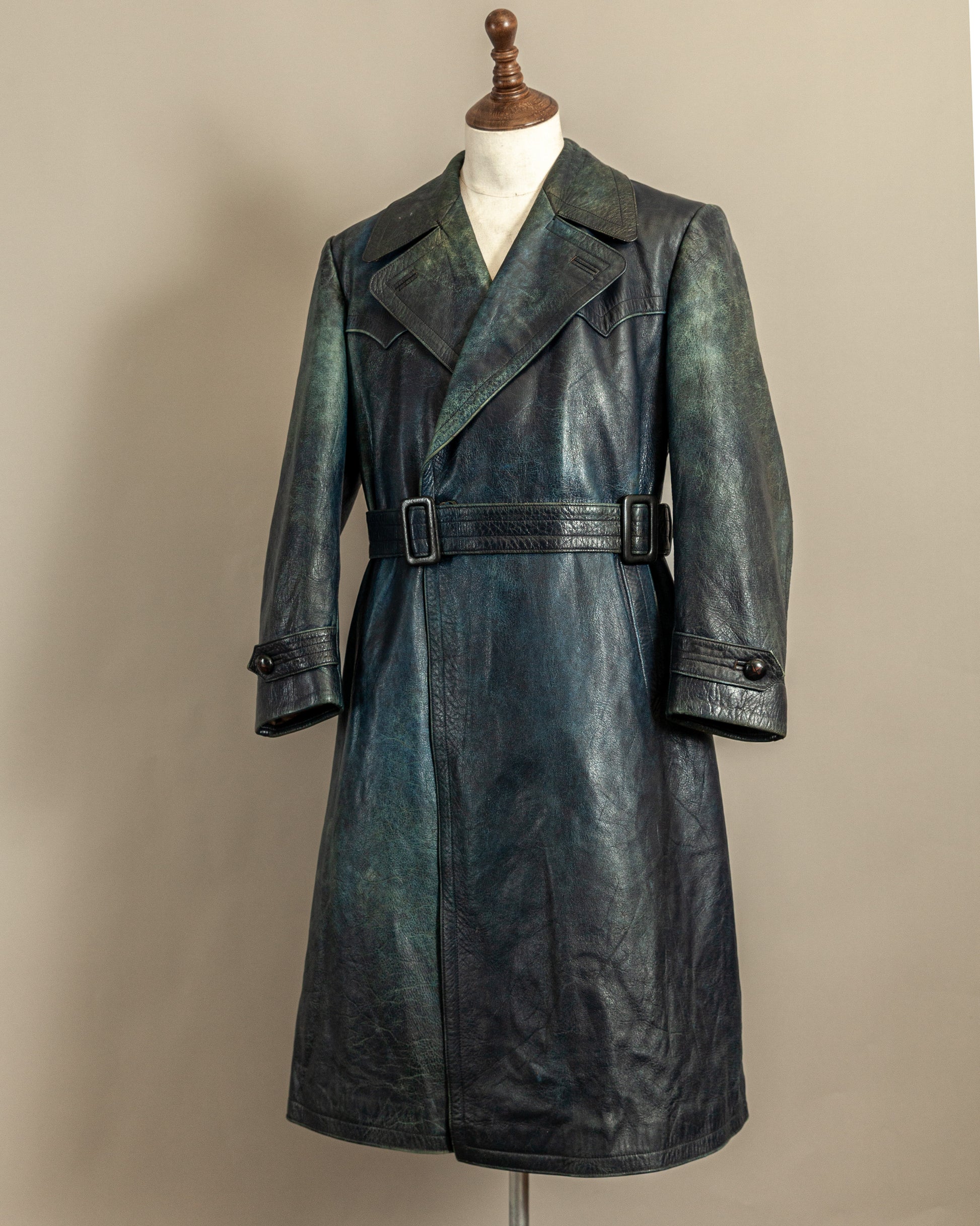 Built in the early to mid 1940s, this goatskin trench coat sits firmly within the tradition of privately purchased leather overcoats favoured by Wehrmacht and Luftwaffe officers. These commissioned pieces offered a level of protection, durability and refinement far beyond standard issue wool greatcoats, and were chosen by officers who needed a serious weatherproof garment that still maintained a commanding silhouette. The Ledermantel form, broad lapels and shaped chest yoke align closely with documented wartime officer purchases made outside the government supply system.