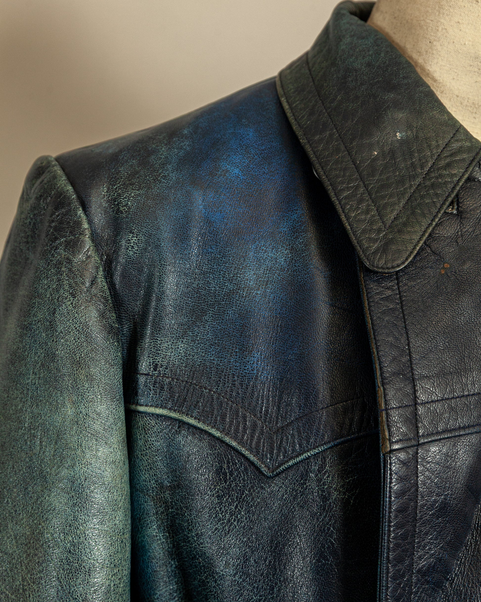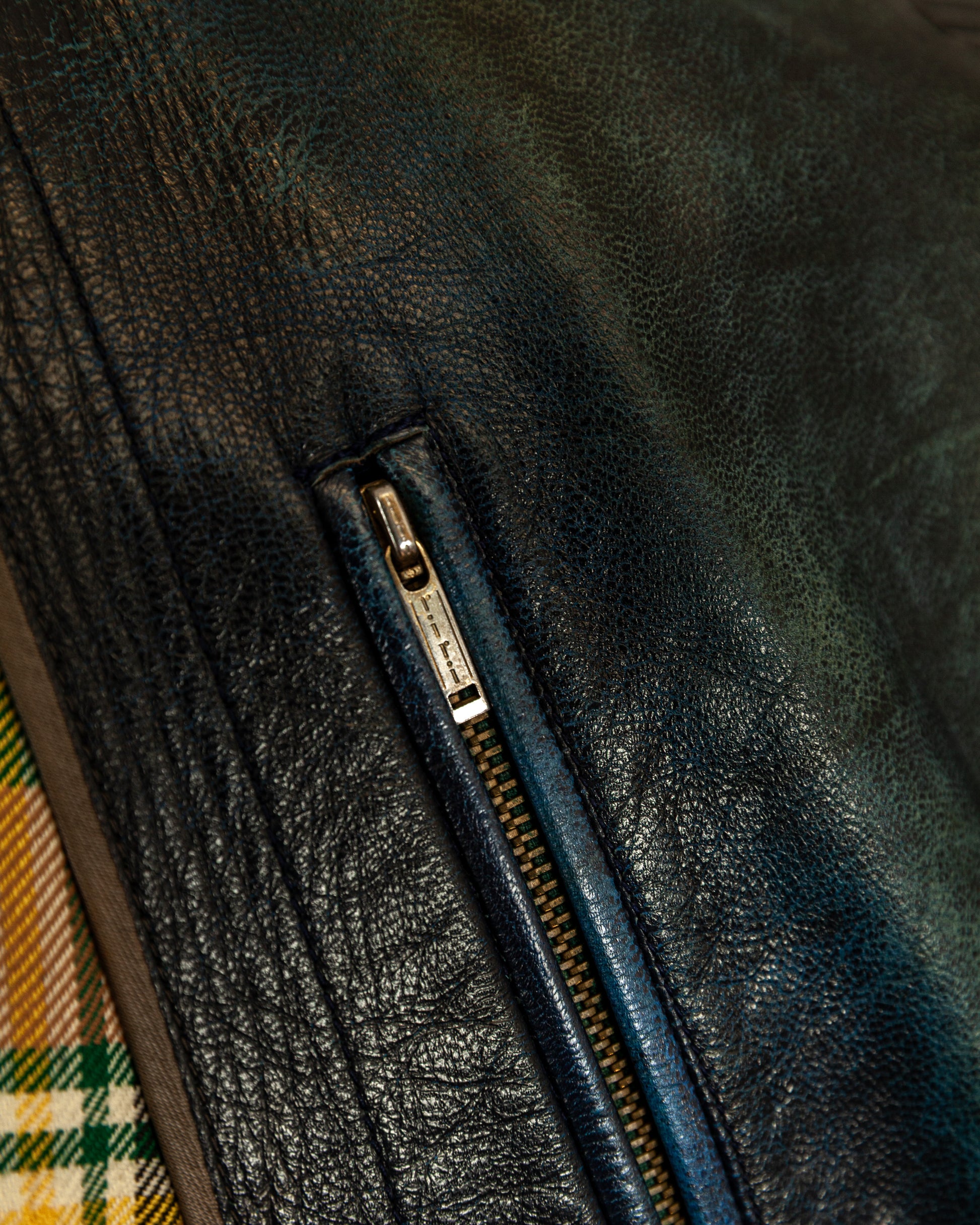 The goatskin is full grain and of the quality associated with officer-grade garments of the period. Naturally matured over eight decades, it carries a deep patina with shifting tones of midnight, petrol and green, the result of early aniline dye processes. The hide is lighter and more flexible than horsehide examples from the same era, yet retains excellent structural integrity. The sleeves have softened through long wear, while the body holds a confident shape with organic grain, creasing and tonal variation that reflect the uncorrected finish of genuine wartime goatskin.