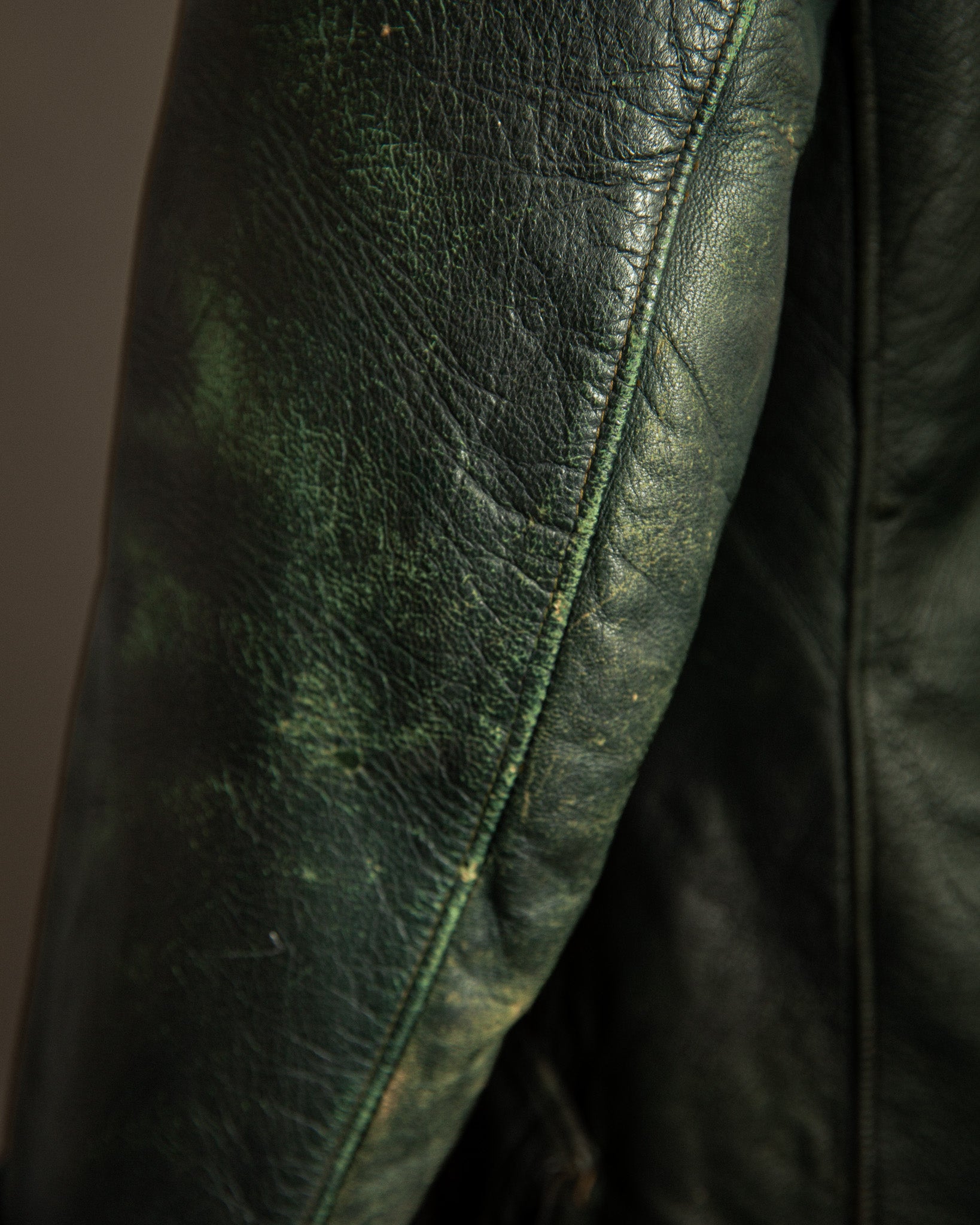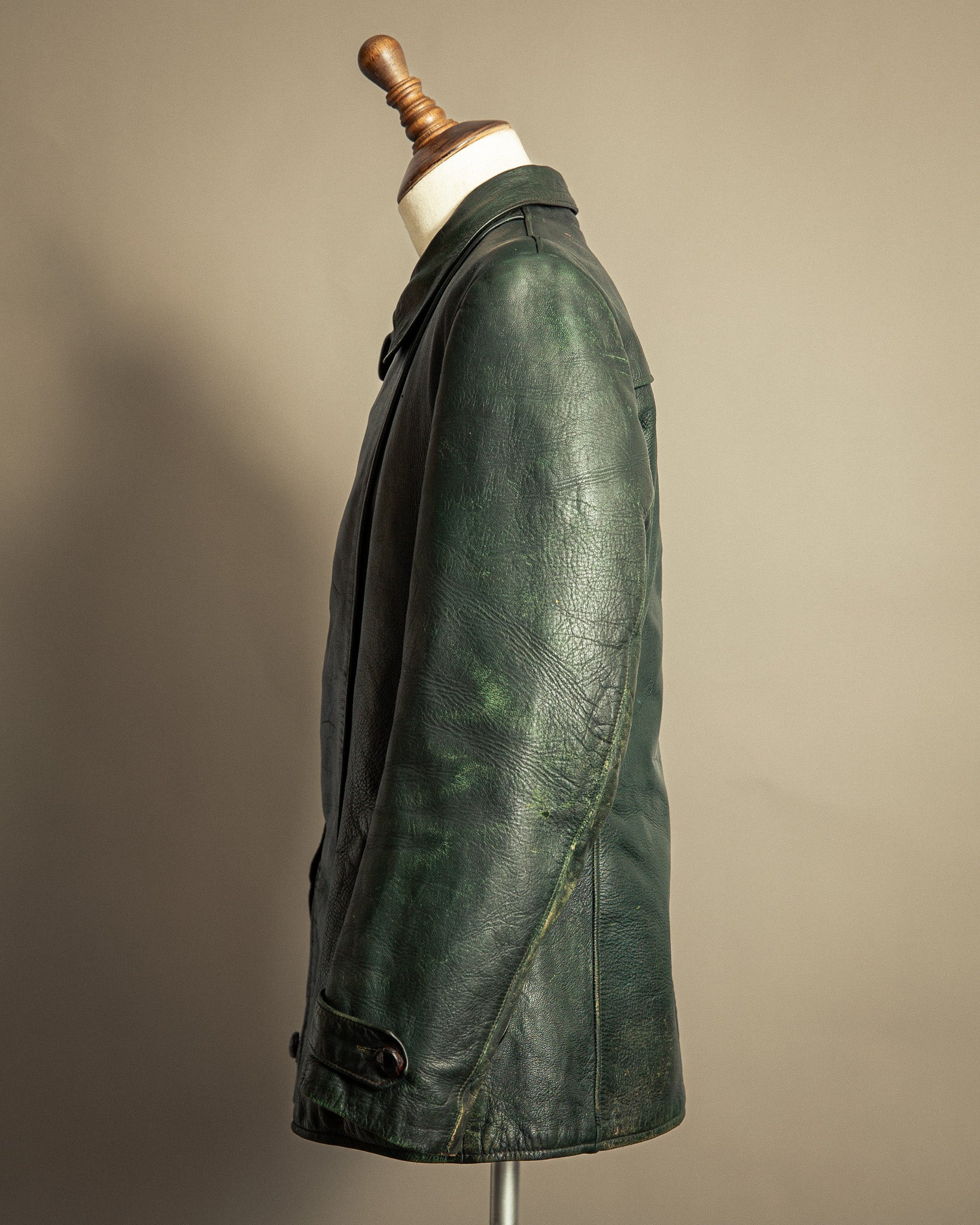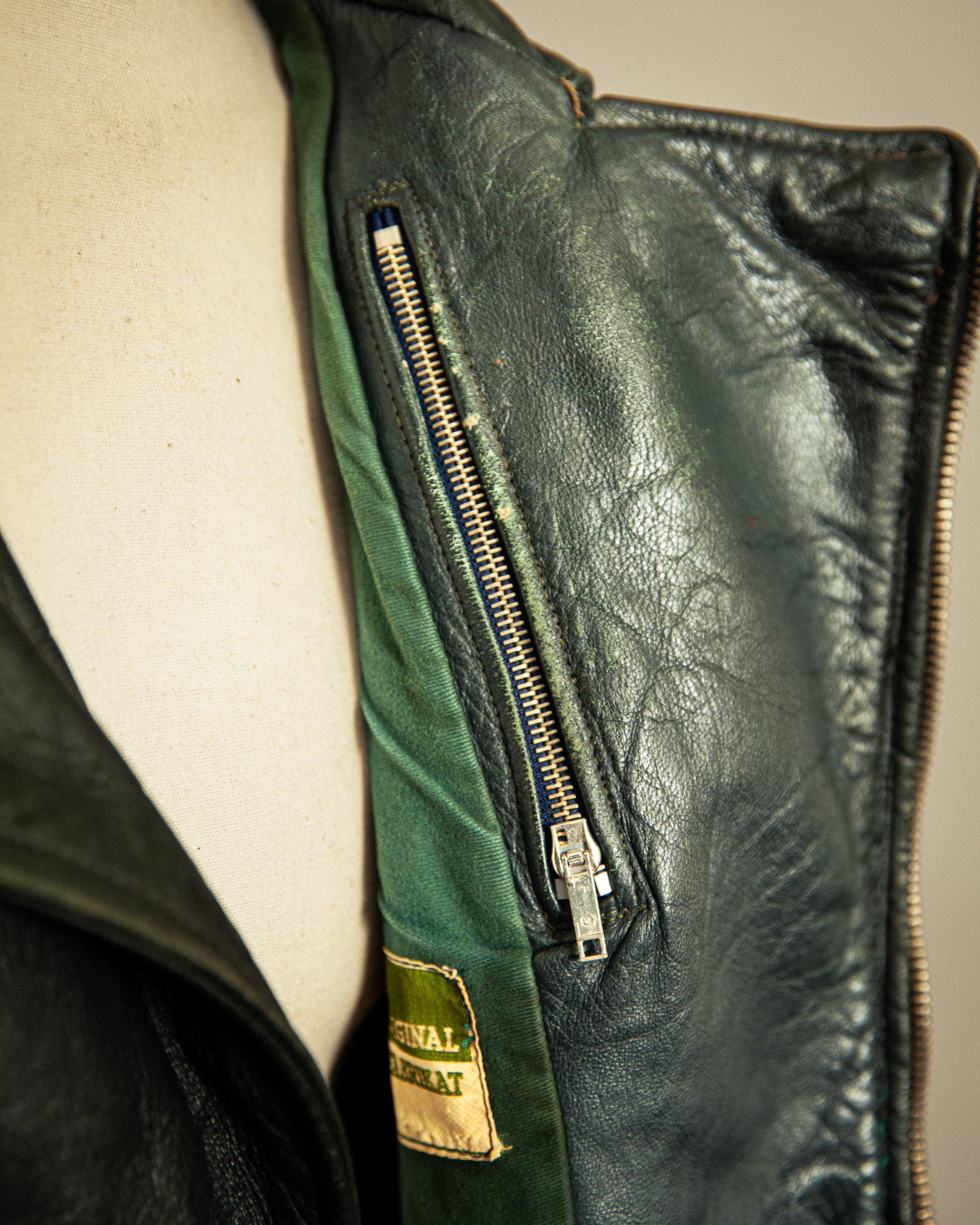 The goatskin has developed a deep patina, with visible abrasions, light nicks, and surface wear that speak to decades of life. Unlike heavier horsehide, the goatskin retains a supple drape, its tight grain showing rich tonal shifts across the surface. Inside, the green cotton lining remains intact and solid, with expected signs of age but no rips or tears. Metal hardware includes original Opti zippers, widely used in German garments from the mid-20th century, all in smooth working order.