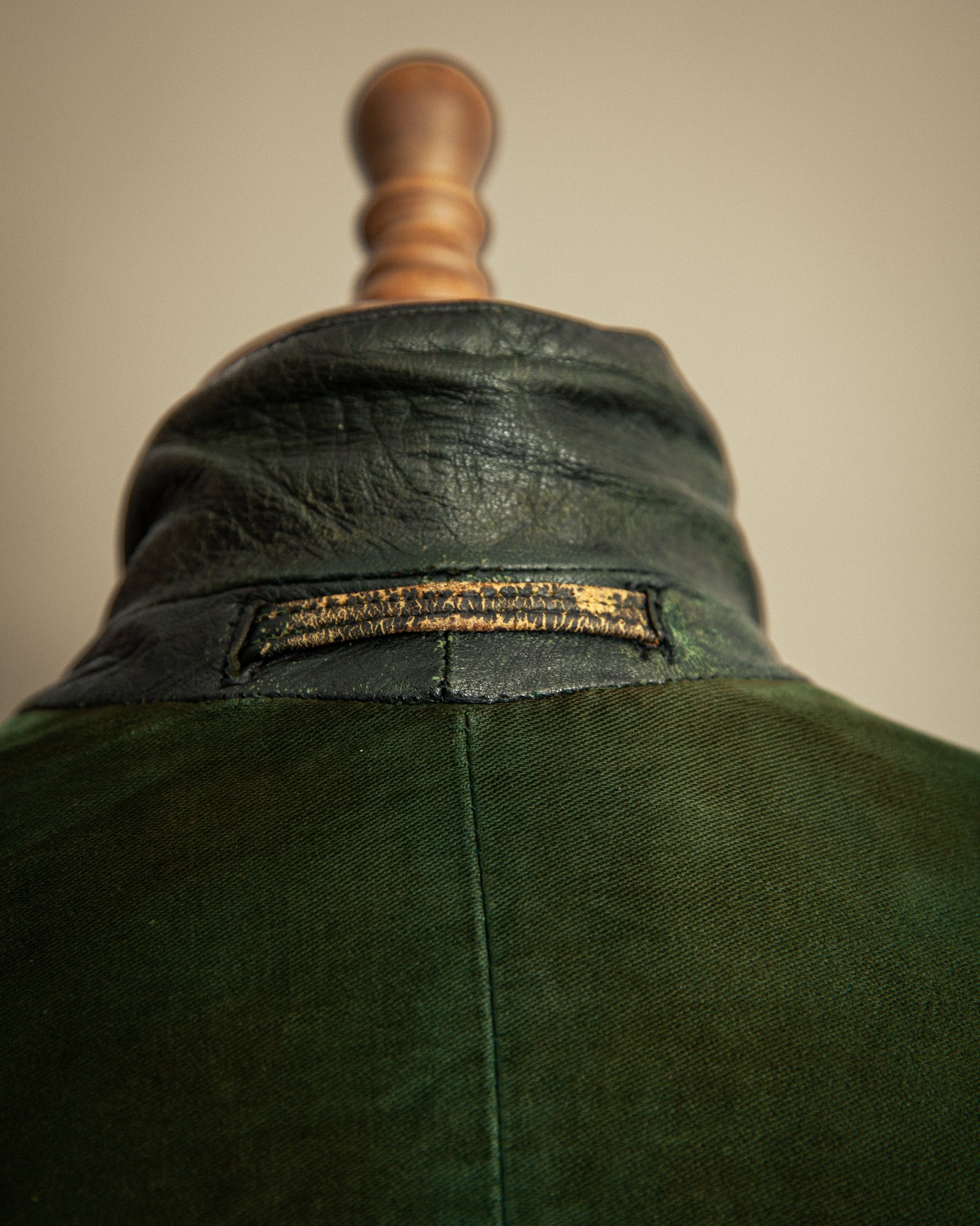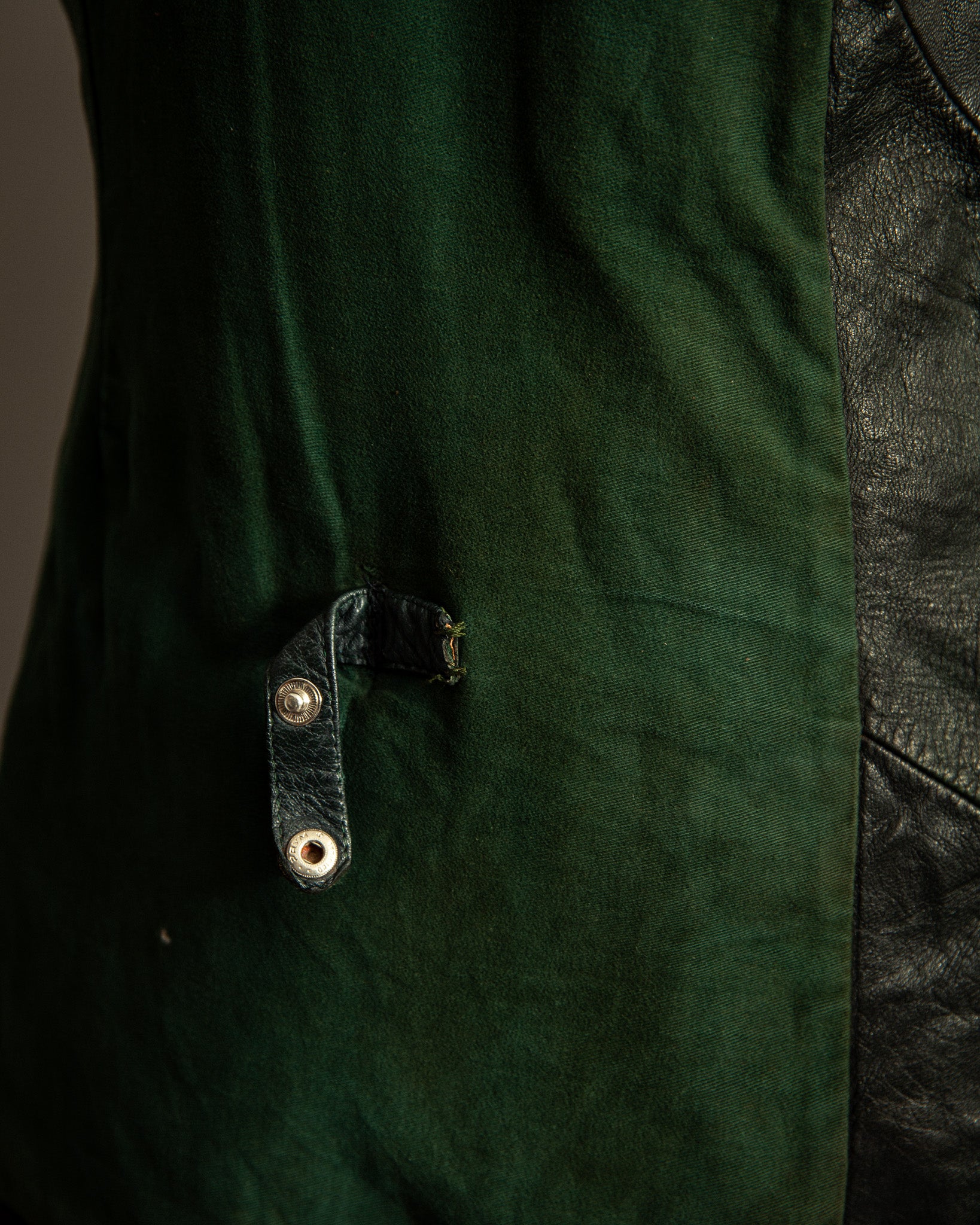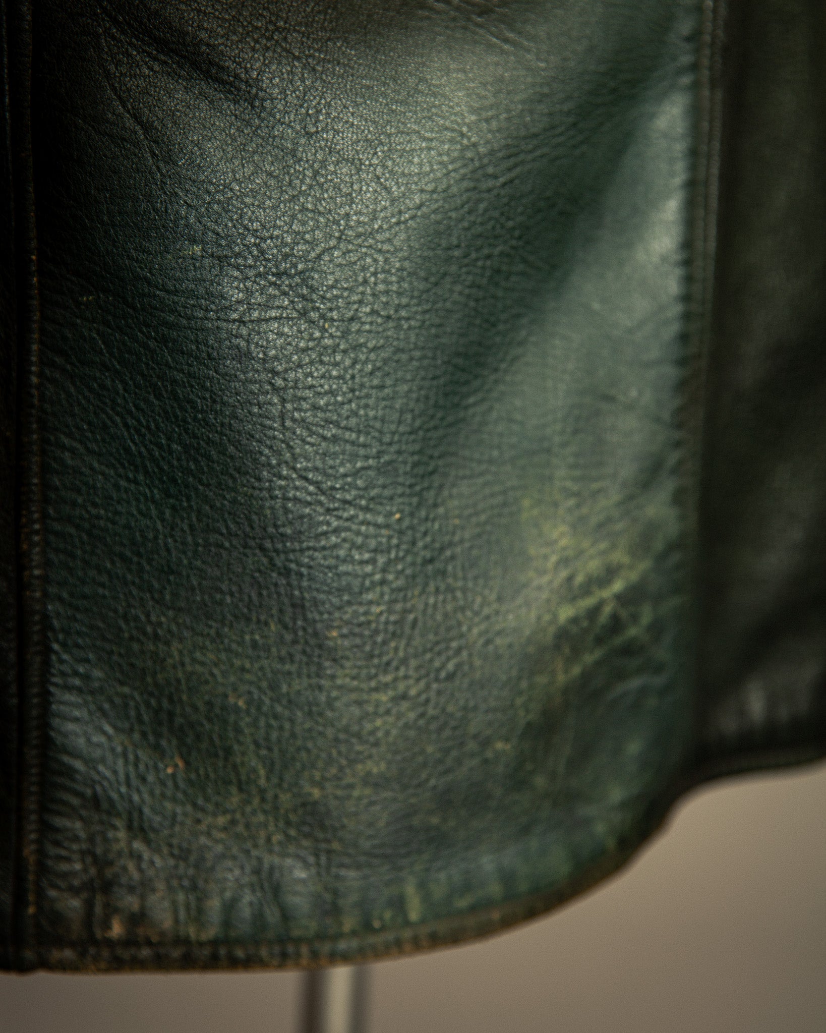 The goatskin has developed a deep patina, with visible abrasions, light nicks, and surface wear that speak to decades of life. Unlike heavier horsehide, the goatskin retains a supple drape, its tight grain showing rich tonal shifts across the surface. Inside, the green cotton lining remains intact and solid, with expected signs of age but no rips or tears. Metal hardware includes original Opti zippers, widely used in German garments from the mid-20th century, all in smooth working order.
