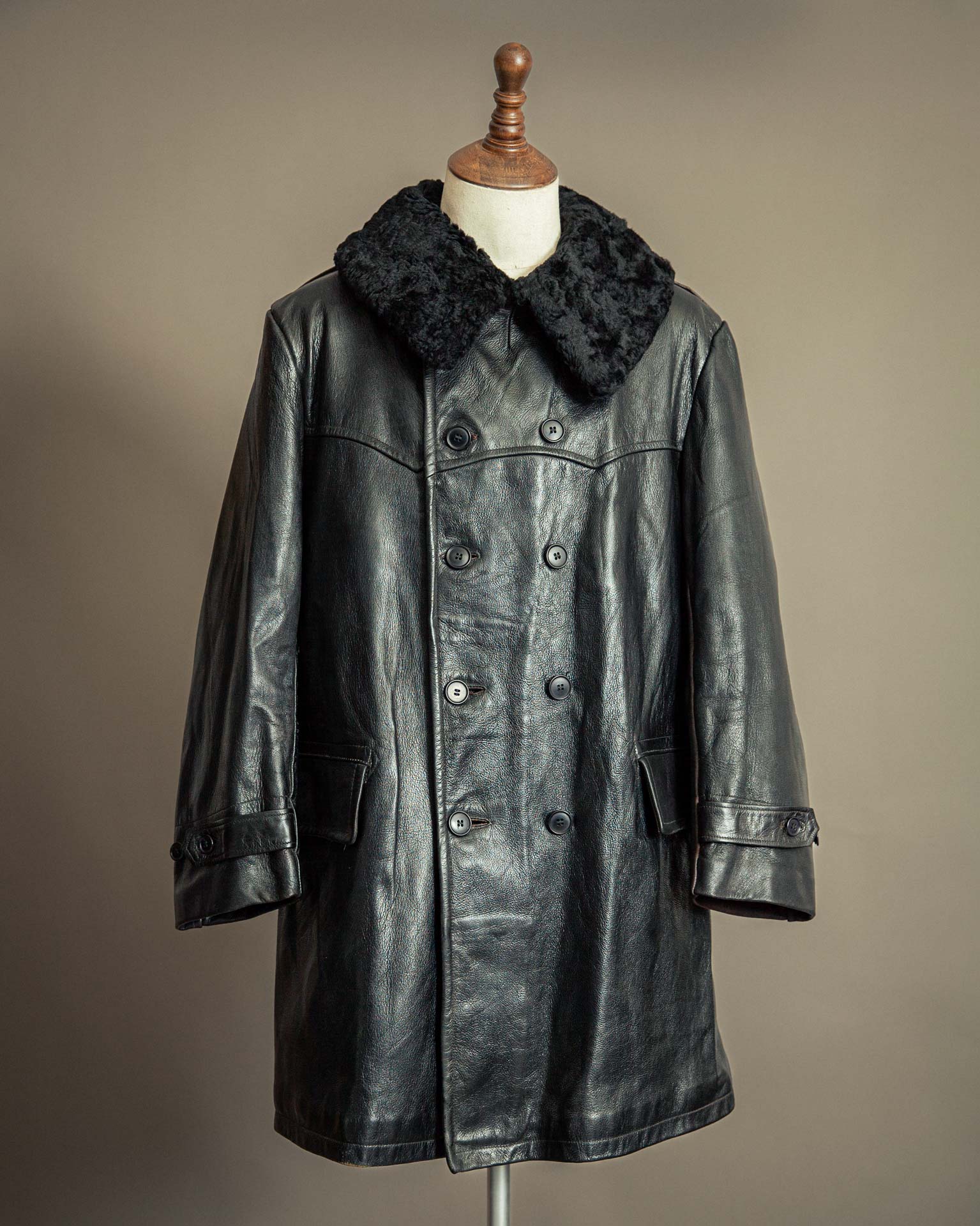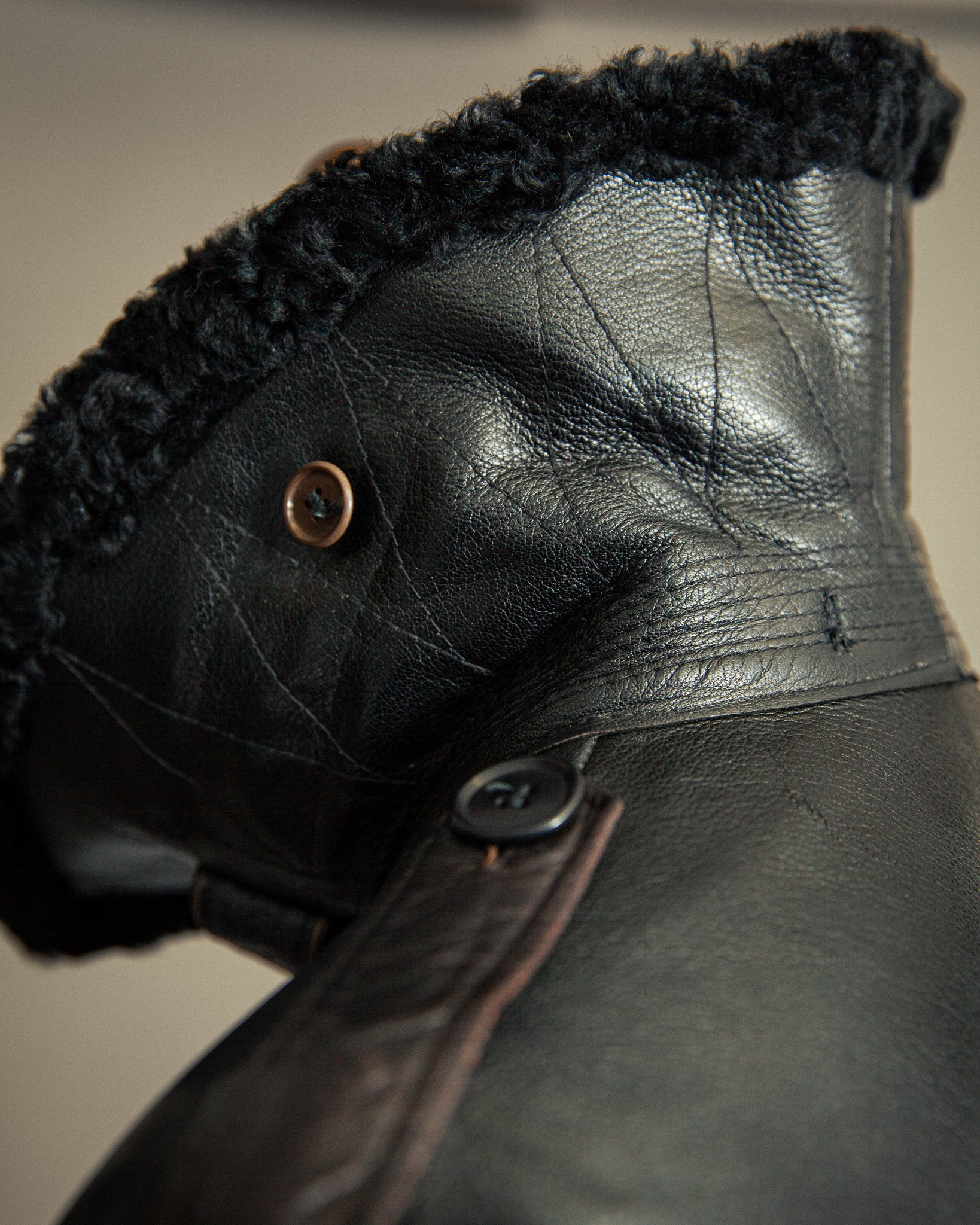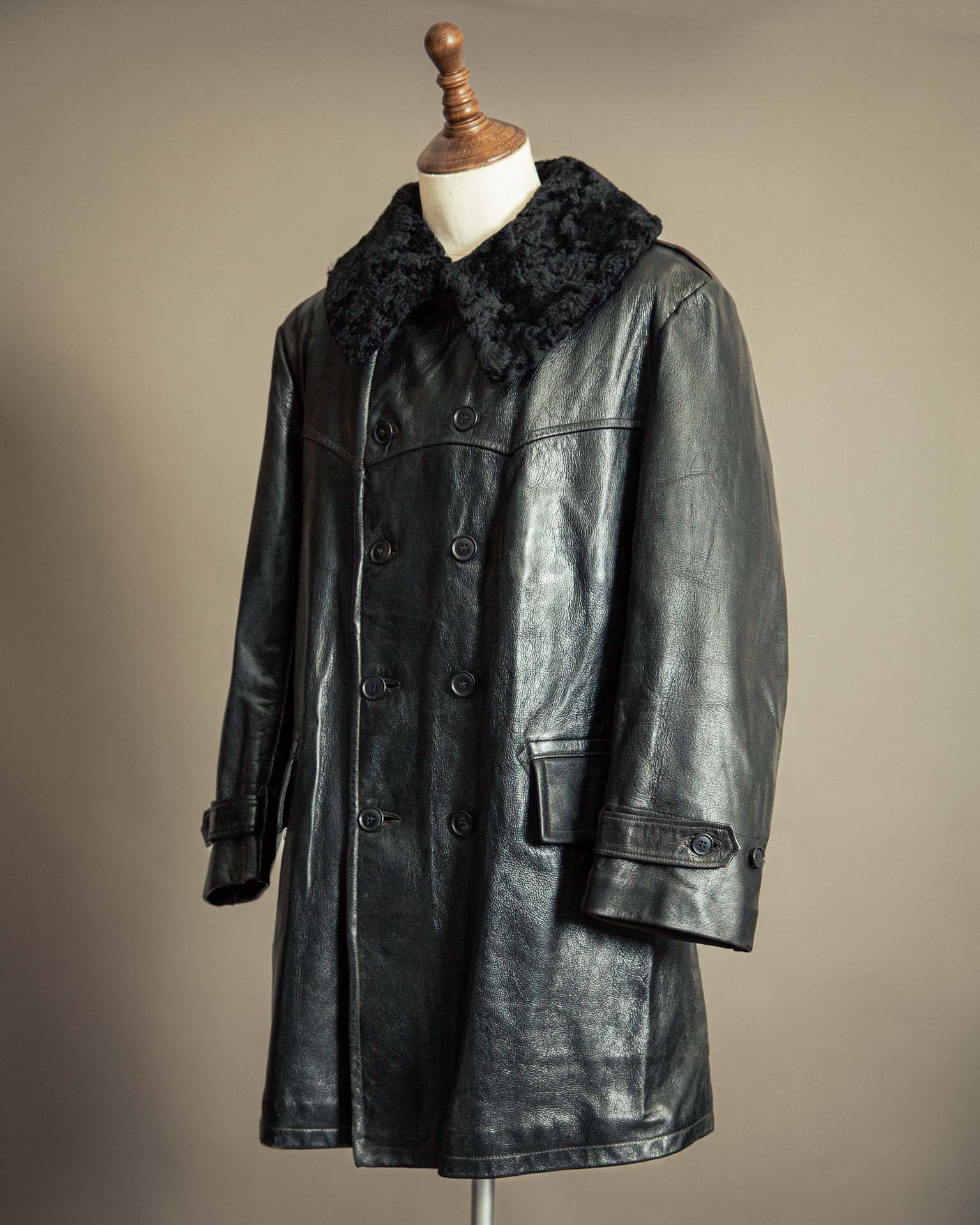 Cut from heavyweight full-grain goatskin, the coat exhibits the fine, pebbled grain and rich natural sheen characteristic of the Malung tanning tradition — a hallmark of Sweden’s leather industry during the wartime period. The hide is strong yet supple, carrying substantial weight while maintaining an elegant drape. A full sheepskin collar crowns the design, providing warmth, contrast, and unmistakable period authenticity. The long double-breasted cut, reinforced seams, and structured shoulders embody the functional elegance of 1940s officer tailoring.