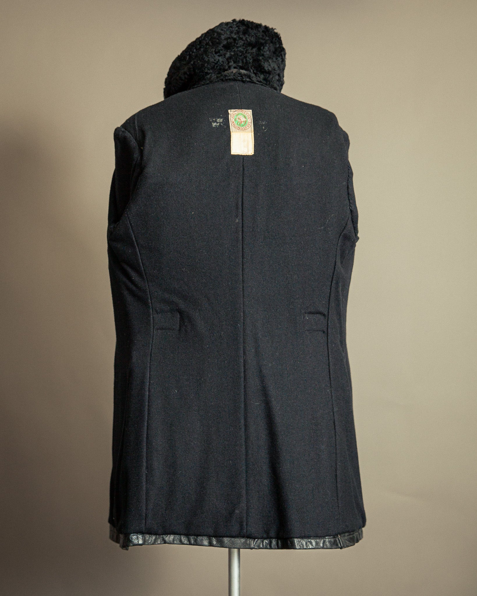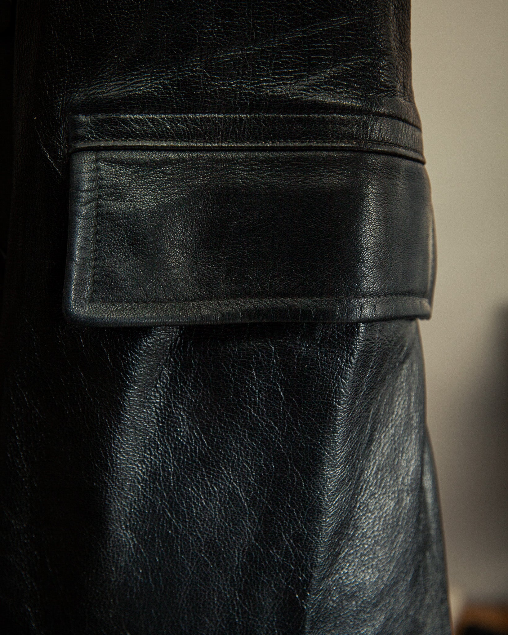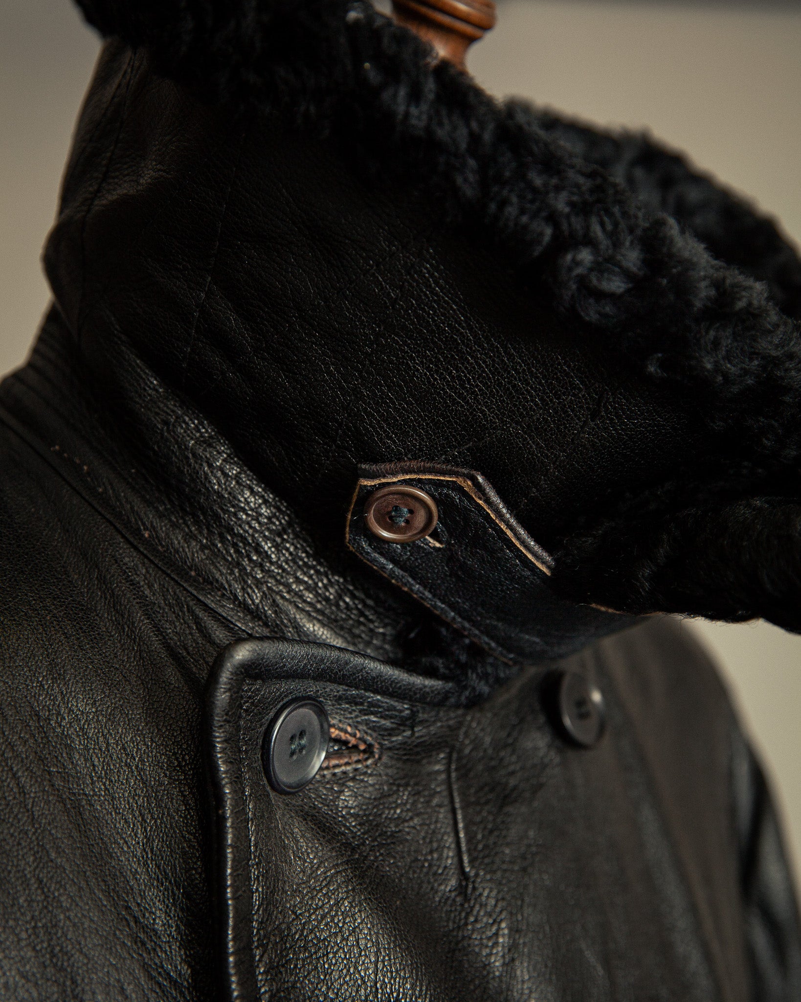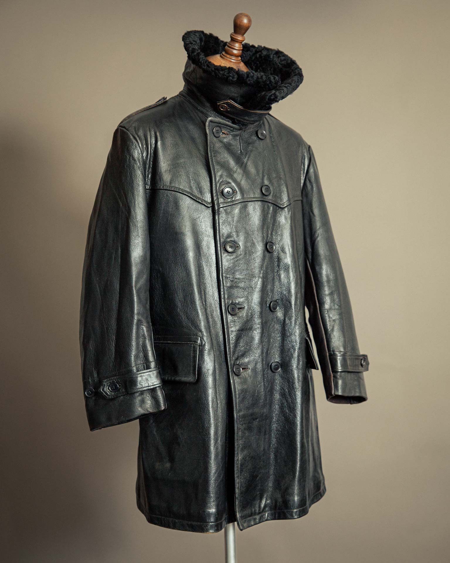 Cut from heavyweight full-grain goatskin, the coat exhibits the fine, pebbled grain and rich natural sheen characteristic of the Malung tanning tradition — a hallmark of Sweden’s leather industry during the wartime period. The hide is strong yet supple, carrying substantial weight while maintaining an elegant drape. A full sheepskin collar crowns the design, providing warmth, contrast, and unmistakable period authenticity. The long double-breasted cut, reinforced seams, and structured shoulders embody the functional elegance of 1940s officer tailoring.