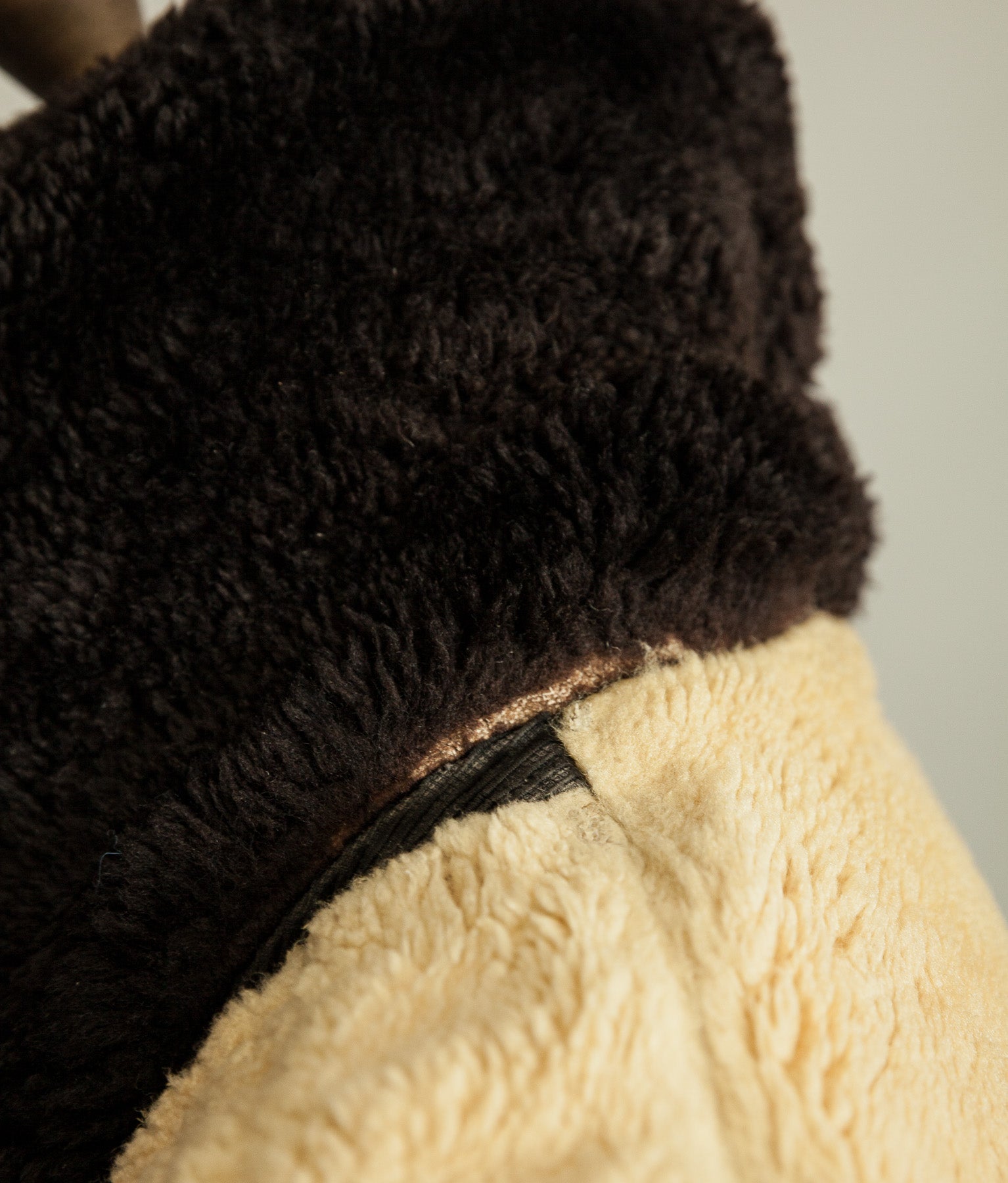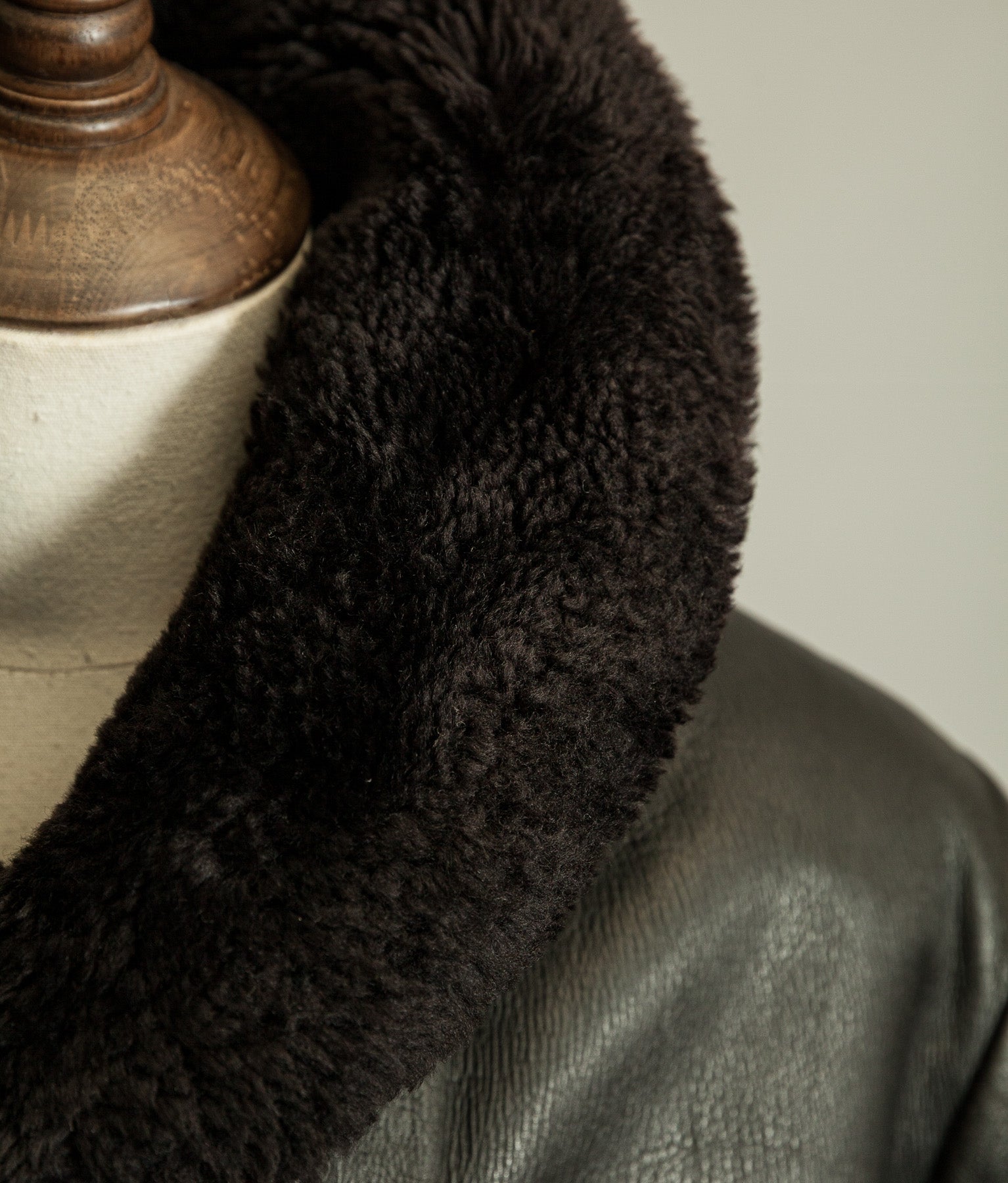 Internally, the coat is lined in genuine sheepskin, providing substantial insulation for prolonged winter duty. The sleeves are finished in blue lining to allow smooth movement over uniform layers. Leather reinforcement panels are fitted at the underarms to prevent seam fatigue during extended wear. Wide corduroy facings run along the hem and front opening, protecting the lining and reducing friction at high wear points. The collar is also genuine sheepskin, completing the heavy winter specification.