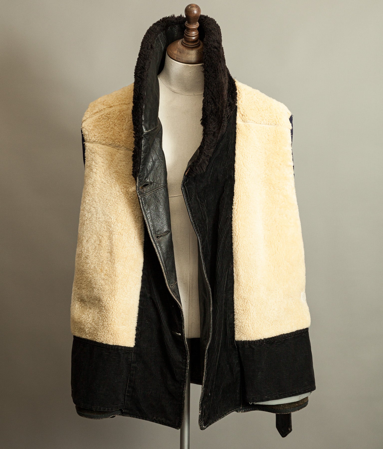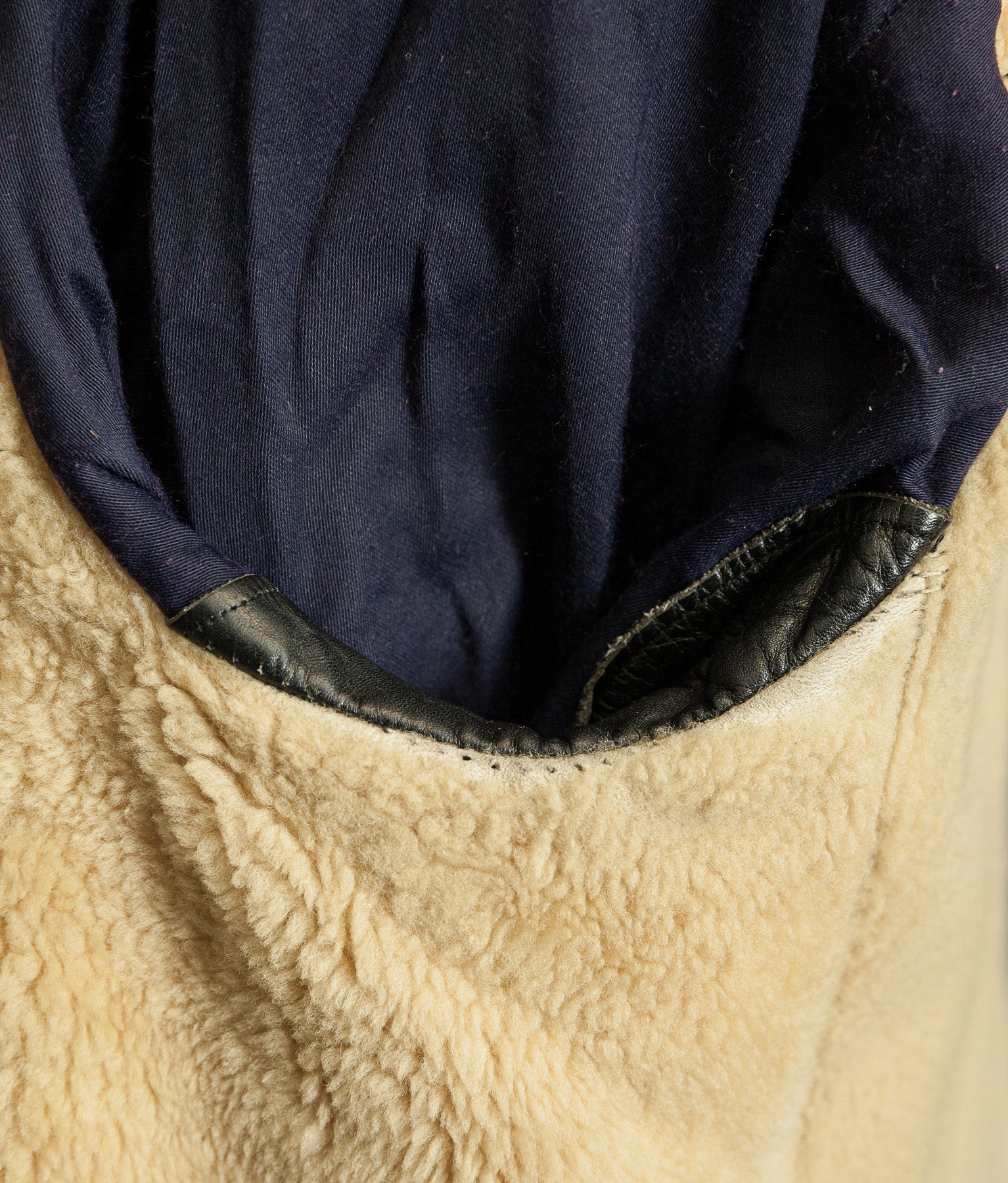 The reinforced badge mount has been left undisturbed as part of the coat’s authentic service history. Stitching remains secure throughout. The sheepskin lining remains present and serviceable, showing age appropriate wear without structural compromise. The blue sleeve lining is intact. Underarm reinforcement panels remain sound, and the corduroy facings show light wear but remain complete.