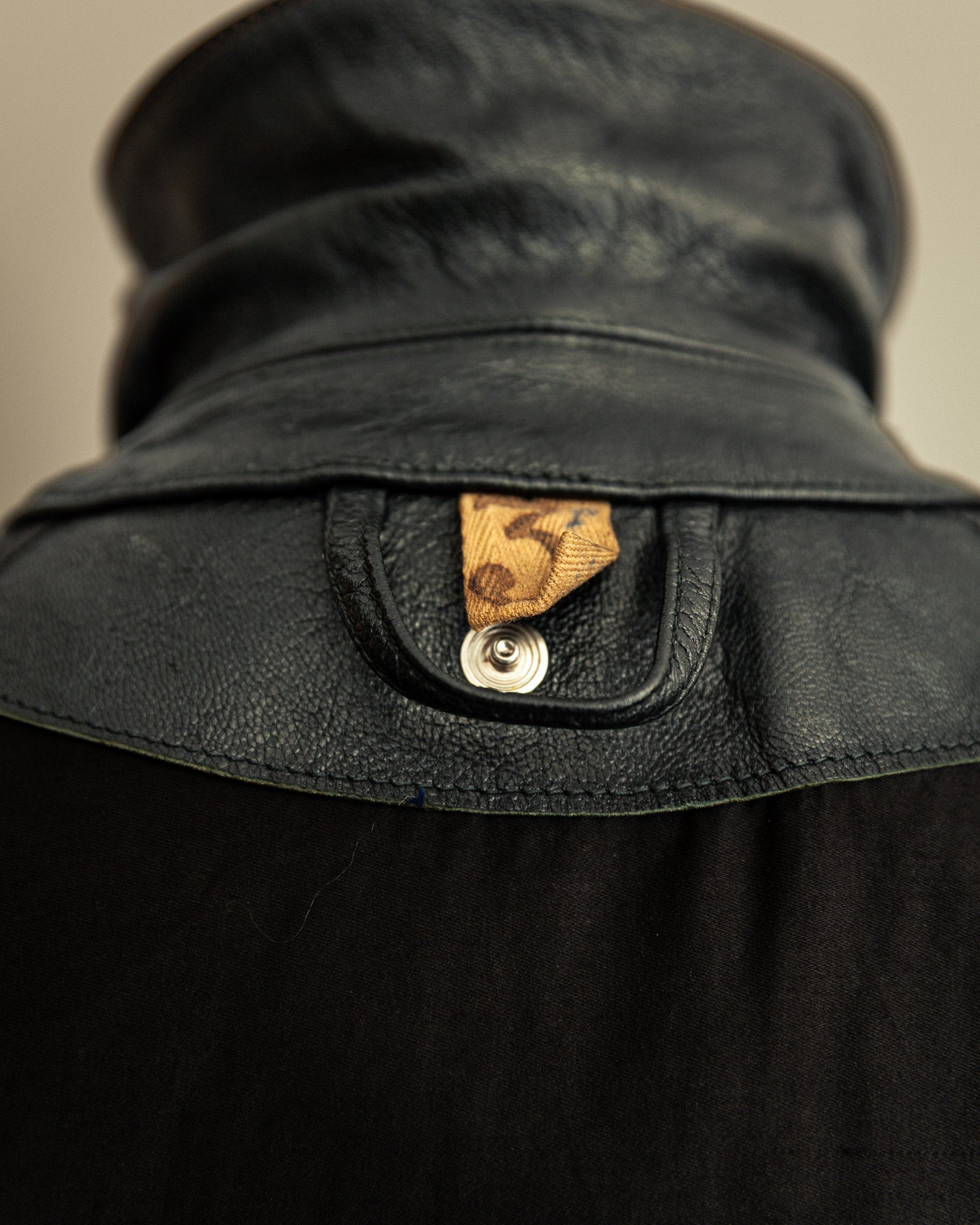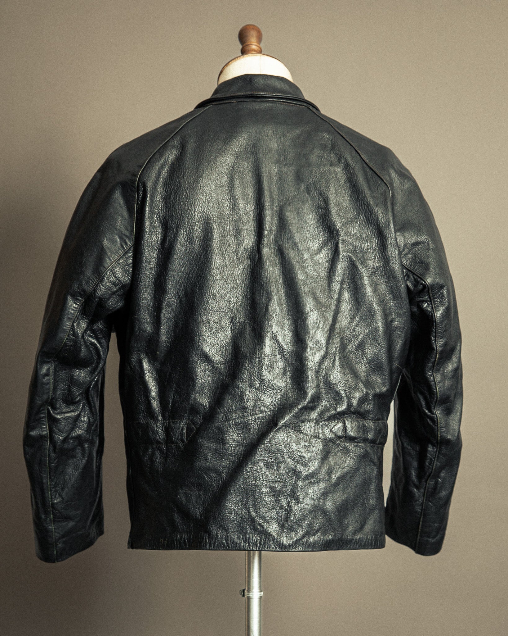 Crafted from supple yet durable goatskin, the jacket has developed a rich depth of character that only decades of life can create. The grain is tight, the surface smooth, and the patina reveals subtle shifts in tone — testament to the quality hides chosen by French military suppliers of the period. Its two oversized chest pockets, straight-cut front with Talon zipper, and neat point collar embody the pragmatic style of French utility tailoring, while the silhouette retains a sharp military bearing.