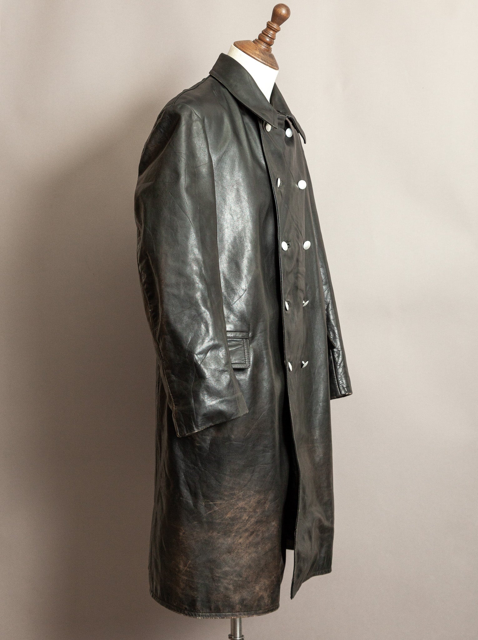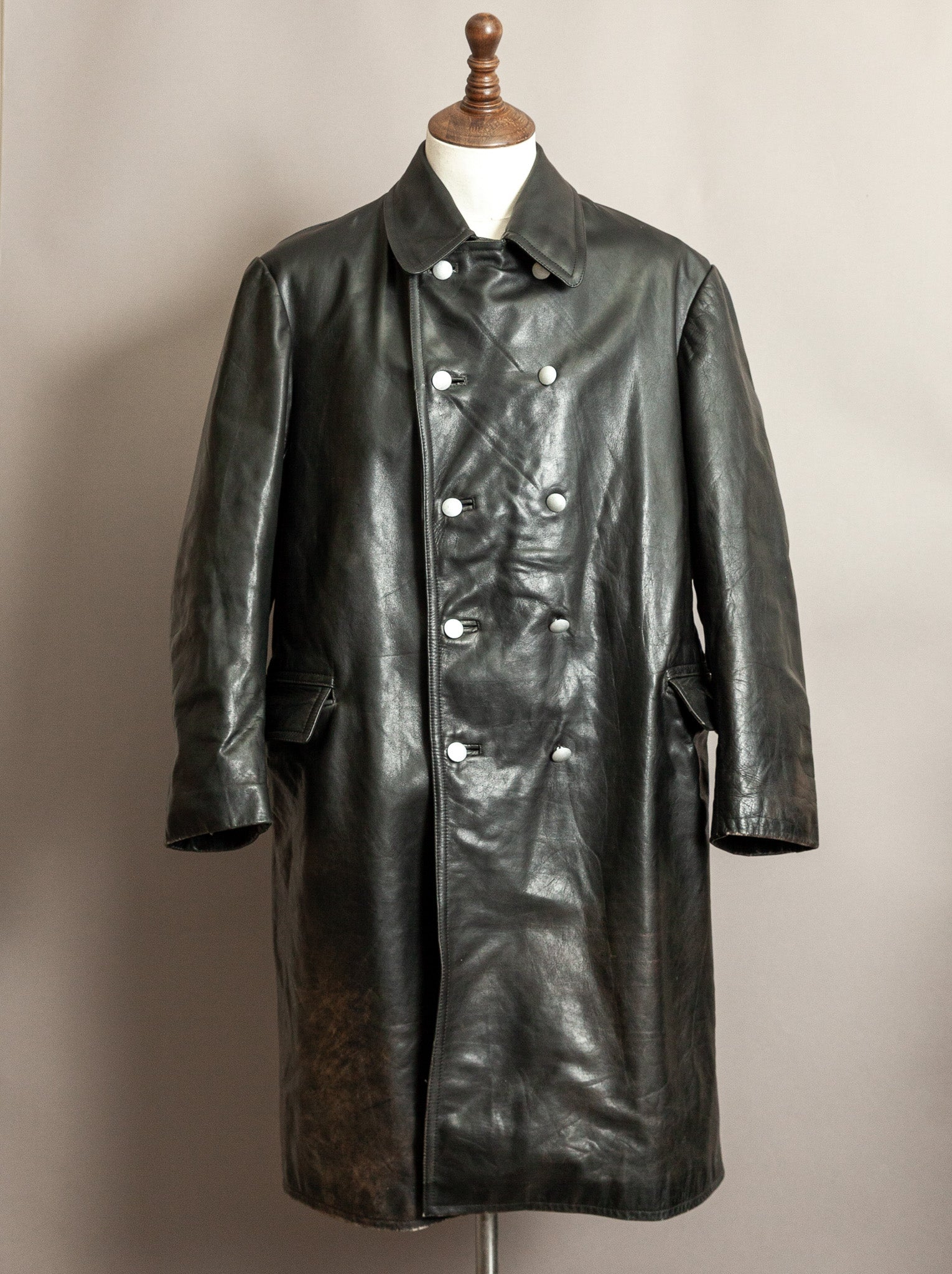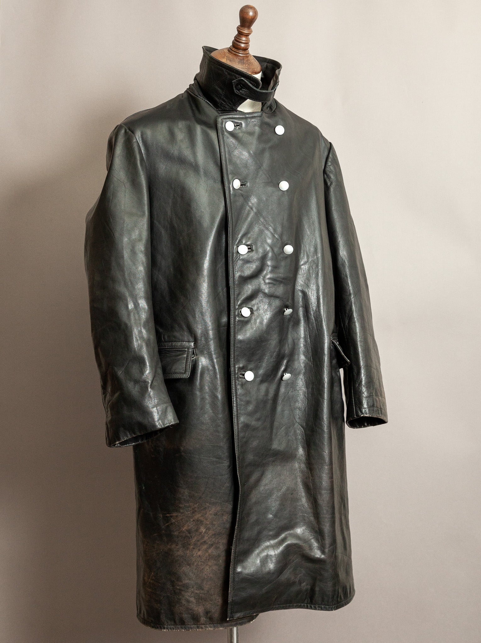 Crafted from heavyweight leather, the coat carries the defining features of motorcycle-issue garments: a long, double-breasted front for added wind protection, reinforced seams for endurance, and a length designed to shield both torso and upper legs while riding. The broad collar and bold silhouette embody authority, ensuring officers were as protected in the saddle as they were commanding in presence when dismounted.