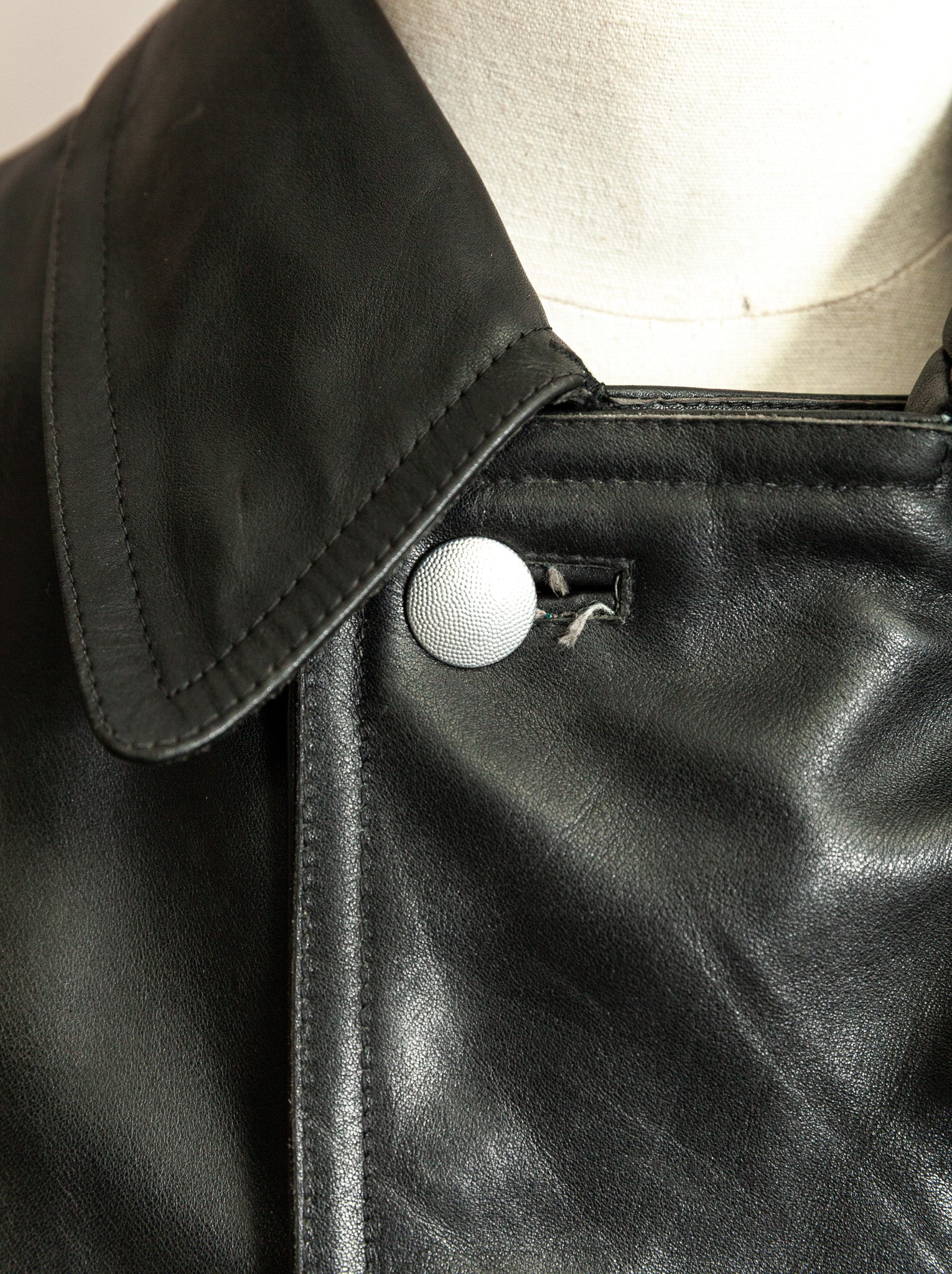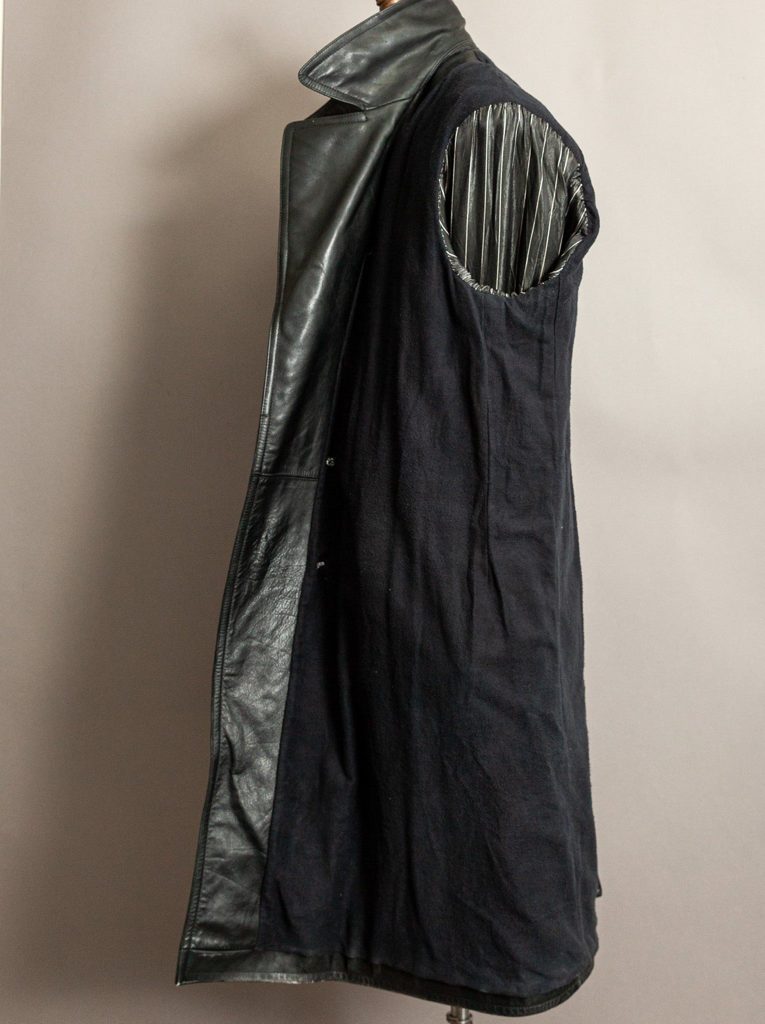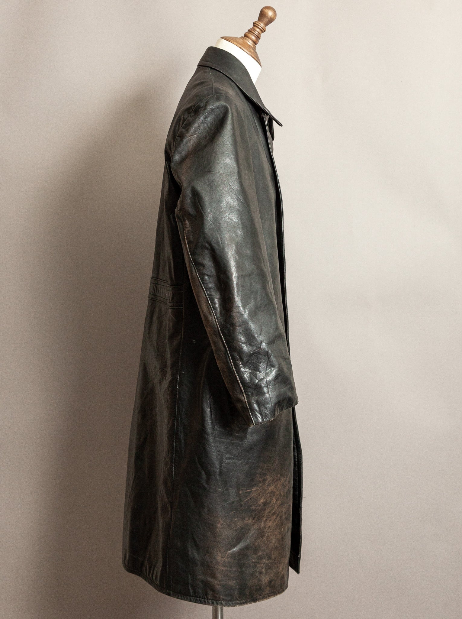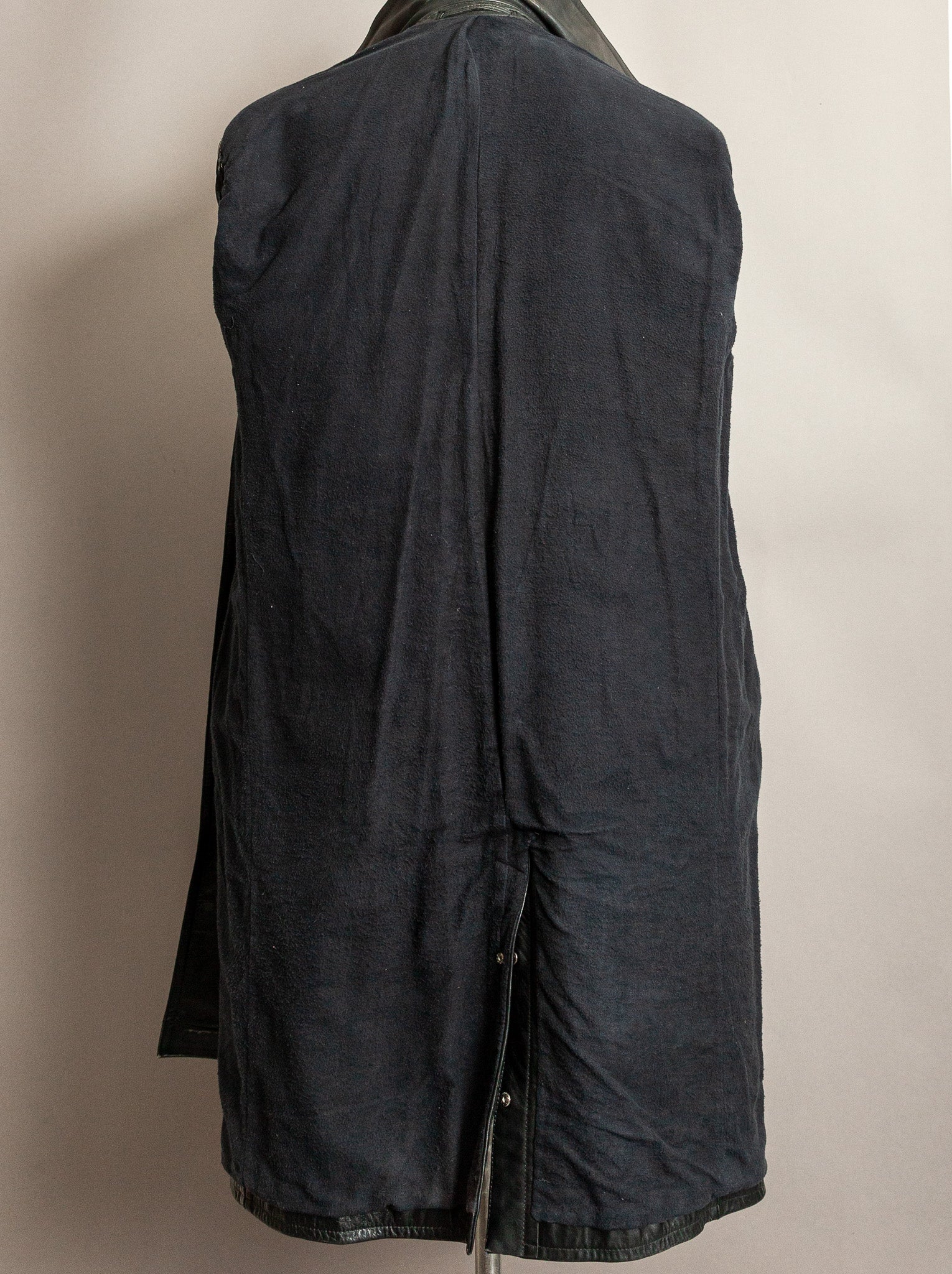 Crafted from heavyweight leather, the coat carries the defining features of motorcycle-issue garments: a long, double-breasted front for added wind protection, reinforced seams for endurance, and a length designed to shield both torso and upper legs while riding. The broad collar and bold silhouette embody authority, ensuring officers were as protected in the saddle as they were commanding in presence when dismounted.