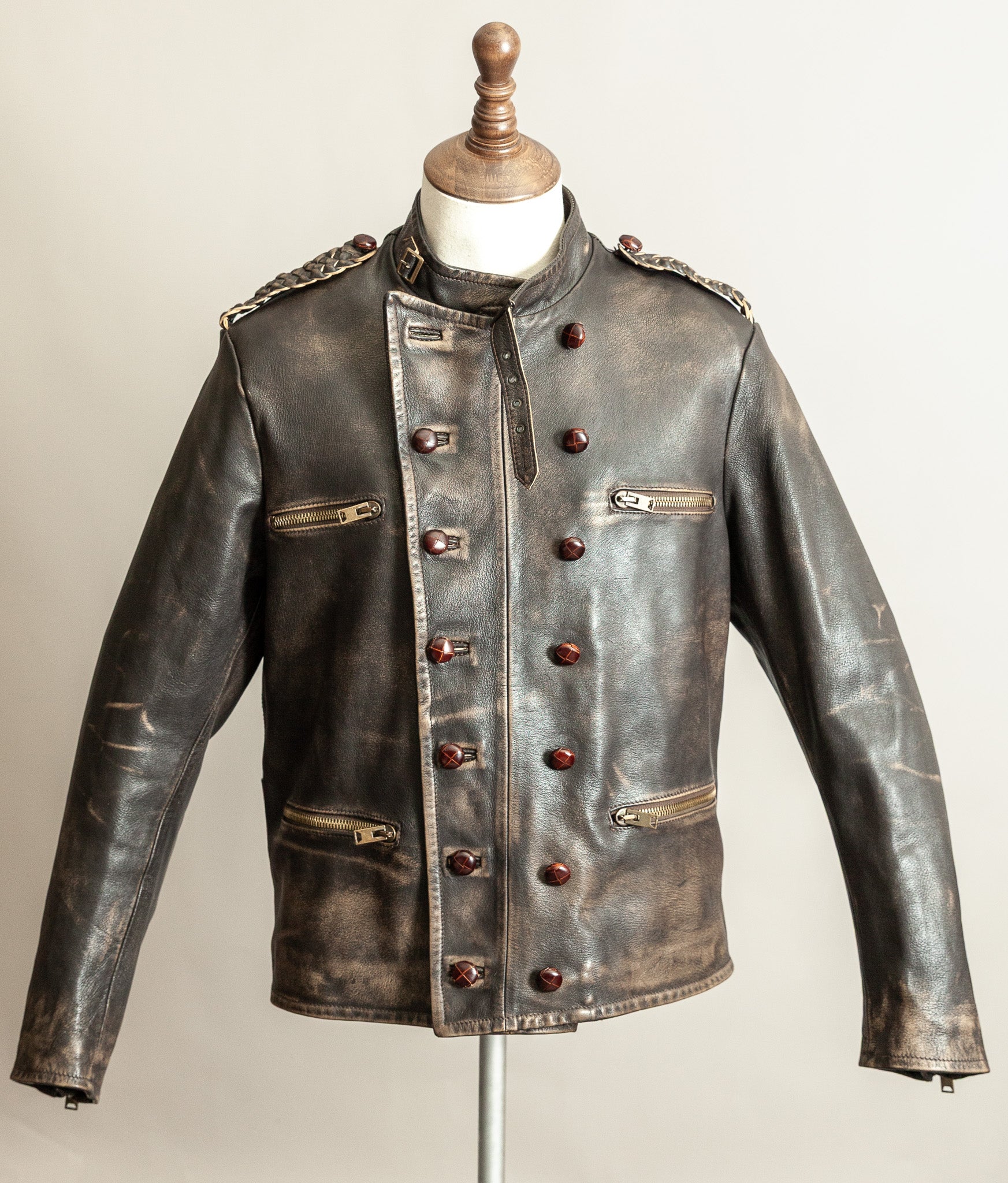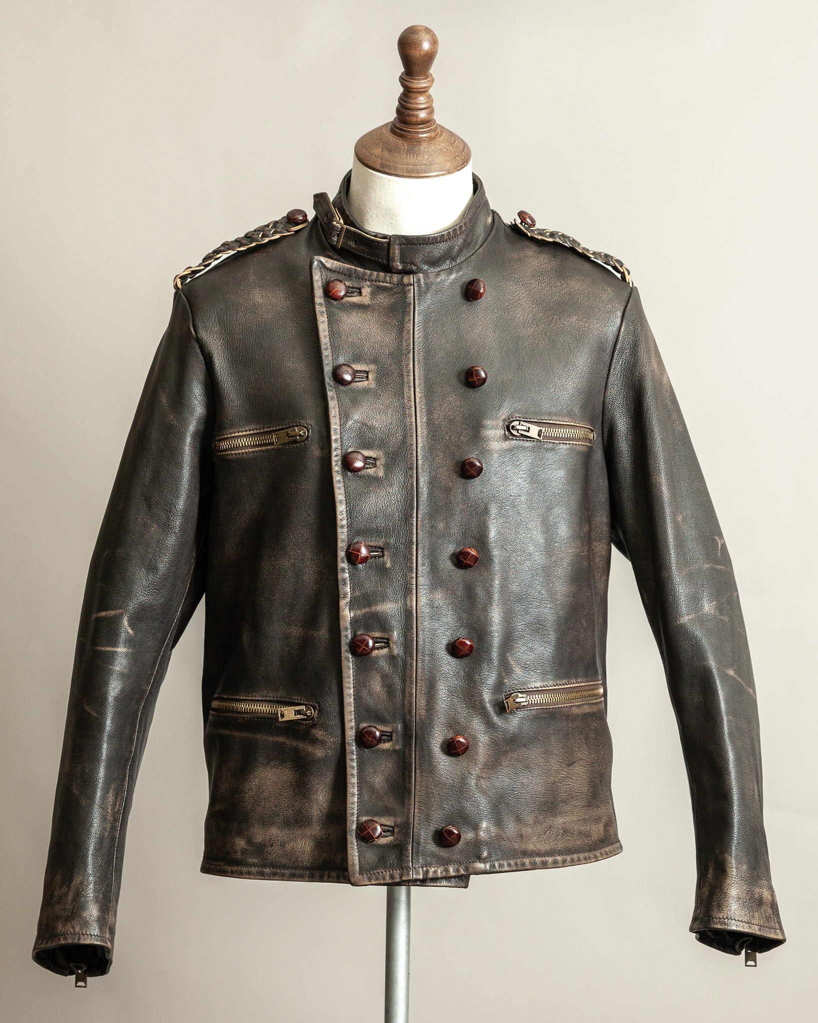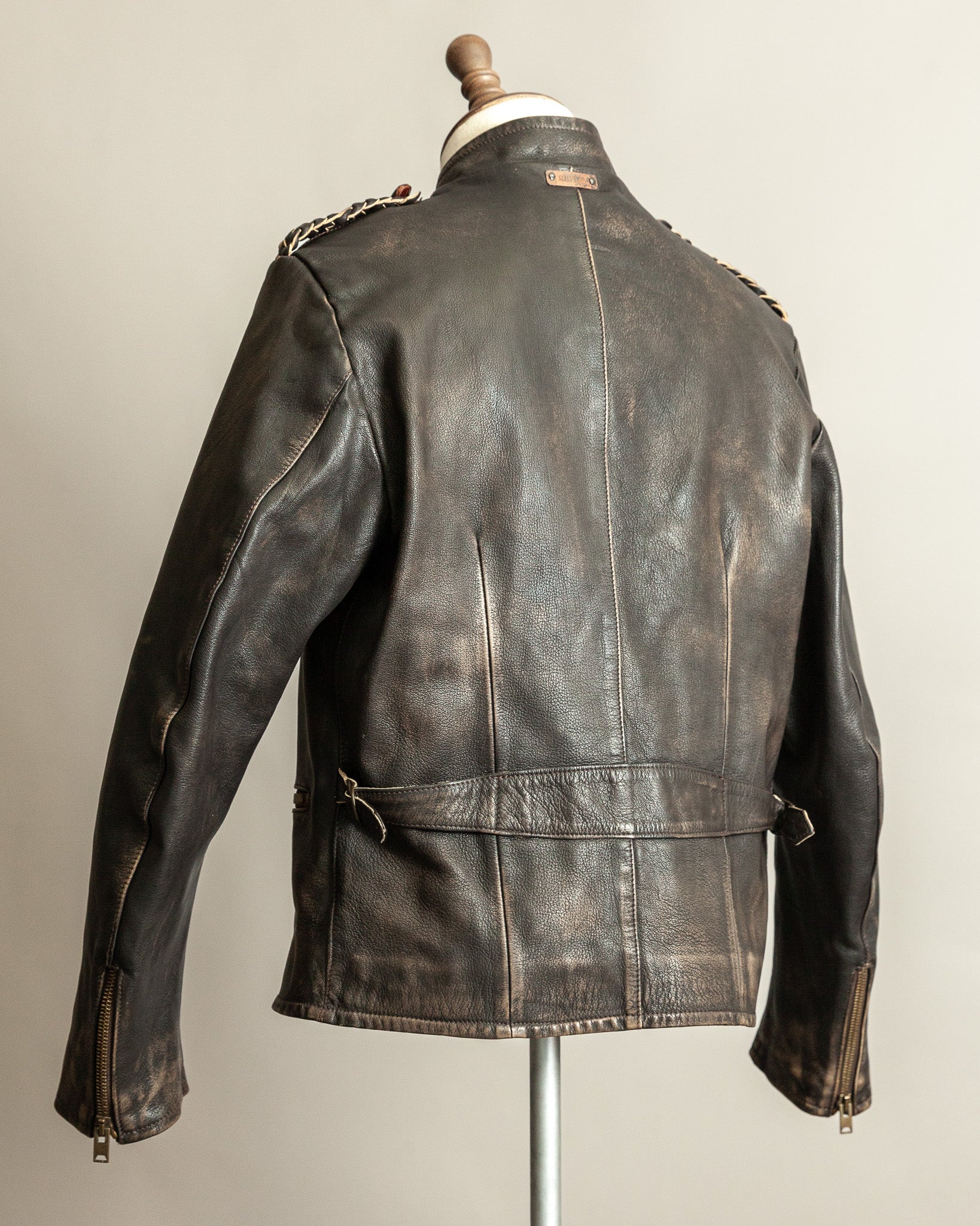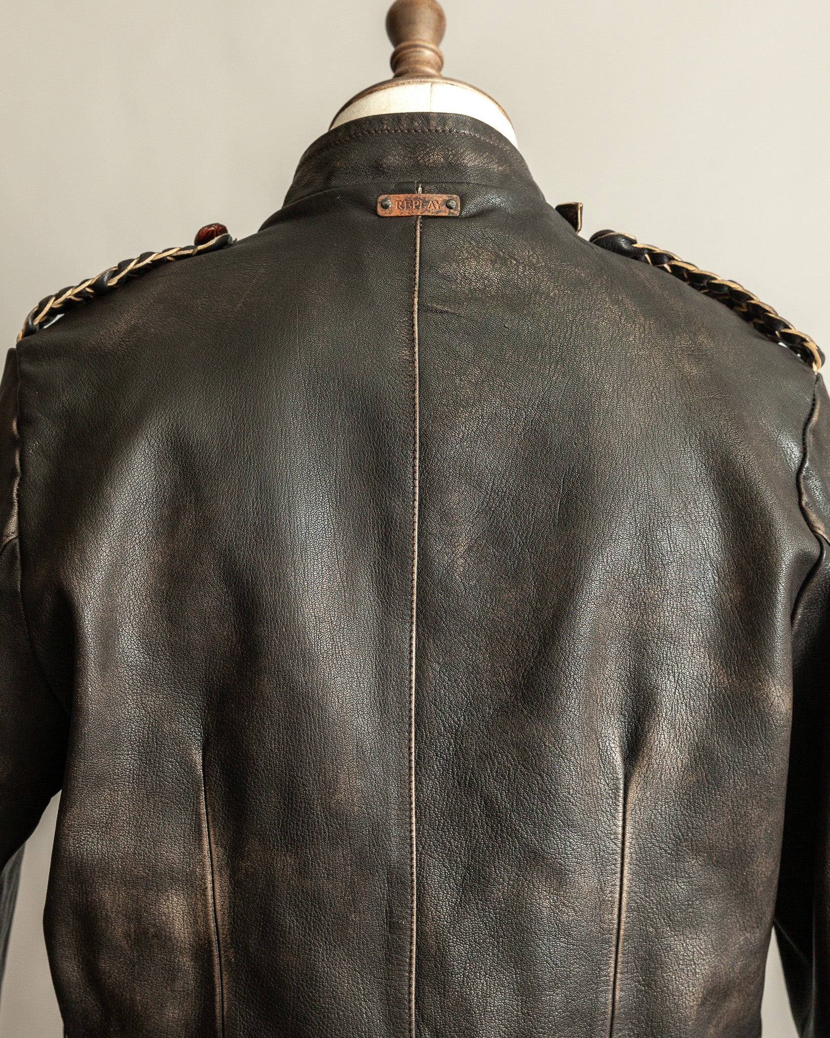 The design features a distinctive double-breasted front with large stud buttons, a high stand collar with throat latch, and braided leather epaulettes that nod to Luftwaffe insignia detailing. Four heavy brass zips at the chest and waist complete its practical form, while adjustable side straps and zipped cuffs allow for a tailored fit. Each element has been purposefully constructed, combining military discipline with the rebellious energy of 20th-century biker culture — a hallmark of Replay’s early creative direction.
