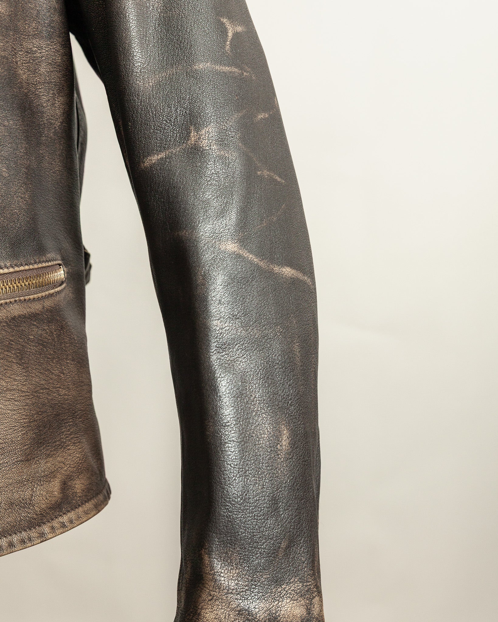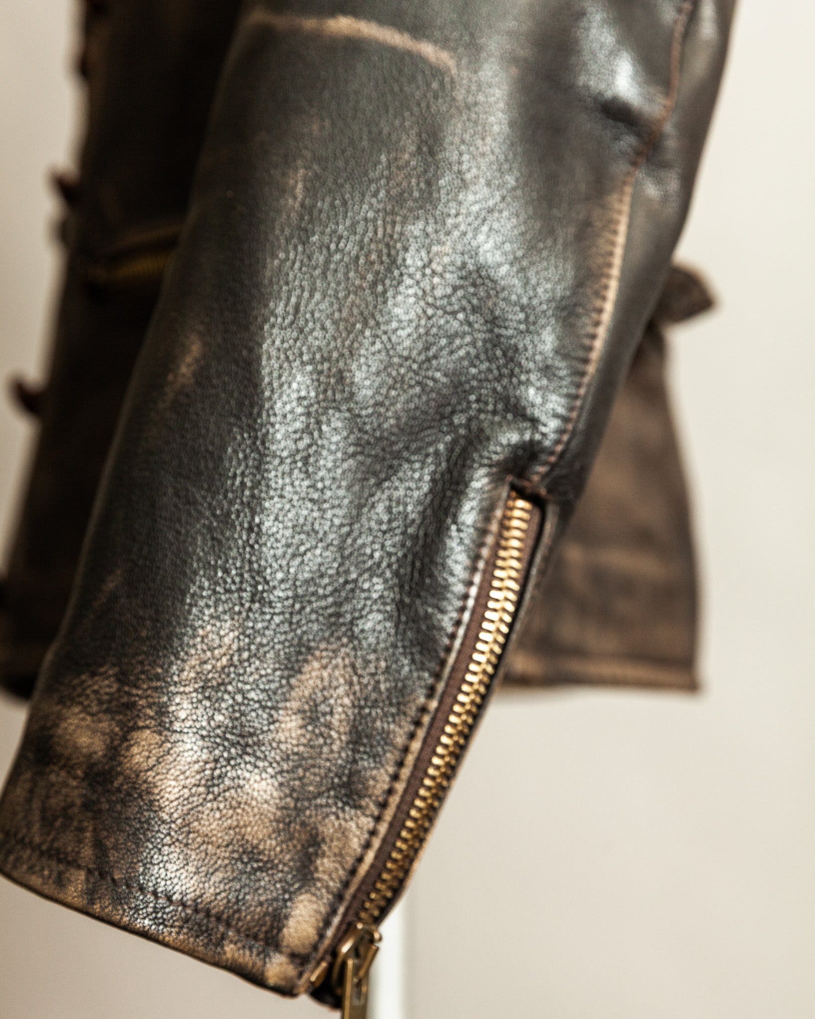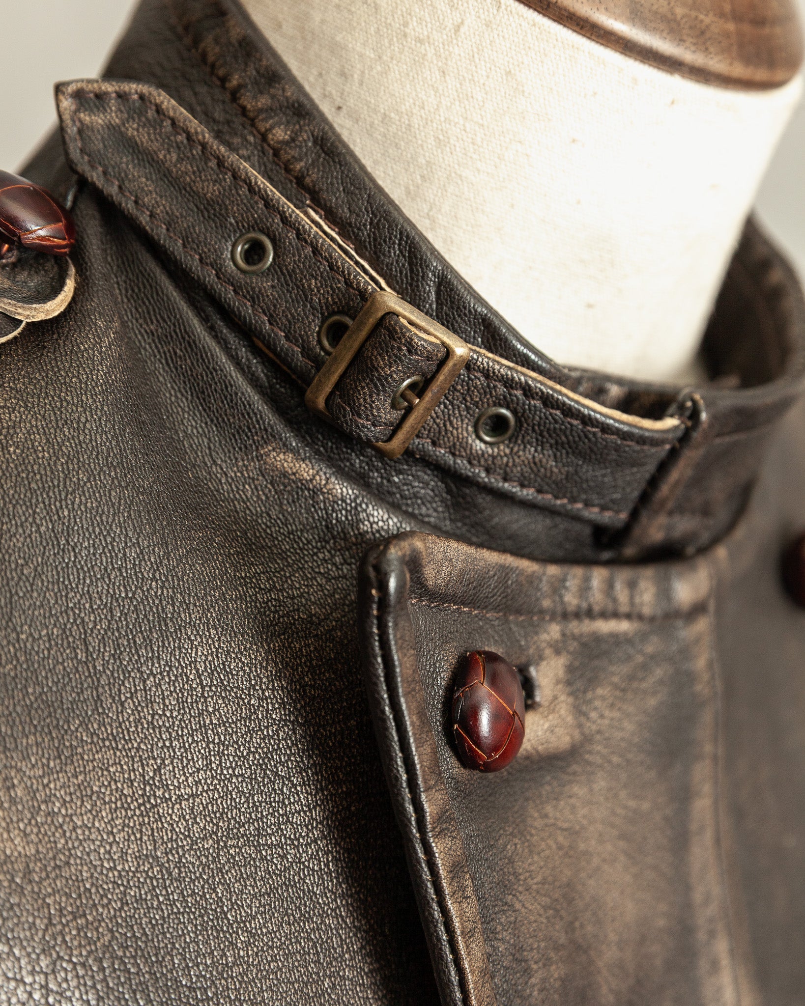 Crafted from substantial full-grain leather, the jacket displays a natural, uneven patina that has developed beautifully over time. The finish evokes the authentic wear of vintage flight leathers — with tonal contrast along seams and edges that enhances its sculptural form. The hide is weighty yet supple, maintaining its structure while draping naturally with movement. Inside, a soft brown moleskin lining provides comfort and warmth, complementing the jacket’s rugged exterior.
