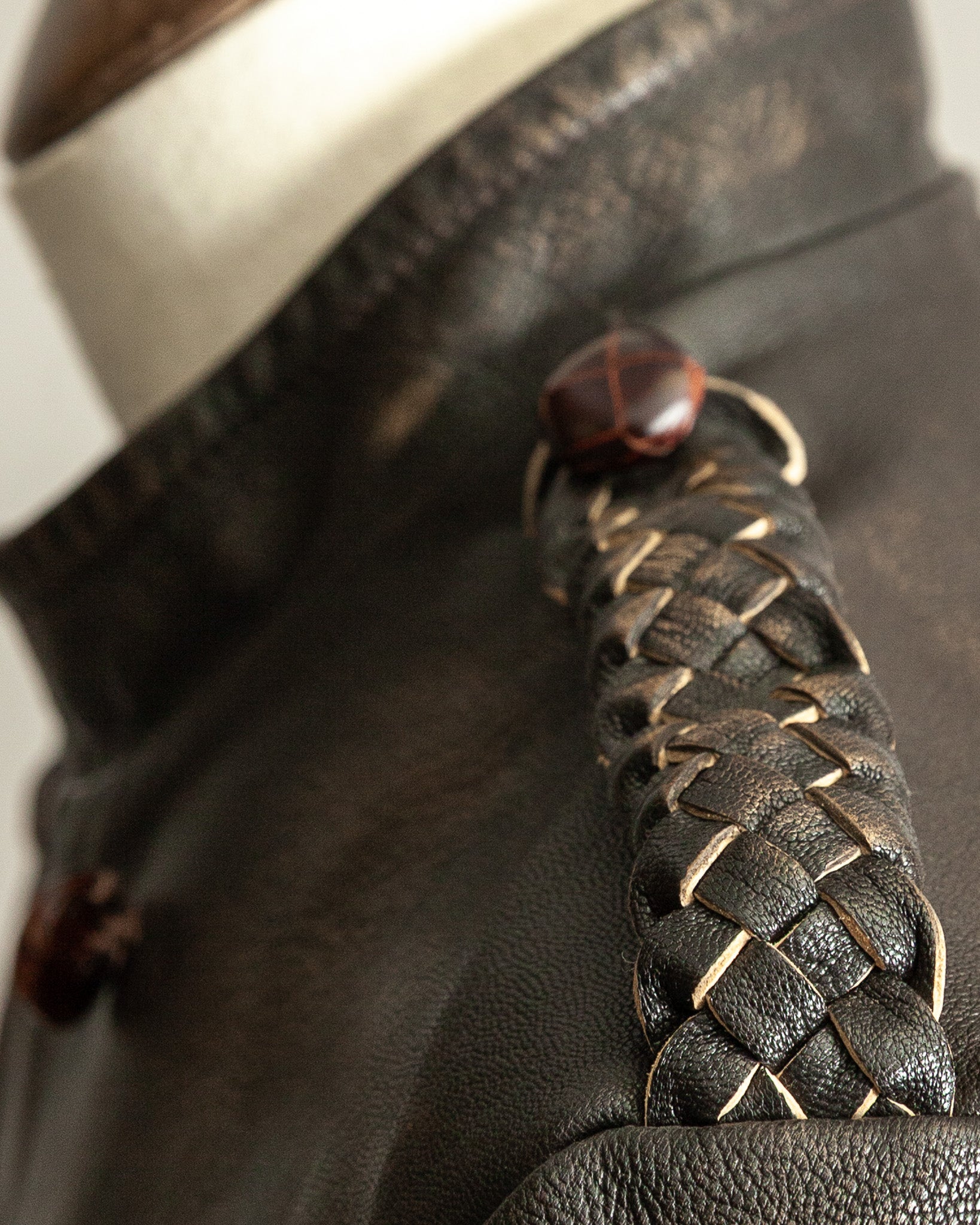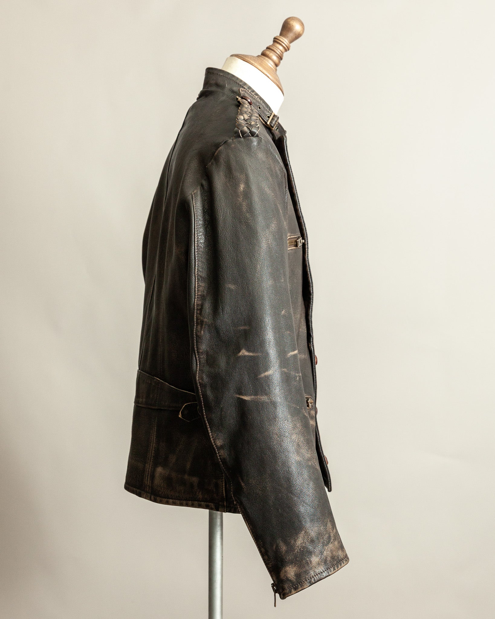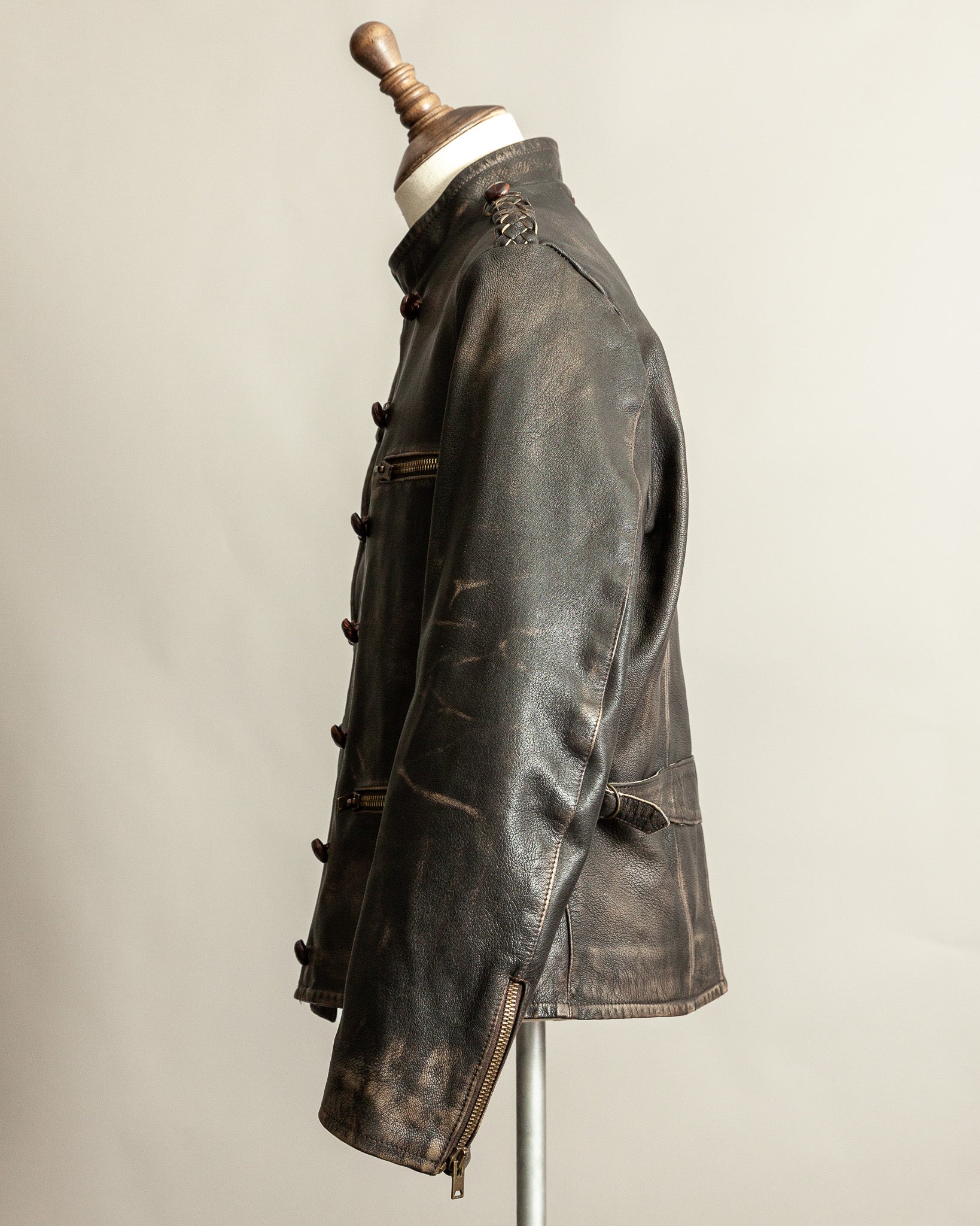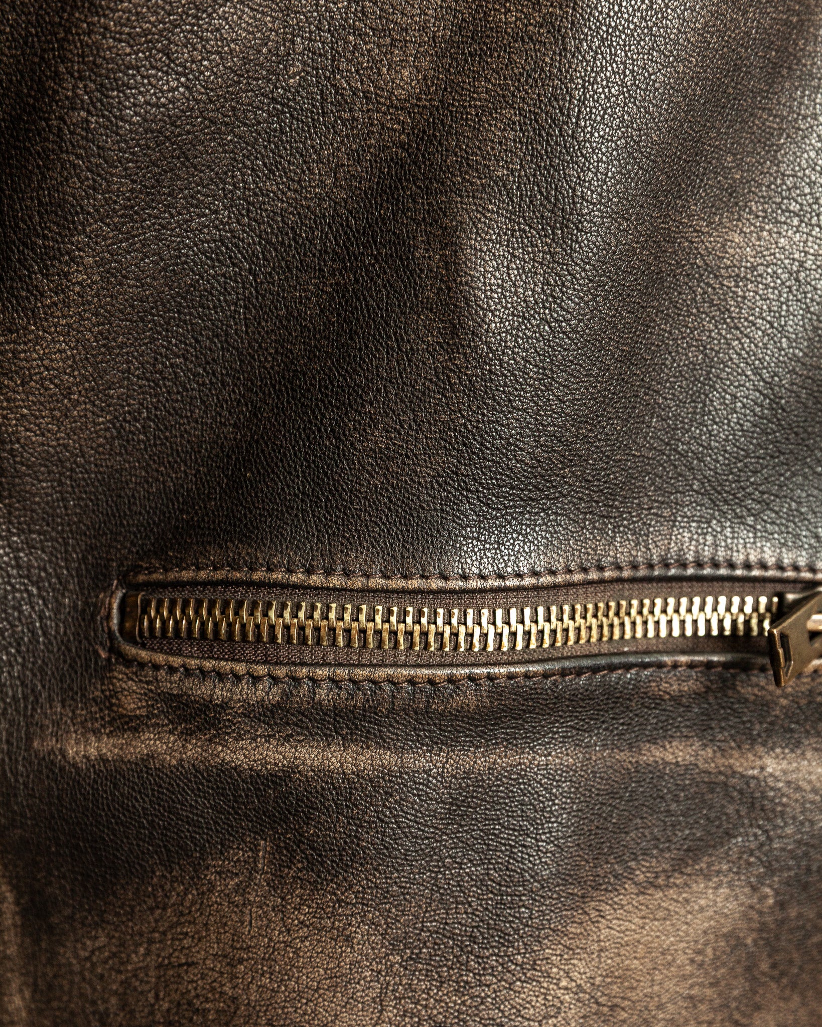 Crafted from substantial full-grain leather, the jacket displays a natural, uneven patina that has developed beautifully over time. The finish evokes the authentic wear of vintage flight leathers — with tonal contrast along seams and edges that enhances its sculptural form. The hide is weighty yet supple, maintaining its structure while draping naturally with movement. Inside, a soft brown moleskin lining provides comfort and warmth, complementing the jacket’s rugged exterior.