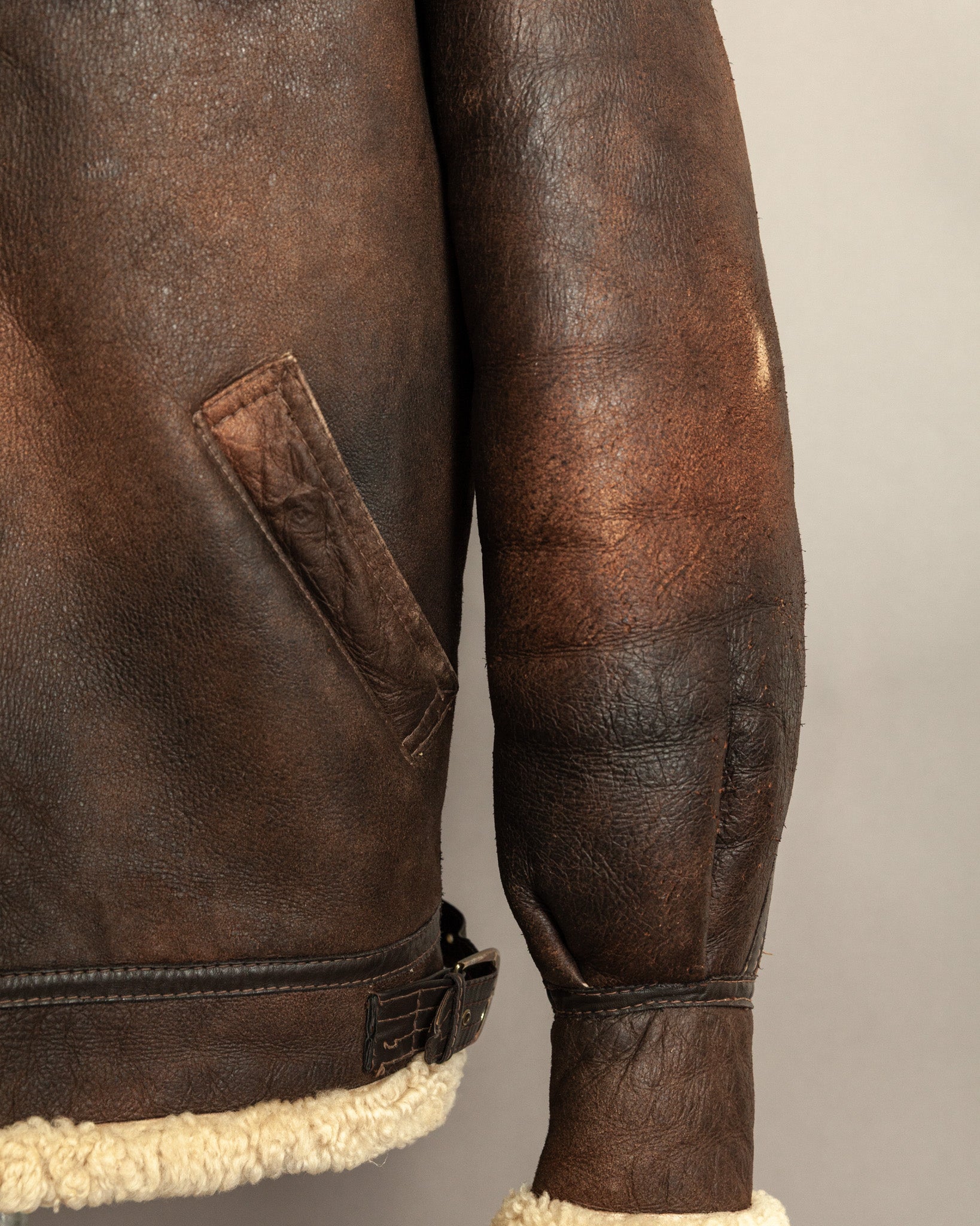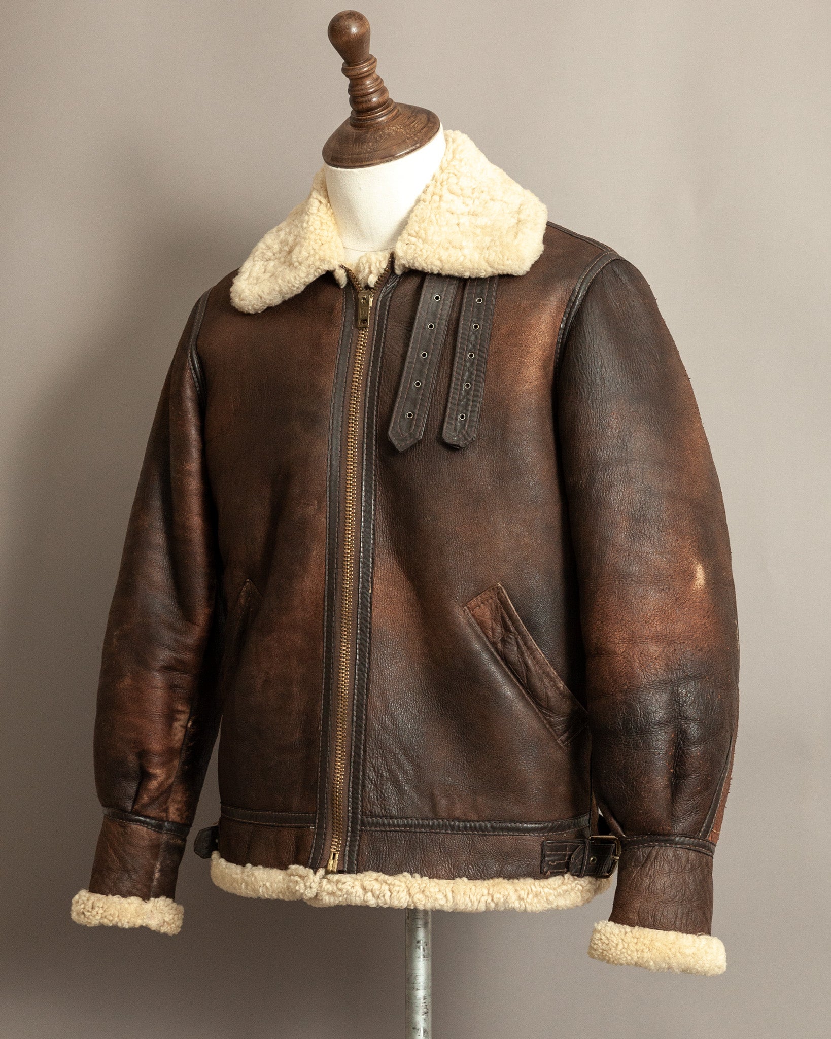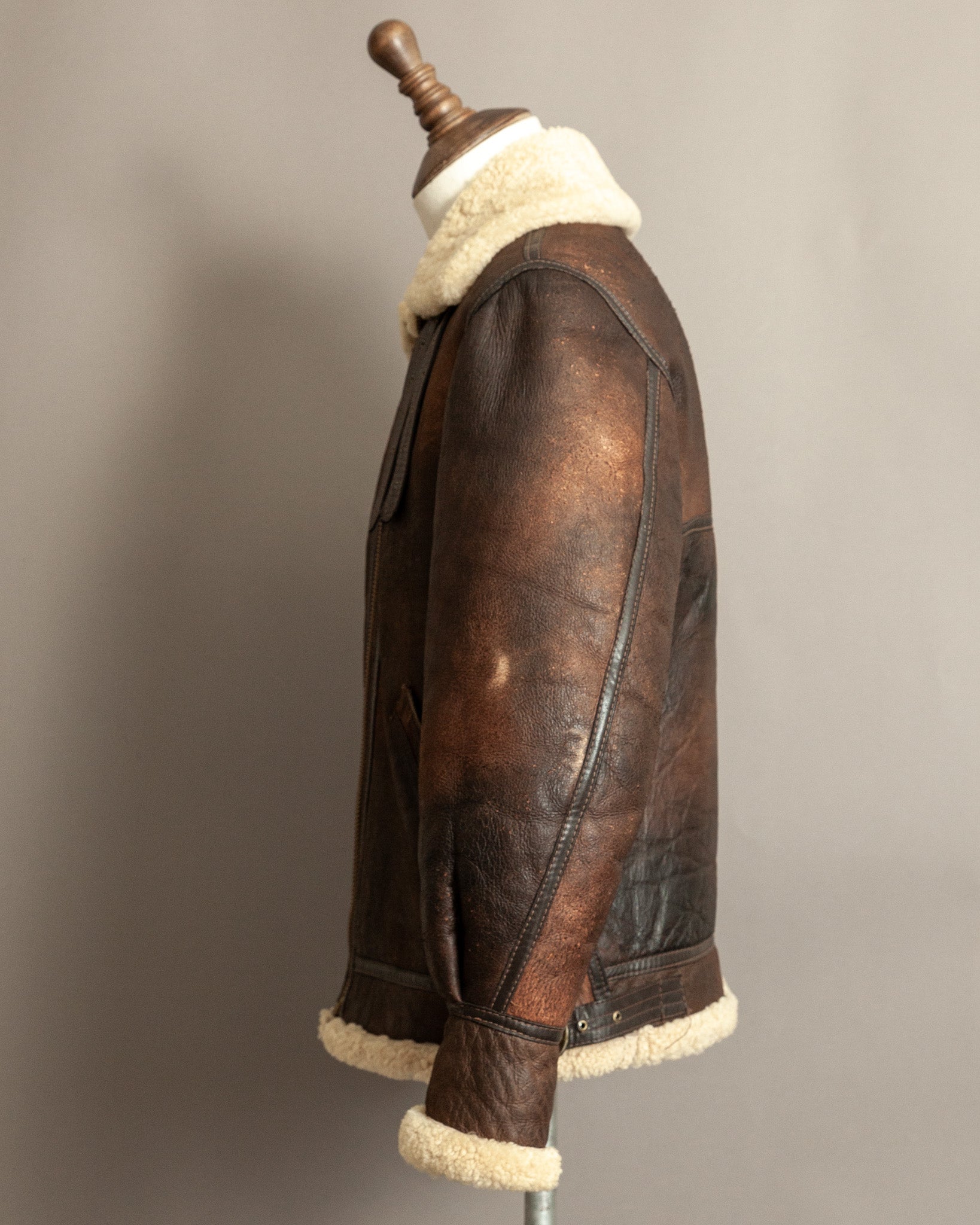 Professionally cleaned and conditioned, the jacket has been carefully preserved while maintaining its history. The shearling remains plush and insulating, the leather strong and supple. Its surface displays a beautiful patina developed over decades, with light chapping, creasing, and areas of distressed abrasion that enhance its authenticity and narrative appeal. Hardware functions smoothly, ensuring continued use while retaining originality.
