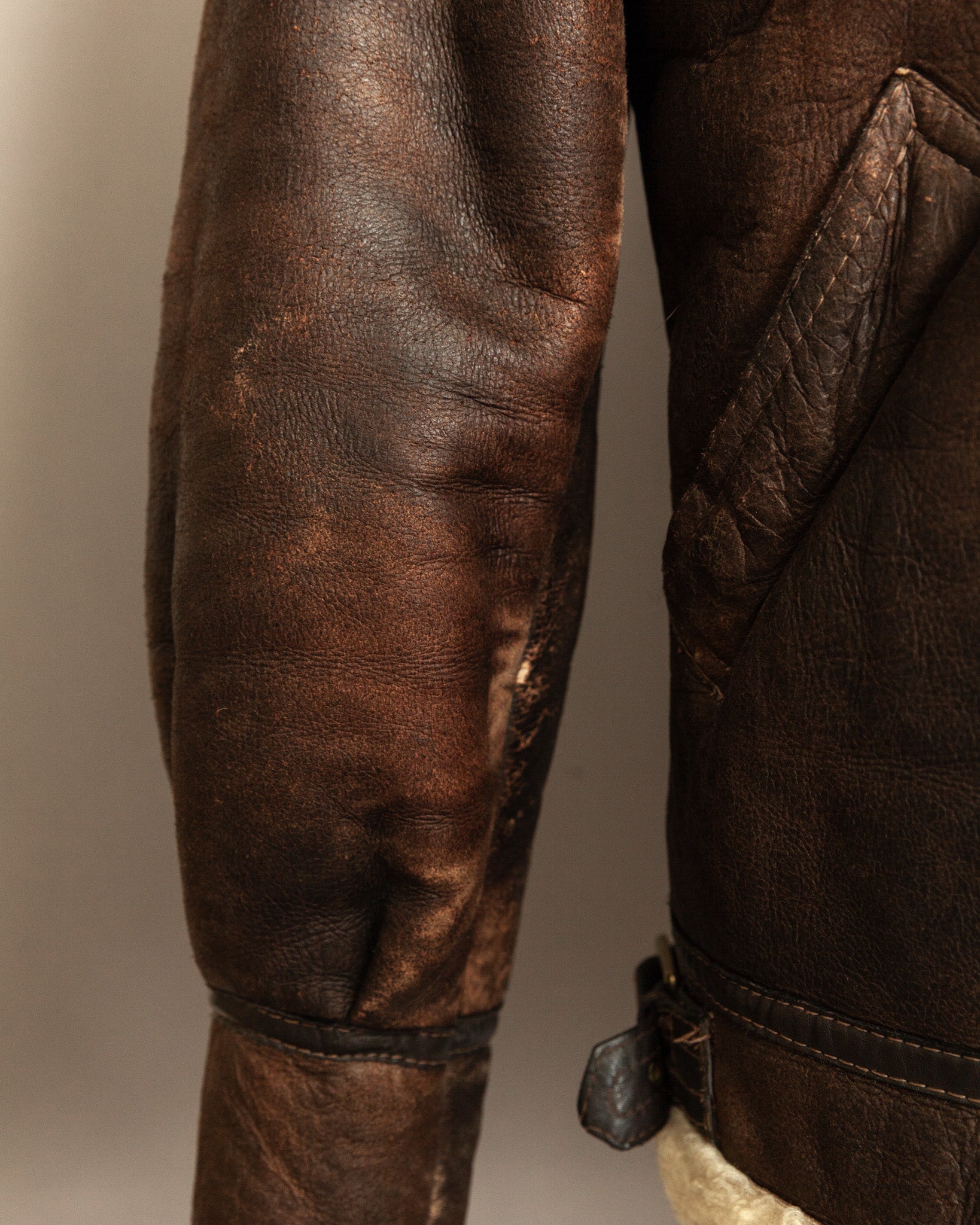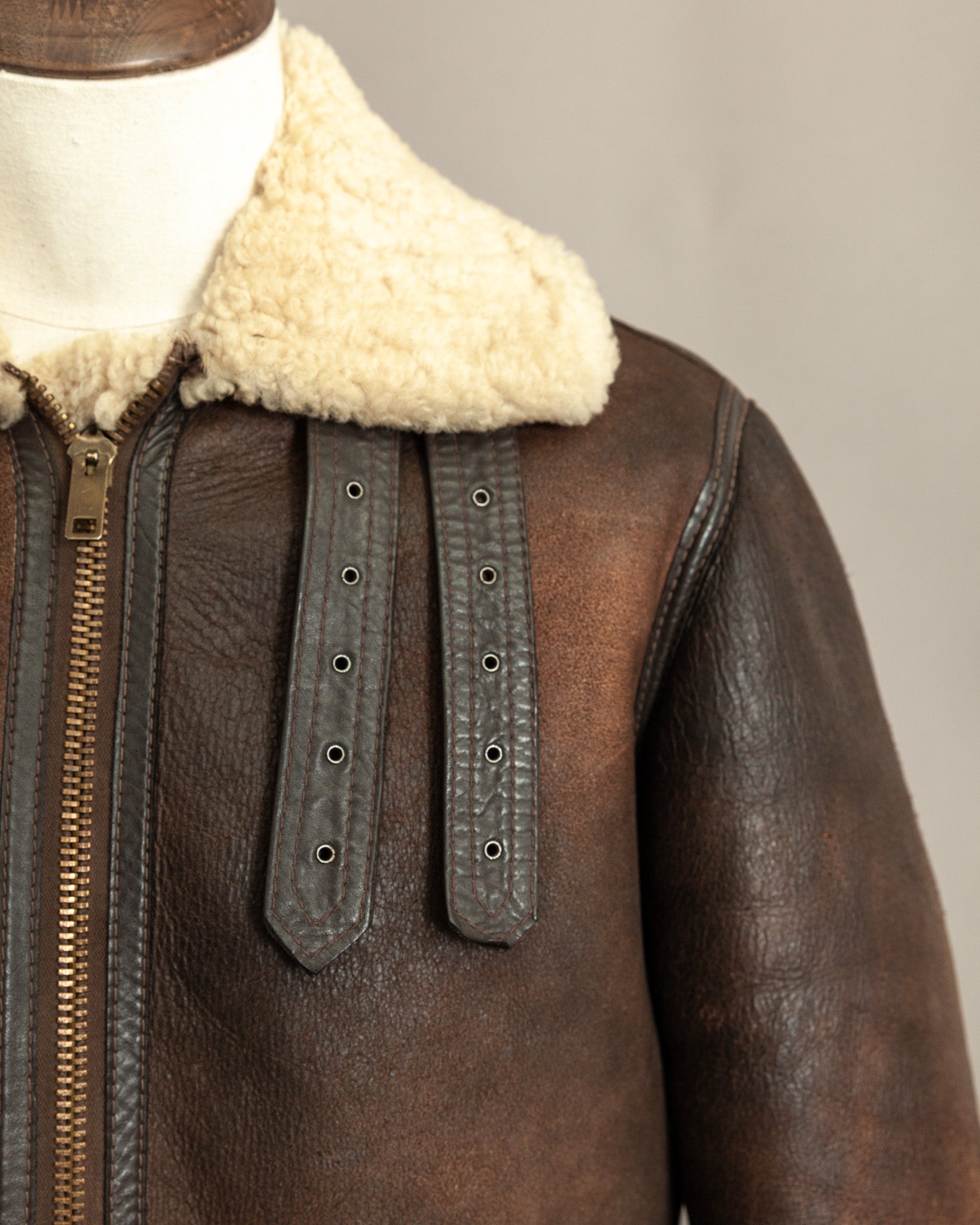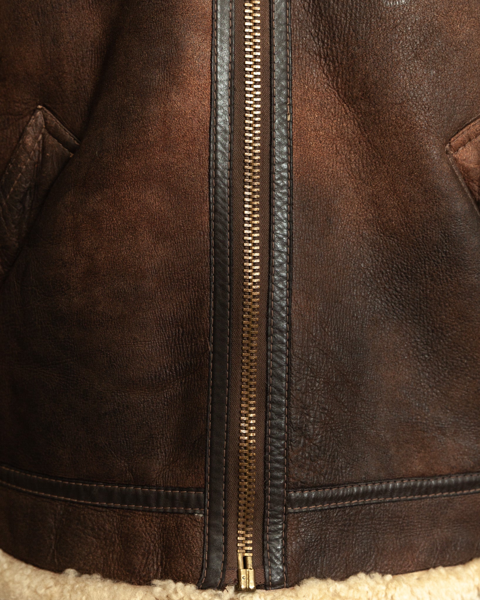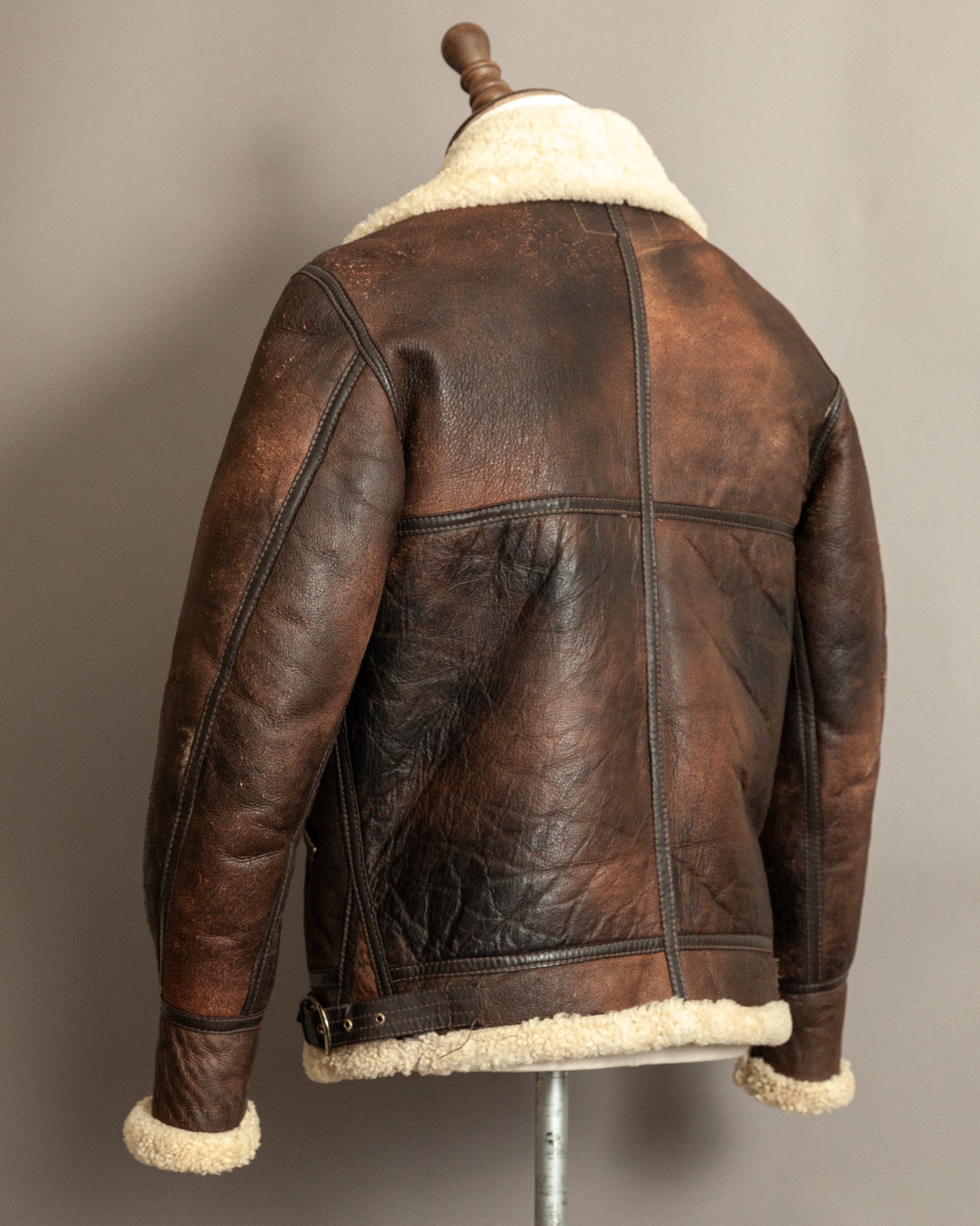 Professionally cleaned and conditioned, the jacket has been carefully preserved while maintaining its history. The shearling remains plush and insulating, the leather strong and supple. Its surface displays a beautiful patina developed over decades, with light chapping, creasing, and areas of distressed abrasion that enhance its authenticity and narrative appeal. Hardware functions smoothly, ensuring continued use while retaining originality.