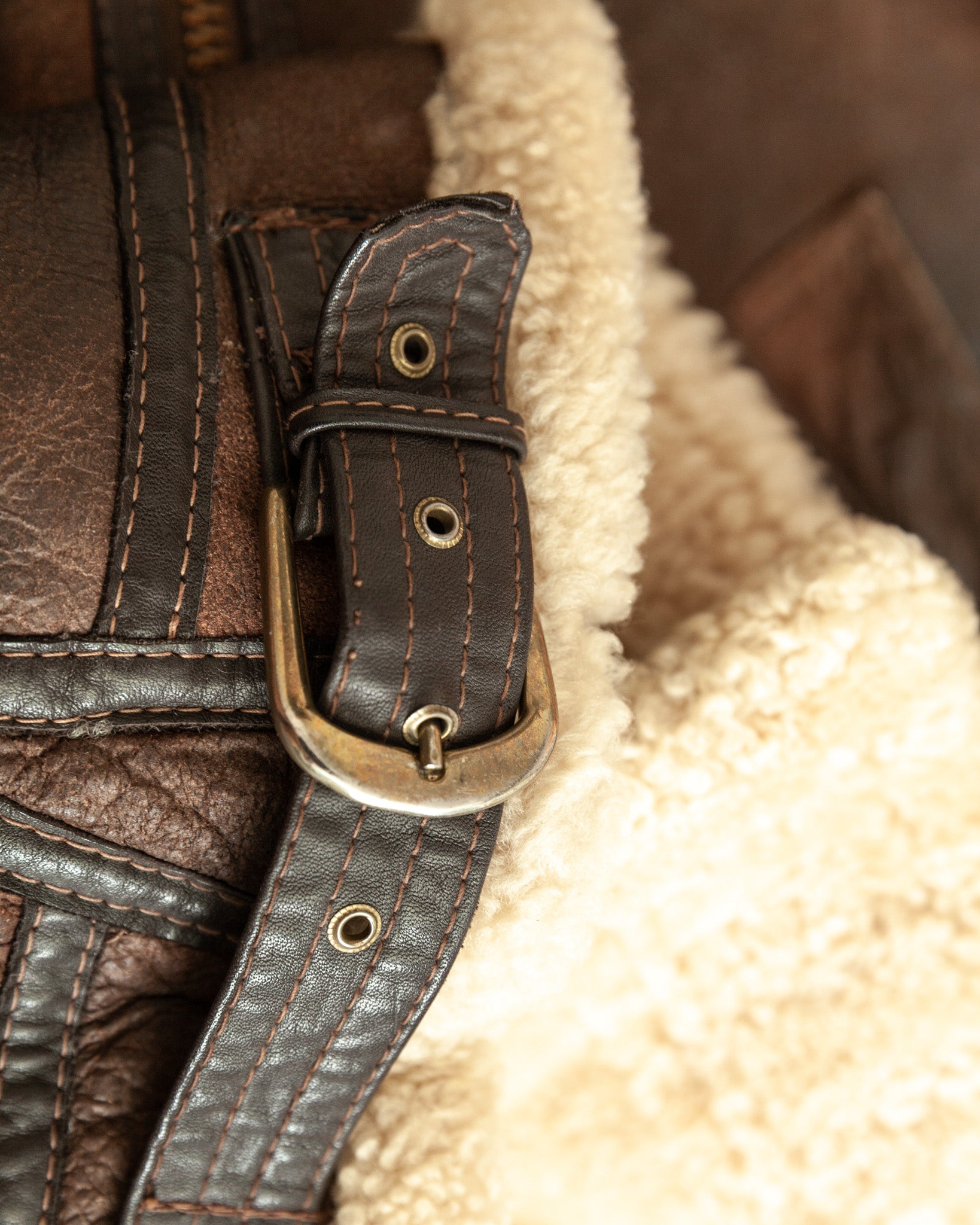 Constructed in real sheepskin shearling with a durable leather outer, the jacket retains every hallmark of its wartime predecessors: an oversized shearling collar with twin leather throat latches, angled hand-warmer pockets, reinforced seams, buckle side adjusters, and a heavy-duty front zipper. Designed for survival above the clouds, it balances rugged function with unmistakable presence.