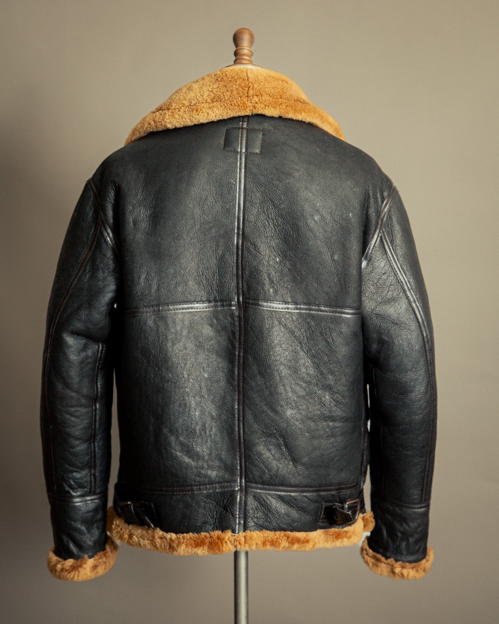 Crafted from full-weight sheepskin with a supple leather exterior and dense fleece interior, this jacket is a masterclass in function and authenticity. The heavy front zipper, twin throat latch straps, and side adjuster buckles speak to its military origins — built for warmth, endurance, and flight-ready reliability. The hide has developed a rich, natural patina with subtle creasing and light wear that enhances its character, embodying the passage of time without compromising integrity.