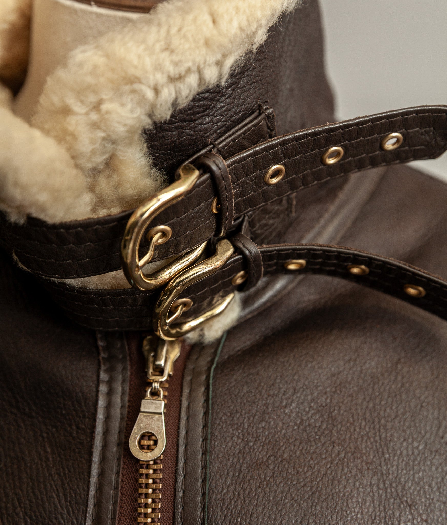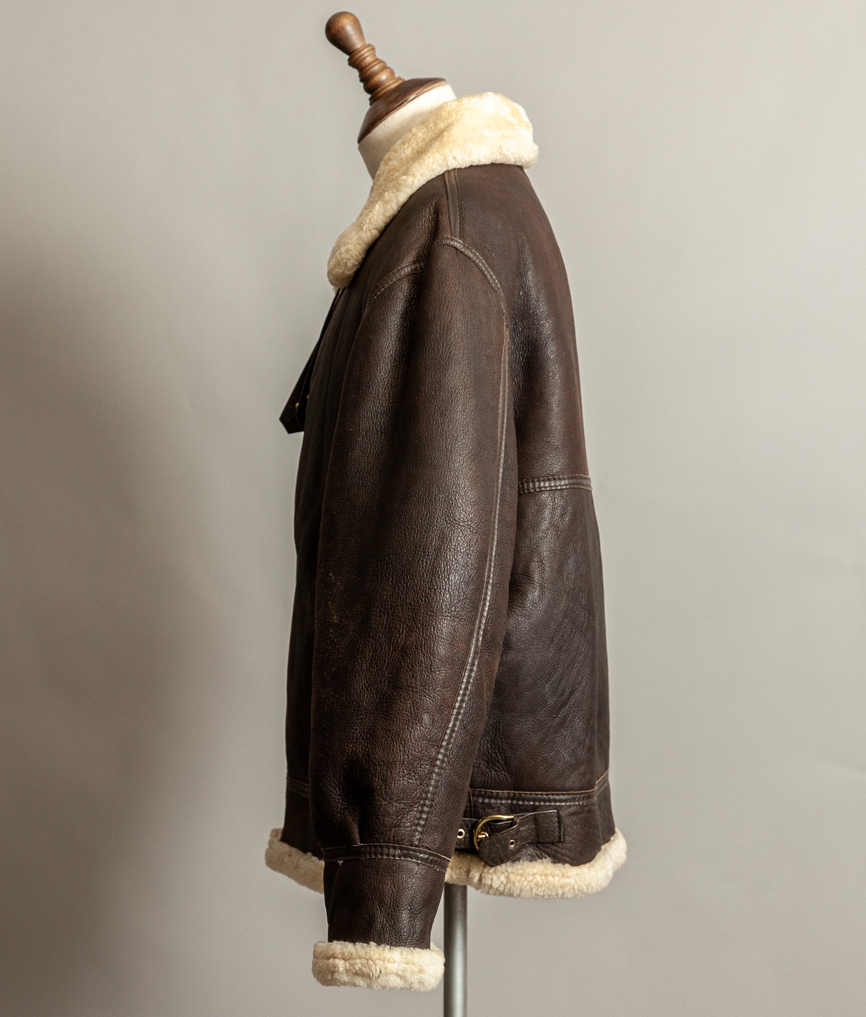 This mid-weight example is crafted from supple dark brown sheepskin with a soft cream shearling interior, offering substantial warmth without excessive bulk. The hide has developed a rich, natural patina with subtle tonal depth, while the fleece remains full, soft, and insulating. Functional detailing includes a heavy-duty front zipper, twin throat latch buckles, and side adjusters that echo the purposeful design of original Air Force issue jackets.