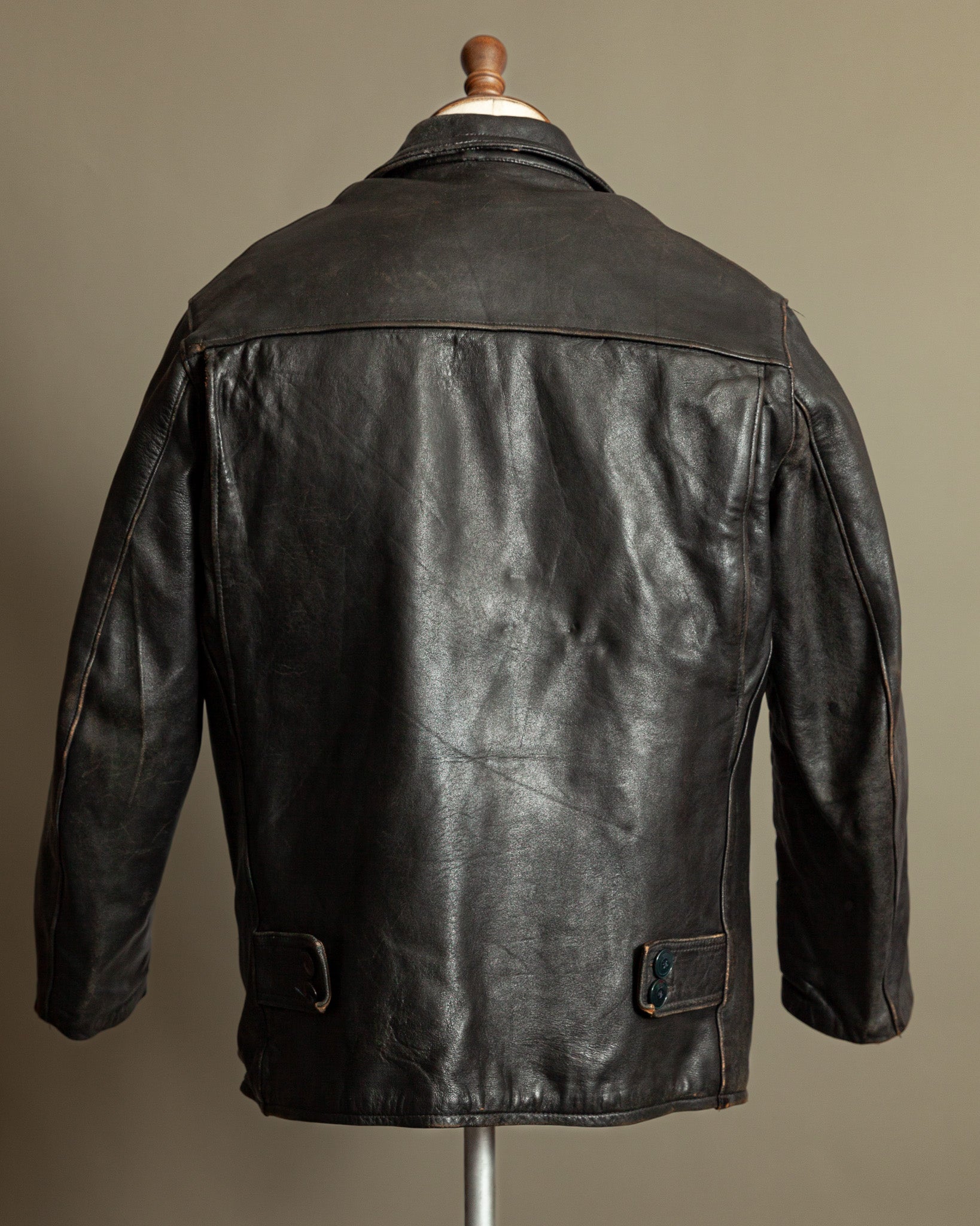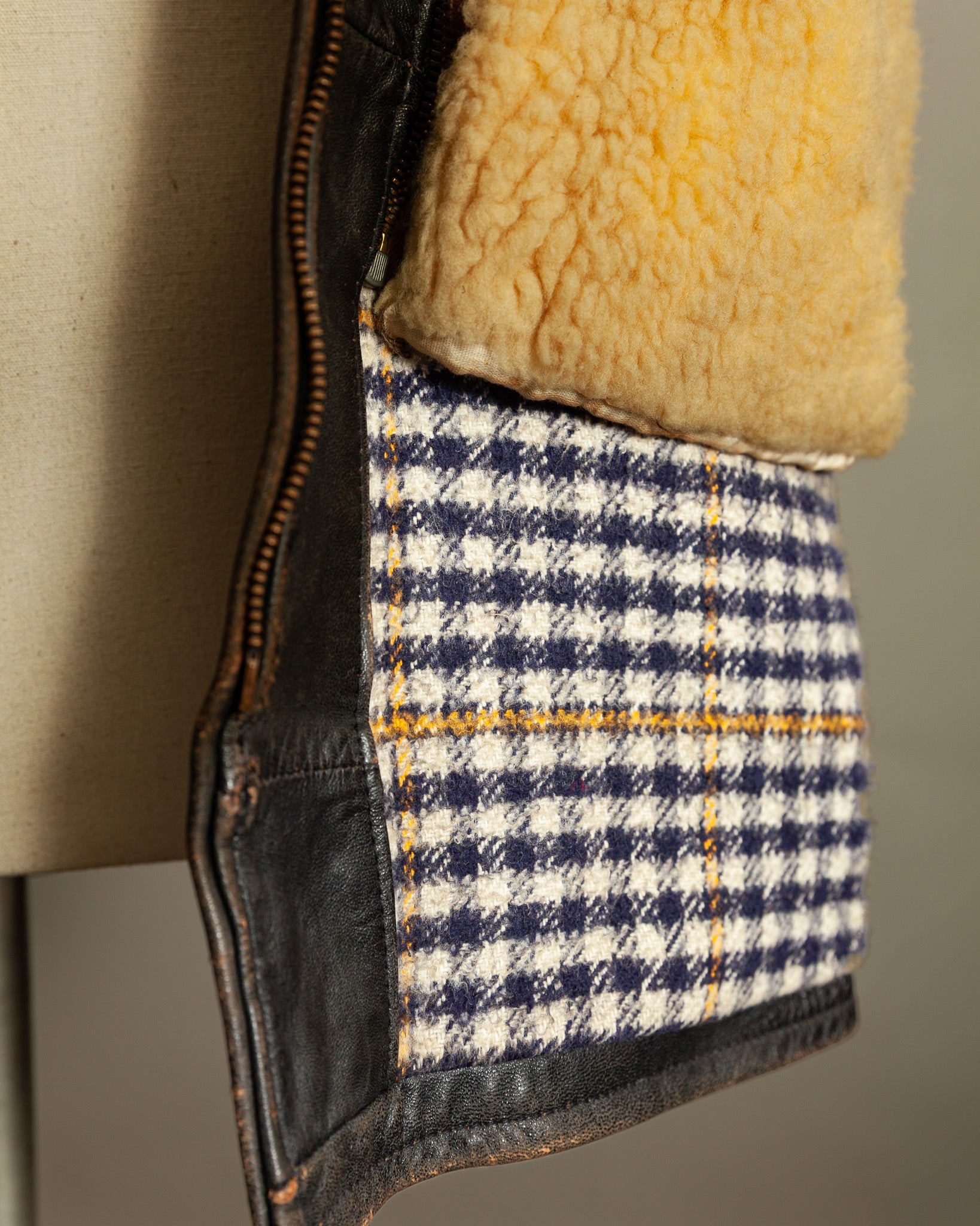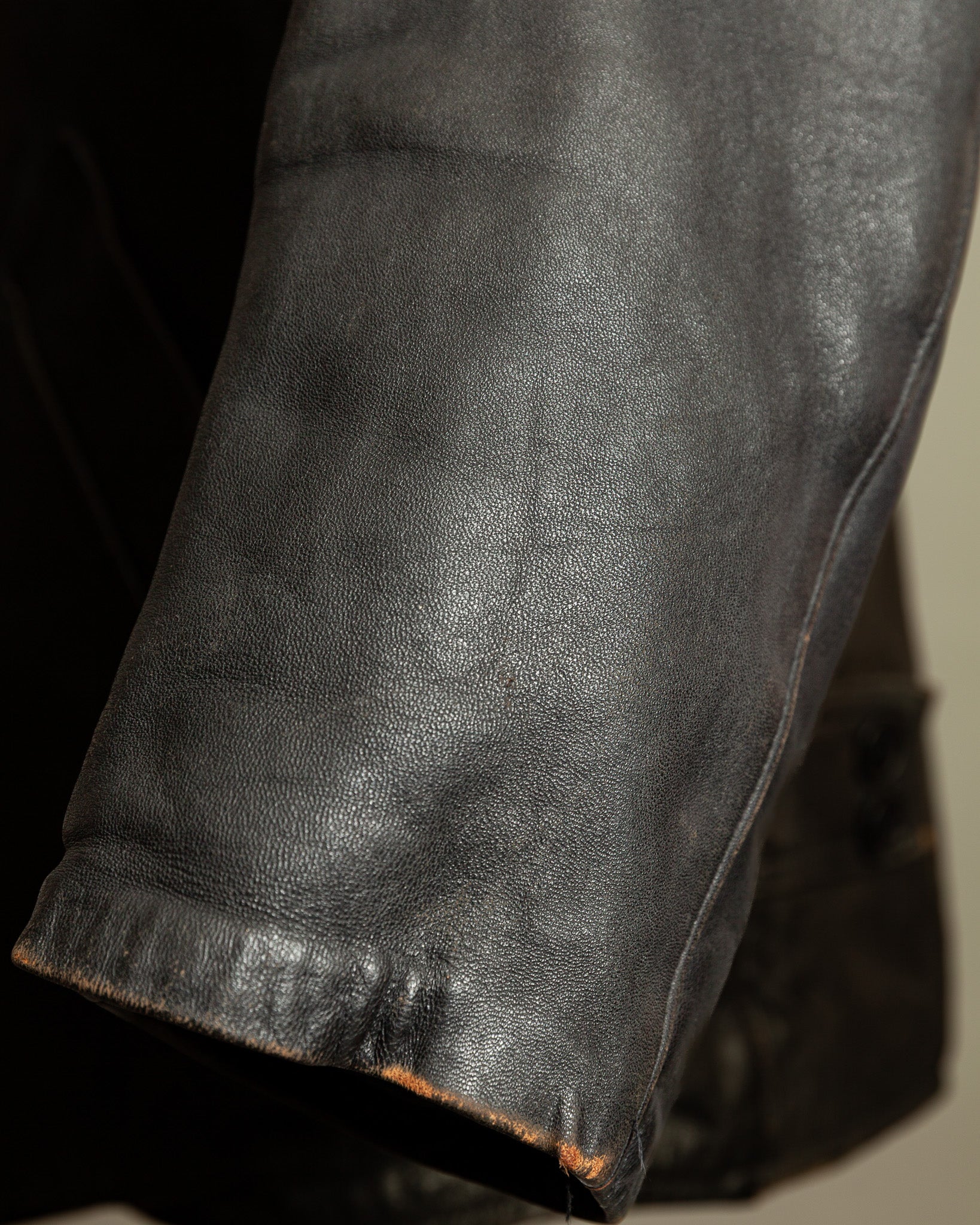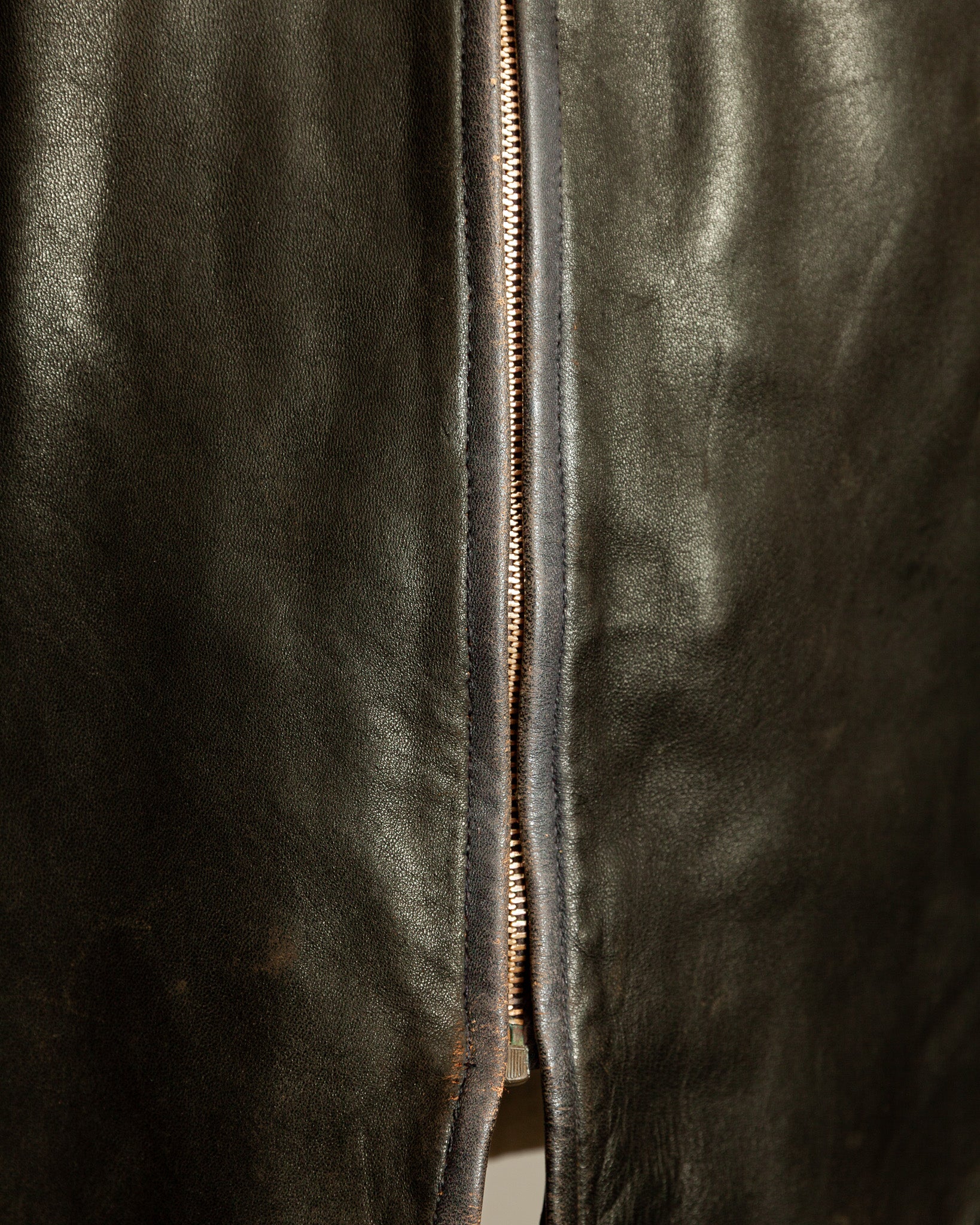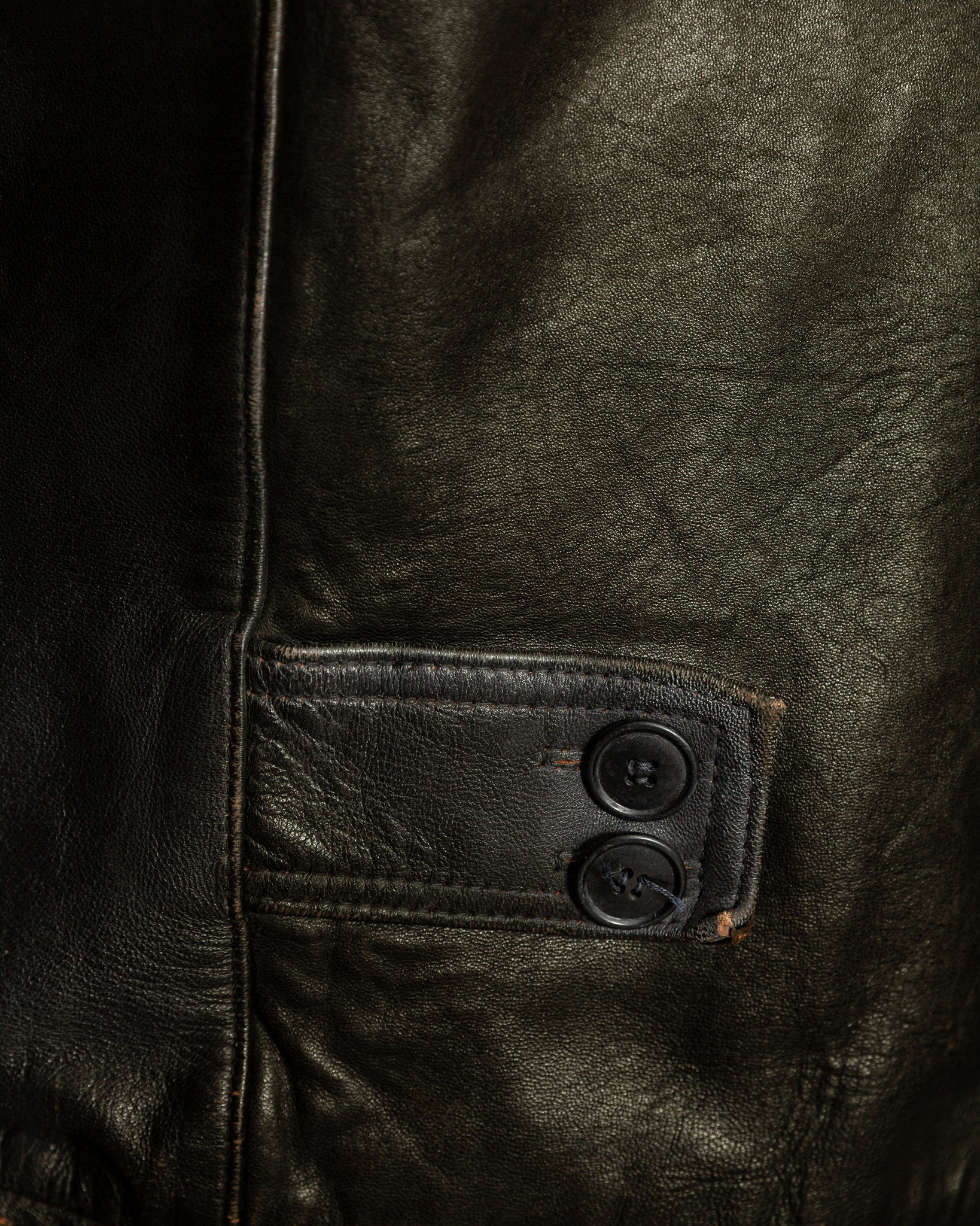 The leather has aged beautifully, its surface carrying a storied patina that tells the history of decades past. The hide is dense and strong yet soft to the touch, with a naturally distressed finish that has developed through genuine wear. This jacket was professionally dry cleaned to remove all bacteria and soiling, then carefully leather-cleaned and conditioned in-house using our own specialist formulas. The process nourishes the hide deeply, restoring suppleness and tone while preserving the original character and aged surface.