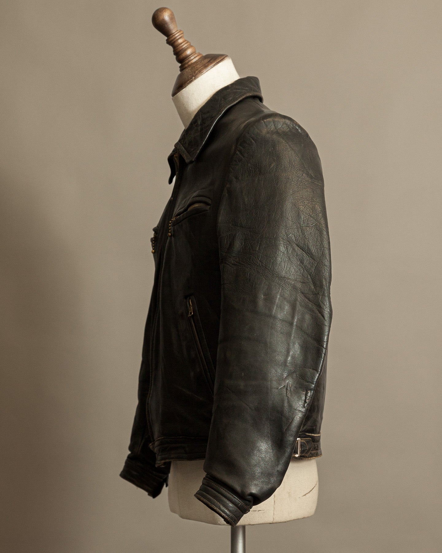 A serious mid century German riding jacket defined by material integrity, correct period hardware and authentic surface character.