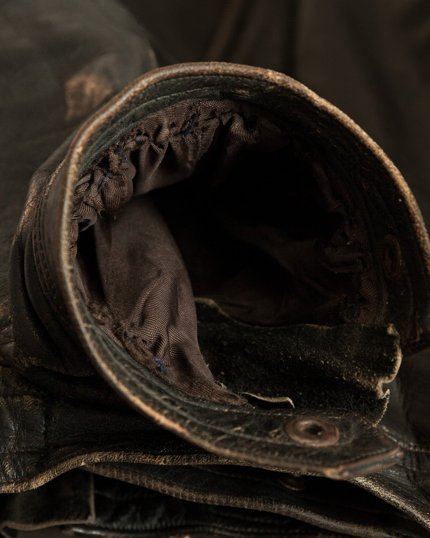 Constructed from dense black horsehide, the jacket carries the tensile strength and tight grain associated with mid century German production. The leather has developed a rich, layered patina, with natural creasing through the sleeves and torso that maps decades of movement. High contact areas show honest burnishing and tonal variation, adding depth without weakness. The hide remains supple, stable and structurally sound throughout.