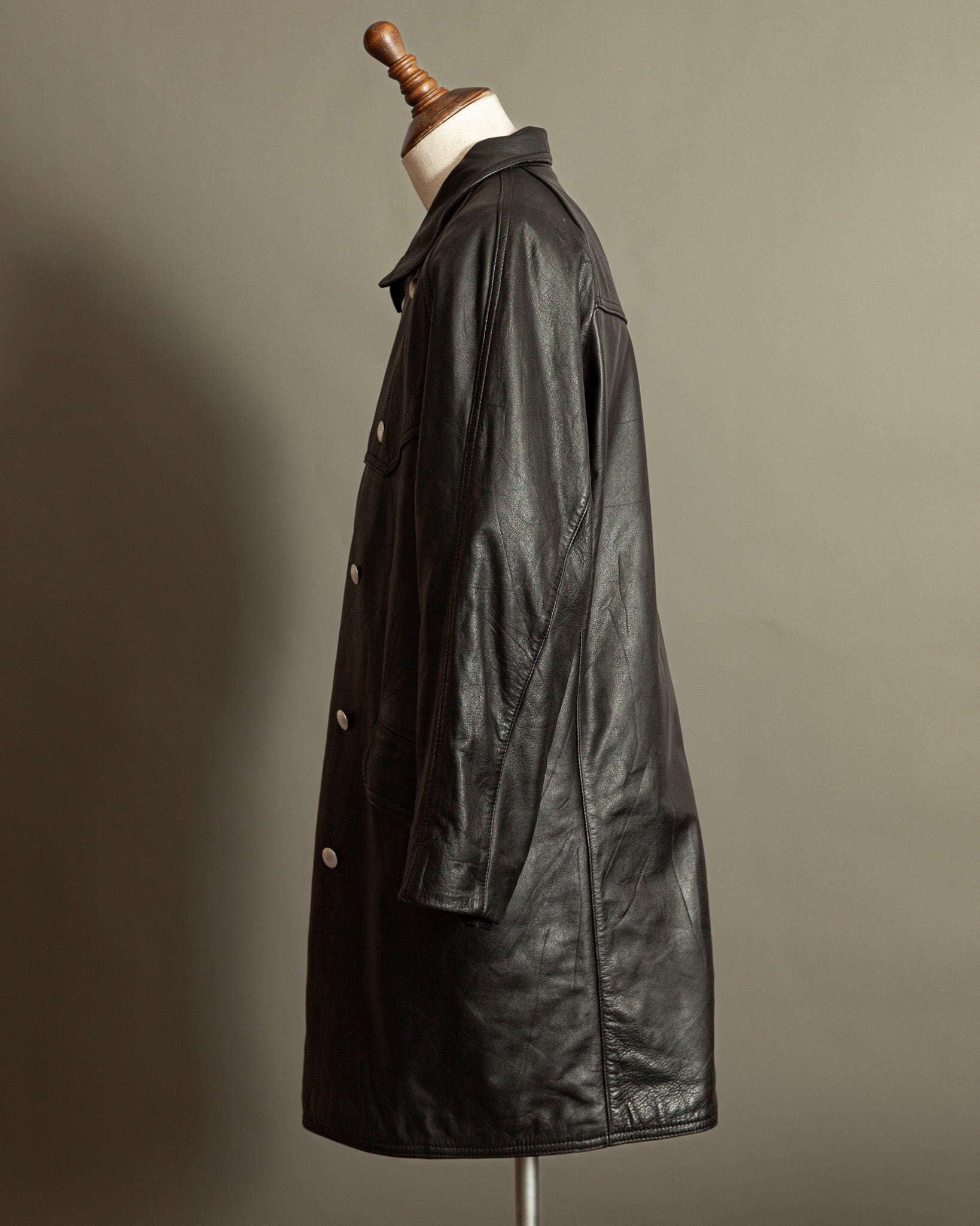 Cut from dense full-grain cowhide, the leather has a smooth, natural grain and a substantial drape that carries real presence. The deep black finish is rich and even, exuding quiet confidence rather than show. Silver-tone buttons line the double-breasted front, while the raglan sleeve construction and long-line silhouette offer both structure and freedom of movement. There’s a strength to the design, purposeful yet elegant that feels unmistakably authentic.