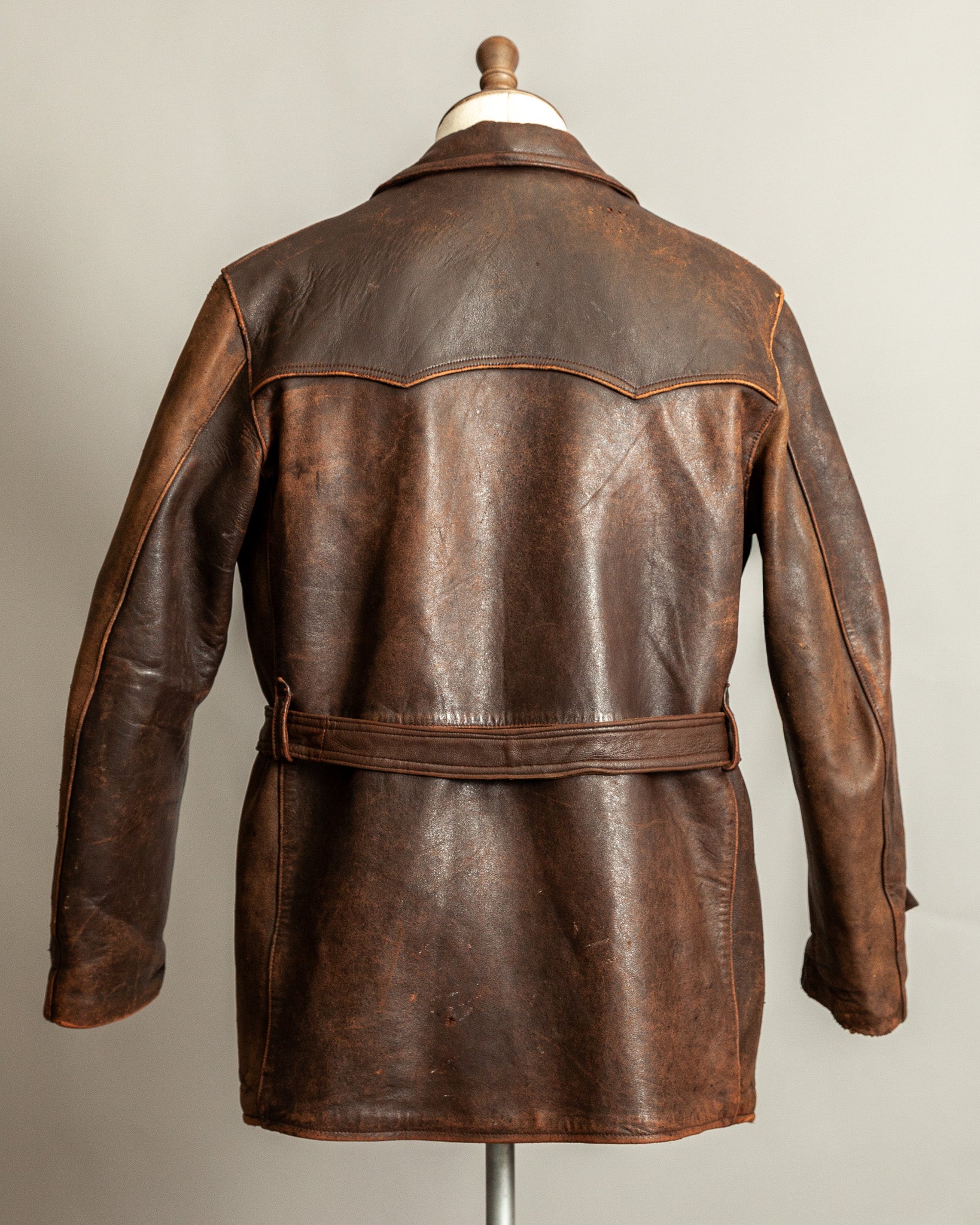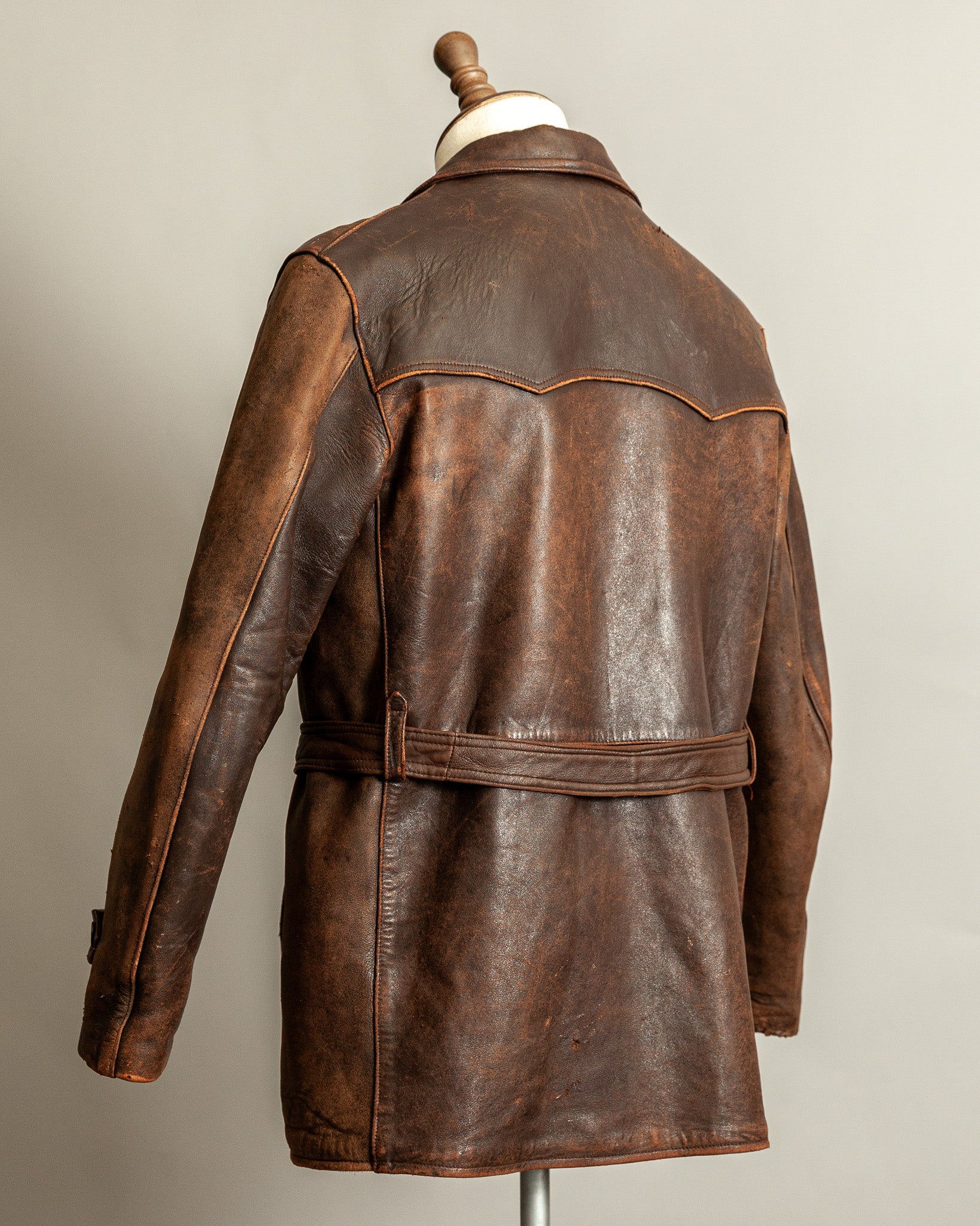This late 1940s French leather coat represents the best of post war European craftsmanship, a period when small ateliers across France returned to producing hard-wearing garments for motorists, riders, and tradesmen, drawing on wartime construction methods but refining them for civilian life. Built in the classic three-quarter-length belted silhouette, it captures the exact balance of practicality and understated style that defined French outerwear in the years immediately after liberation.
