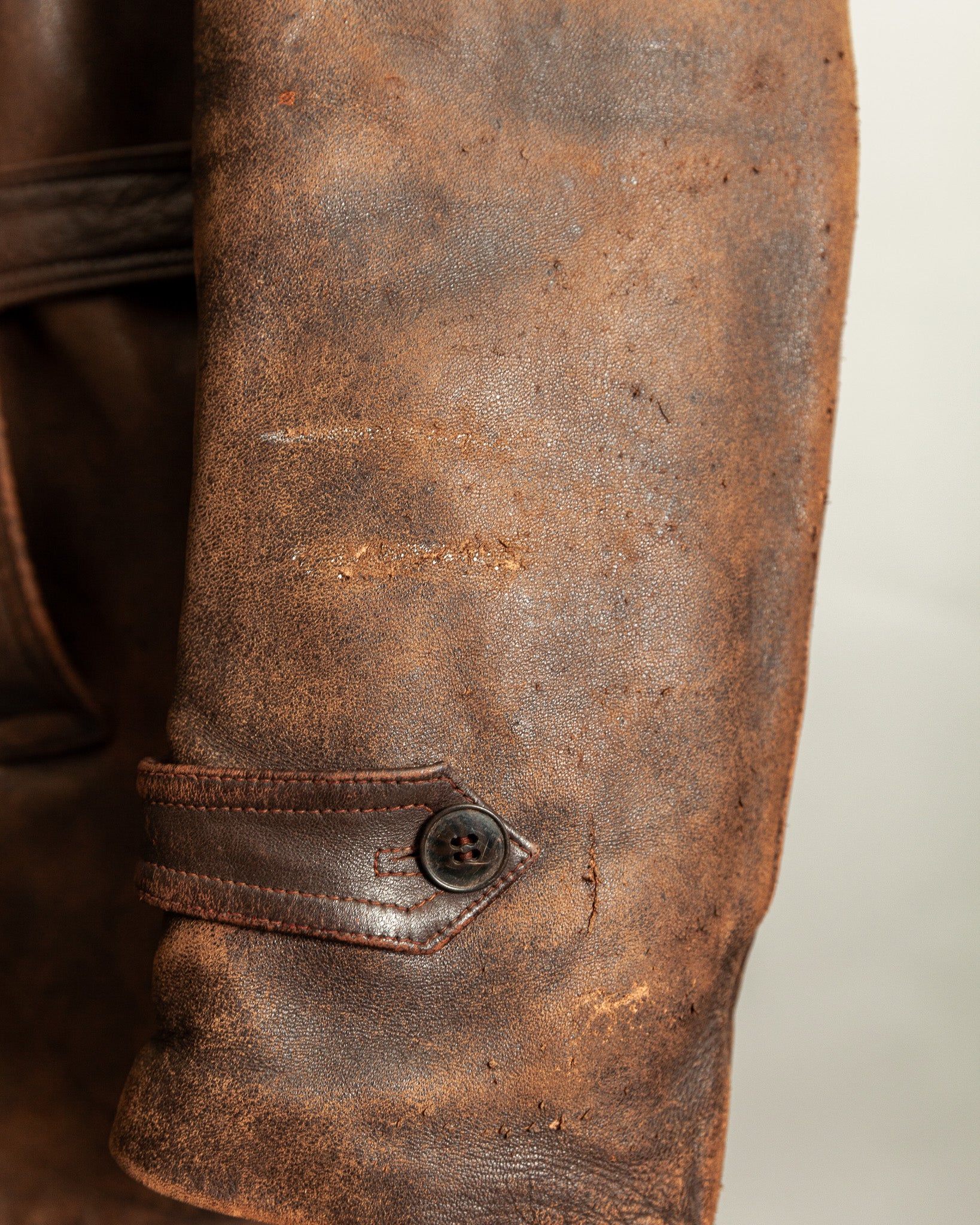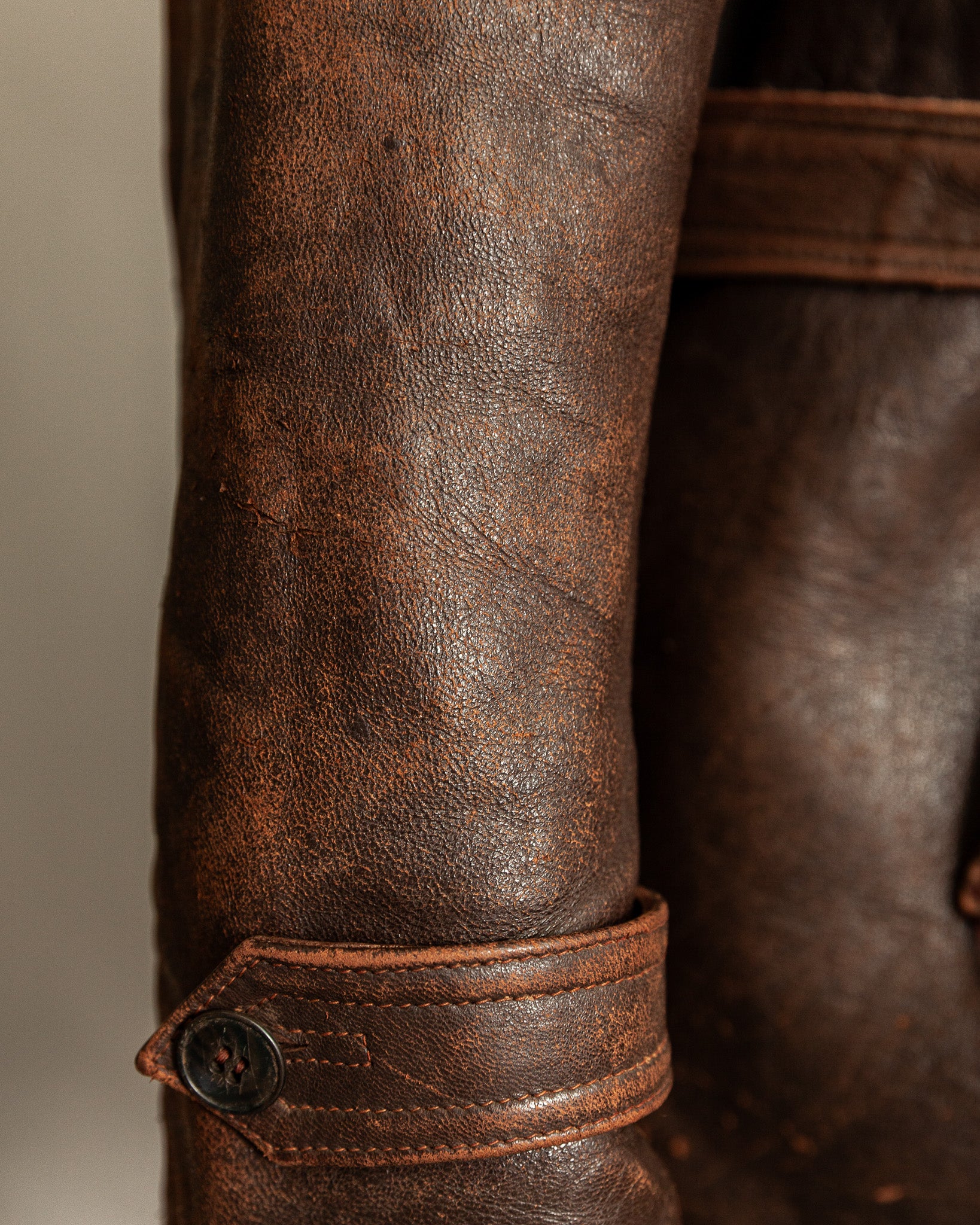 Cut from tight grained, vegetable tanned leather, the coat has developed a beautifully complex patina through decades of wear. The surface shifts from deep chestnut to warm amber across the seams and sleeves, revealing the natural ageing unique to mid century French tanning. Substantial in weight yet supple in hand, the hide retains the integrity of its original structure without stiffness, offering the confident drape associated with workwear and early motorcycling garments of the period.
