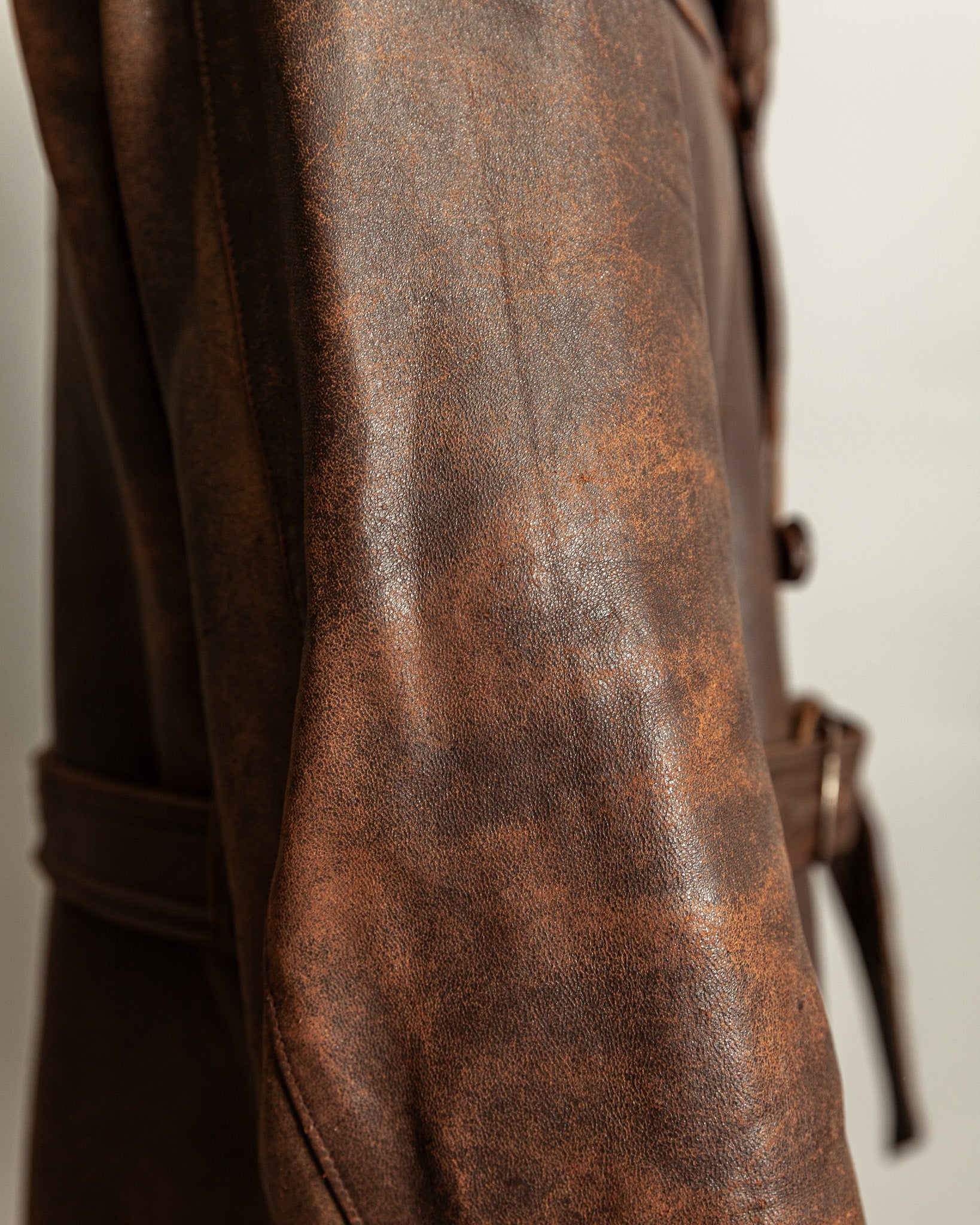 Professionally cleaned and conditioned, the coat has been carefully revived to preserve its authenticity while ensuring long term durability. The leather has been nourished to restore depth and suppleness, areas of age-related chapping treated, and the lining refreshed. All buttons, stitching, and the original belt remain secure and functional.