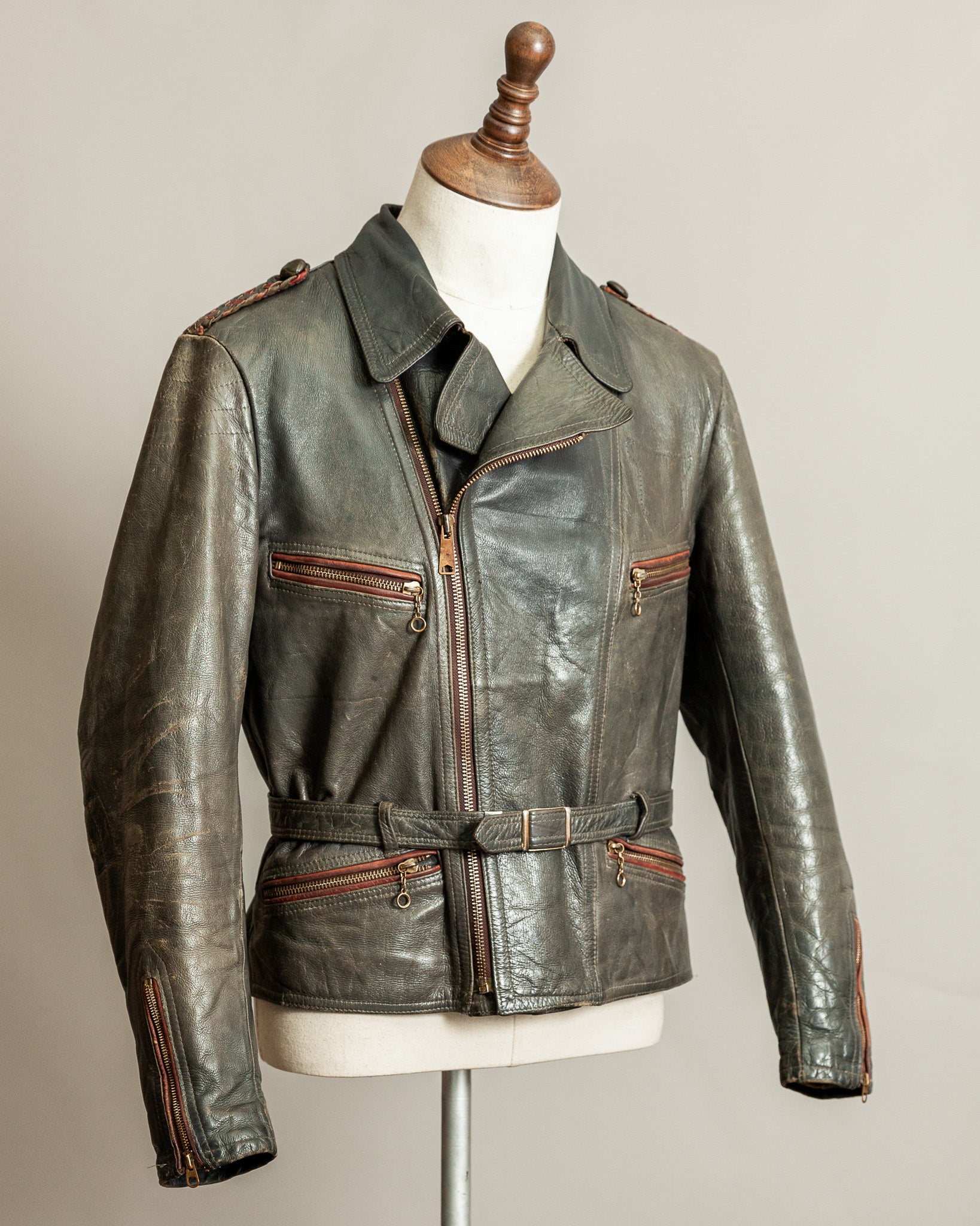 The Haelson motorcycle jacket is a powerful example of Western Germany’s postwar craftsmanship — produced by Haelson Lederbekleidung by Gastmann in Wilhelmshaven during the late 1940s to 1950s. Designed at a time when durability and precision were paramount, it captures the utilitarian refinement of early European motorcycling gear, built to withstand both road and weather with unmistakable style.