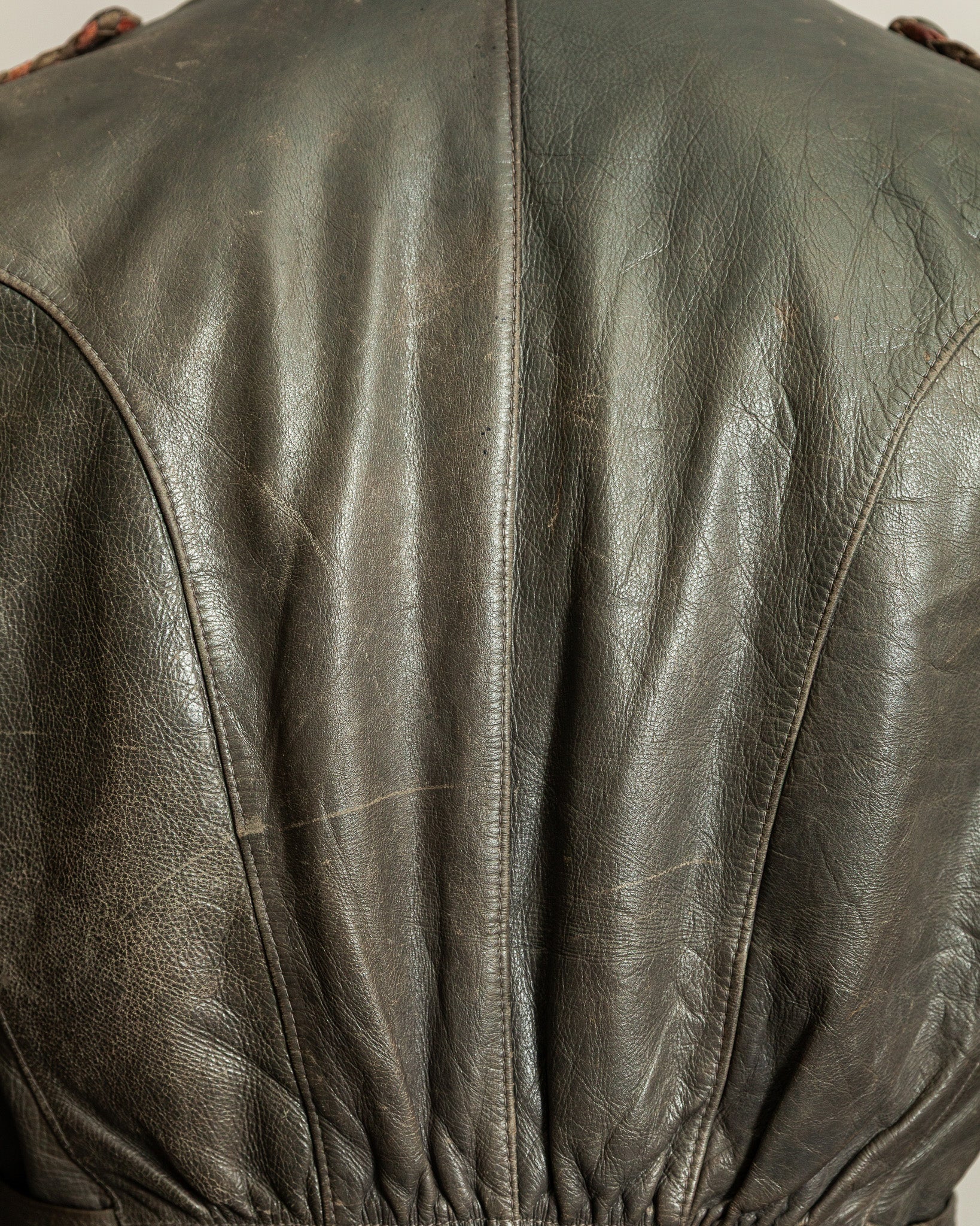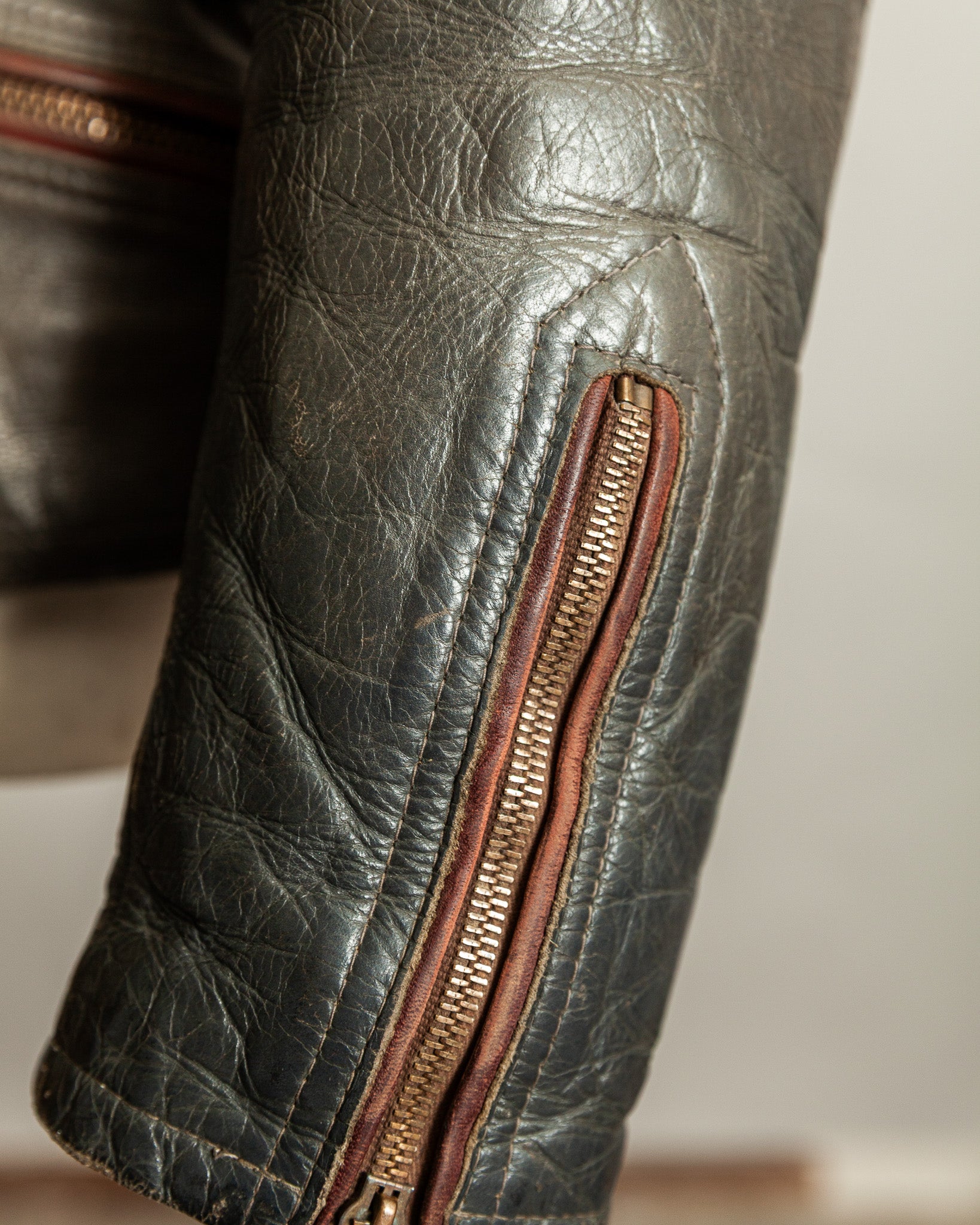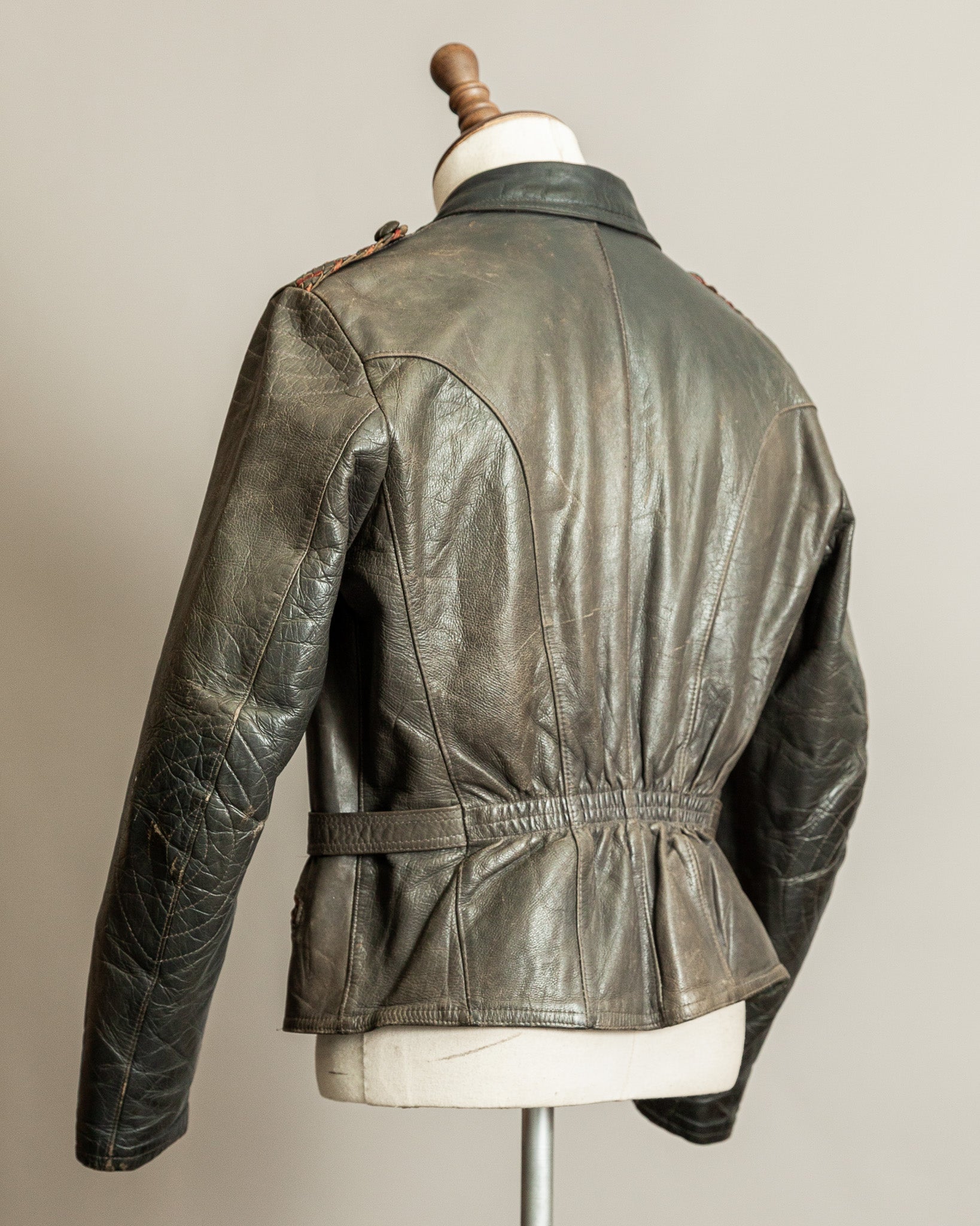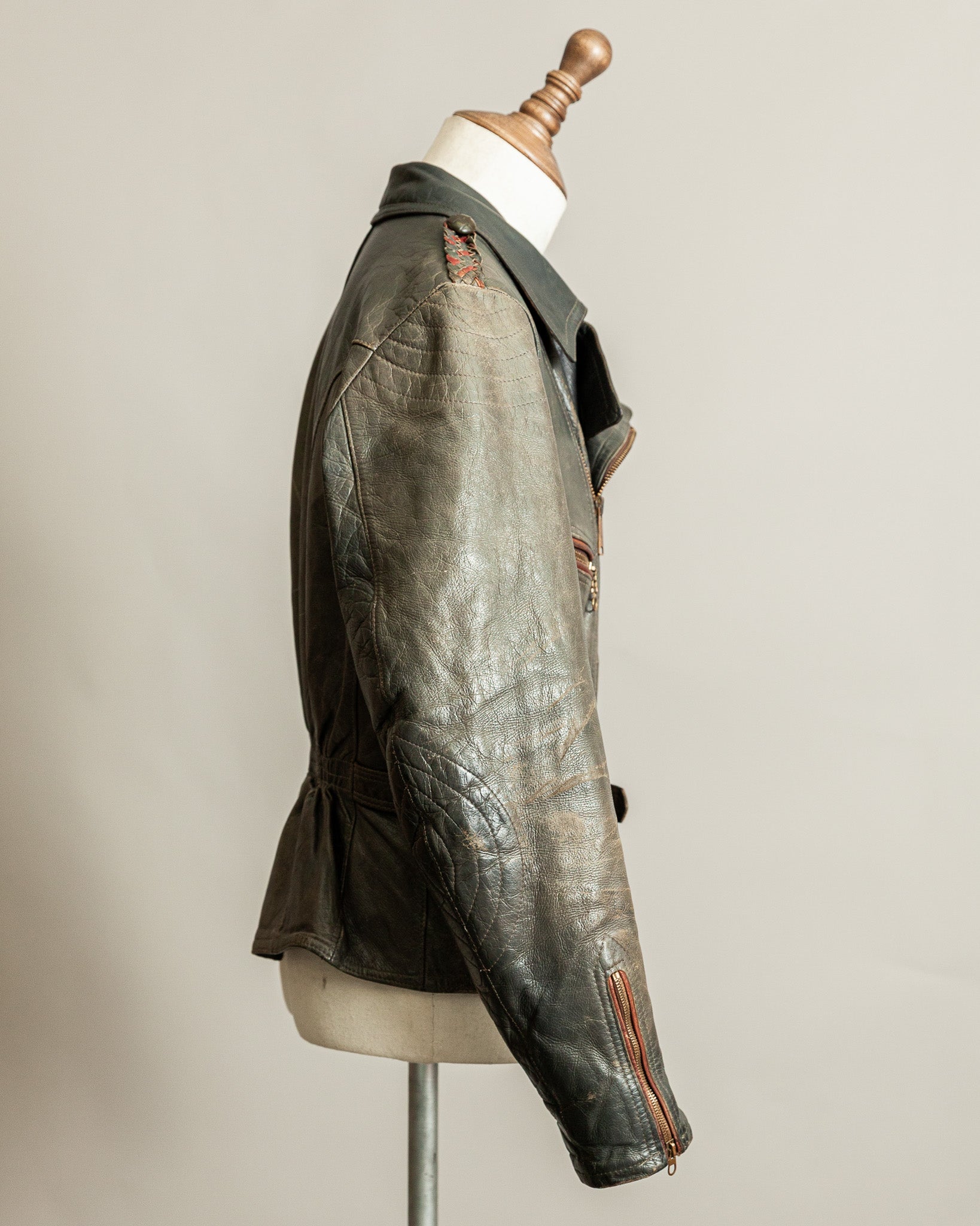 Crafted from supple mid-weight cowhide, the jacket has developed an extraordinary patina — a surface that transitions between olive-grey and brown tones, revealing depth, character, and the story of decades past. Its design features Haelson’s distinctive European tailoring, with four brass Ries zippers featuring ring pulls, quilted sleeve panels, red leather lattice epaulettes, and a belted waist for a structured yet fluid silhouette. The back is elegantly paneled, cinched at the waist, and cut to move with the rider — a hallmark of Haelson’s advanced postwar patterning.