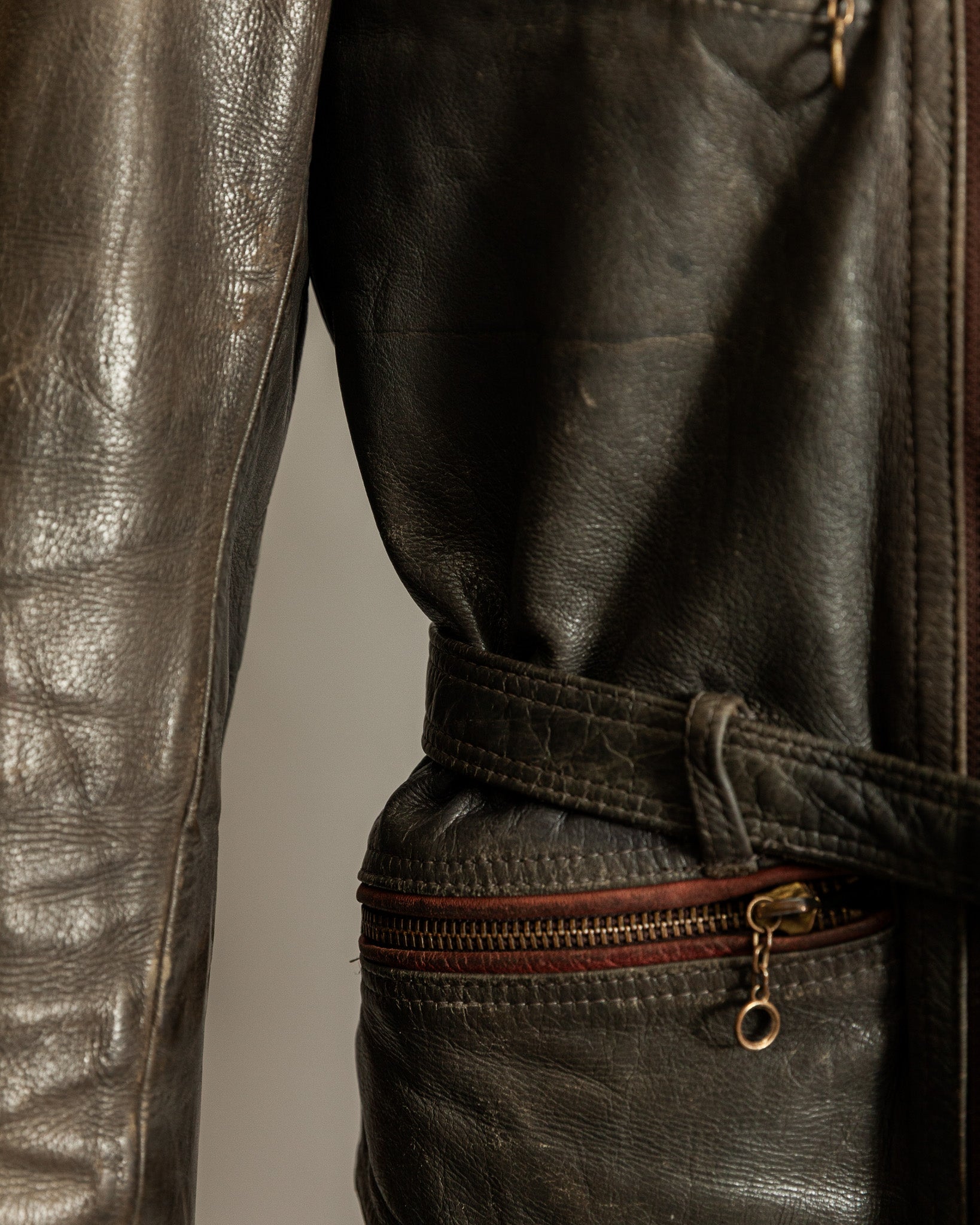 Professionally cleaned and conditioned in-house, the leather has been revived to retain its natural suppleness while preserving every trace of original wear. The main zipper has been replaced with a high-quality vintage YKK zip for improved function and longevity, while all Ries zips have been carefully refurbished. The interior remains original, lined in contrasting satin and cotton twill, with the Haelson label proudly intact. Evidence of a removed front badge adds a touch of intrigue to its already storied past.