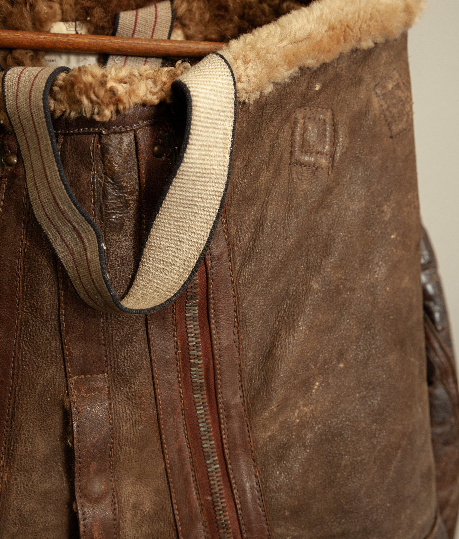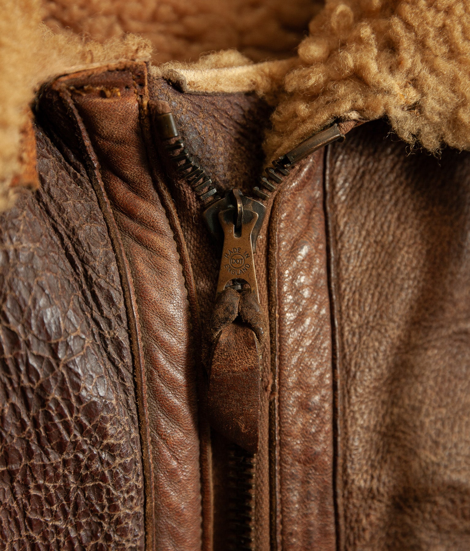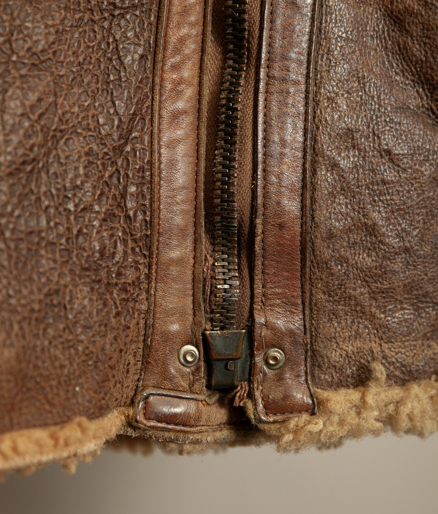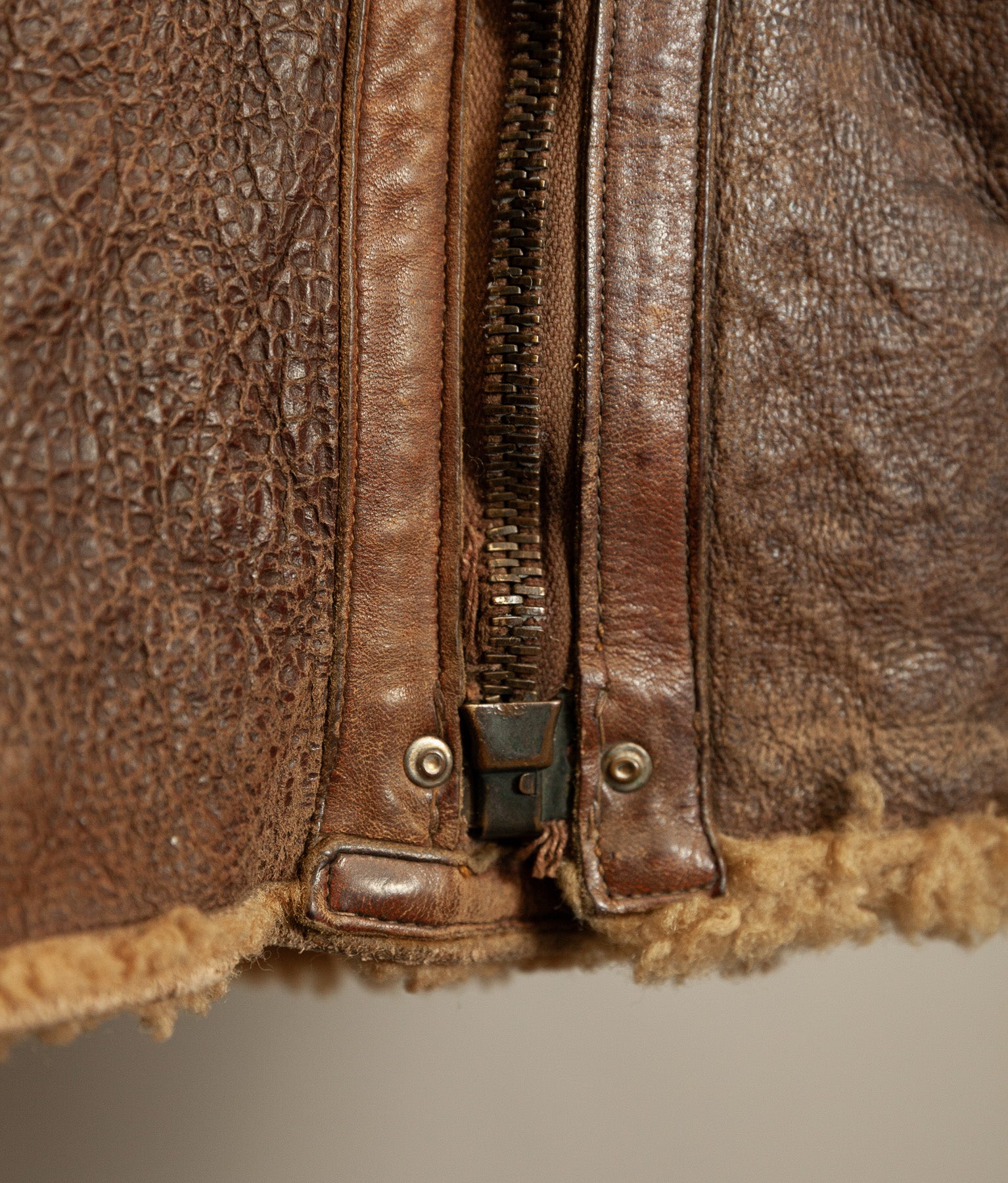 The jacket leather is structurally sound, with no holes or tears. The shearling shows expected age-related wear, particularly around the edges, cuffs, hem, and collar, consistent with prolonged service use. The main jacket zip has a misaligned tooth and has not been tested under tension. At the base of the zip, the leather braiding shows a small hole, visible in the images. For this reason, the jacket should not be considered wearable without specialist intervention.