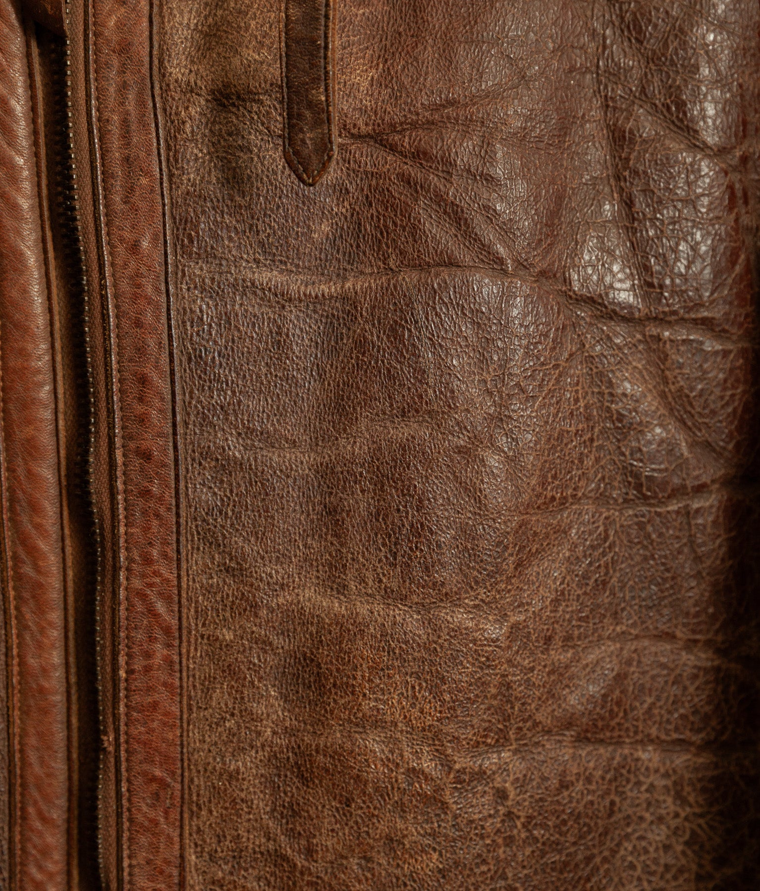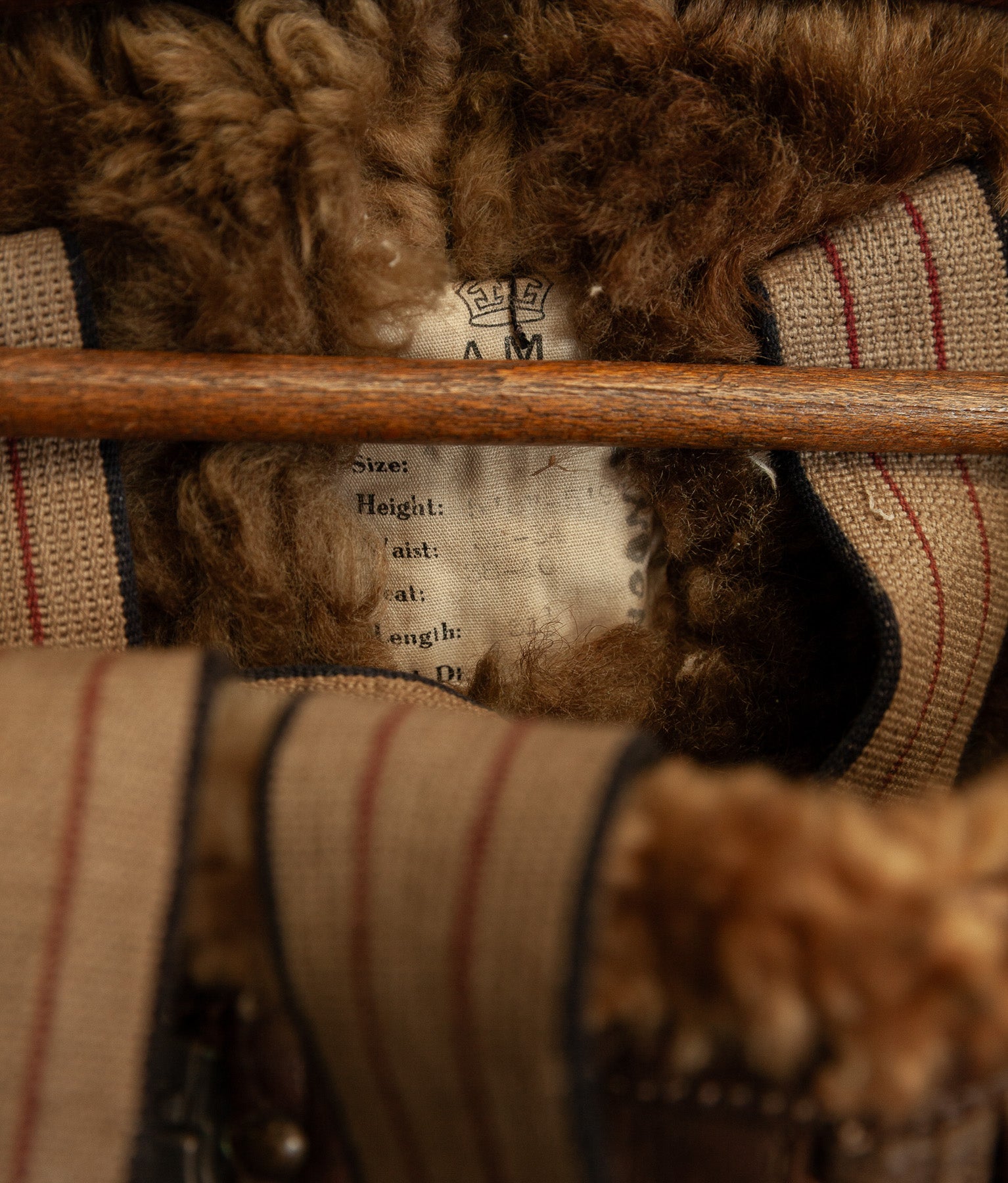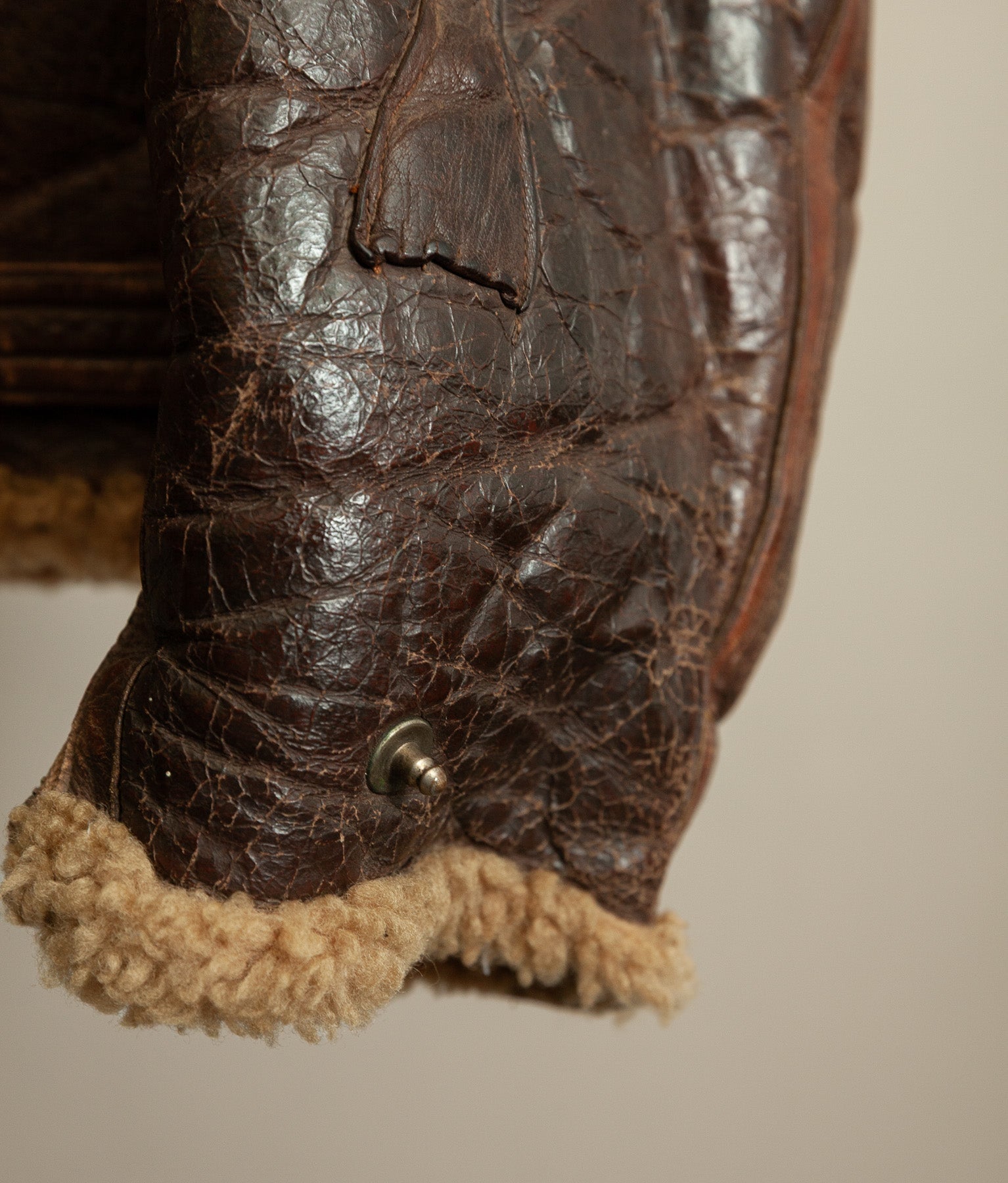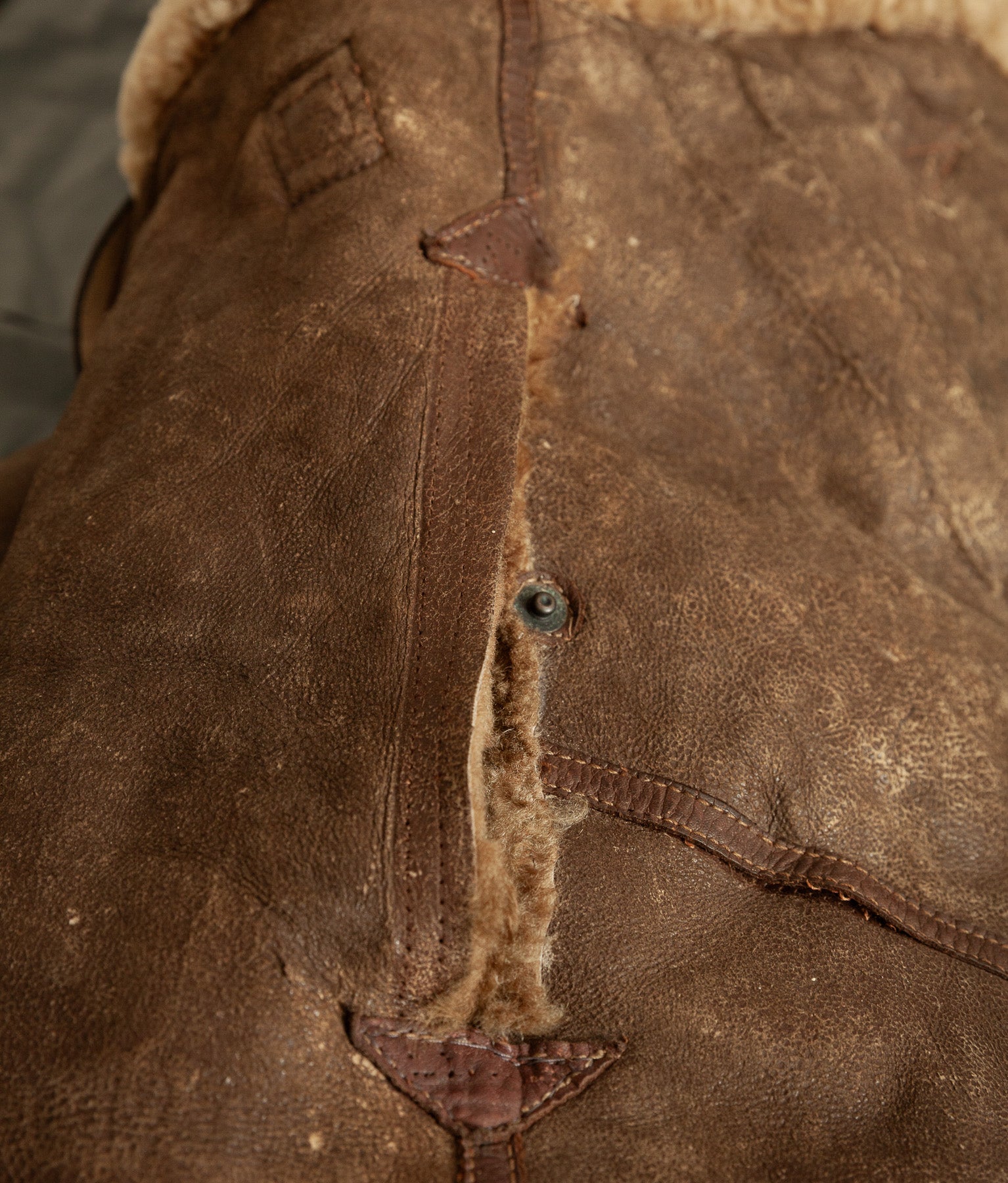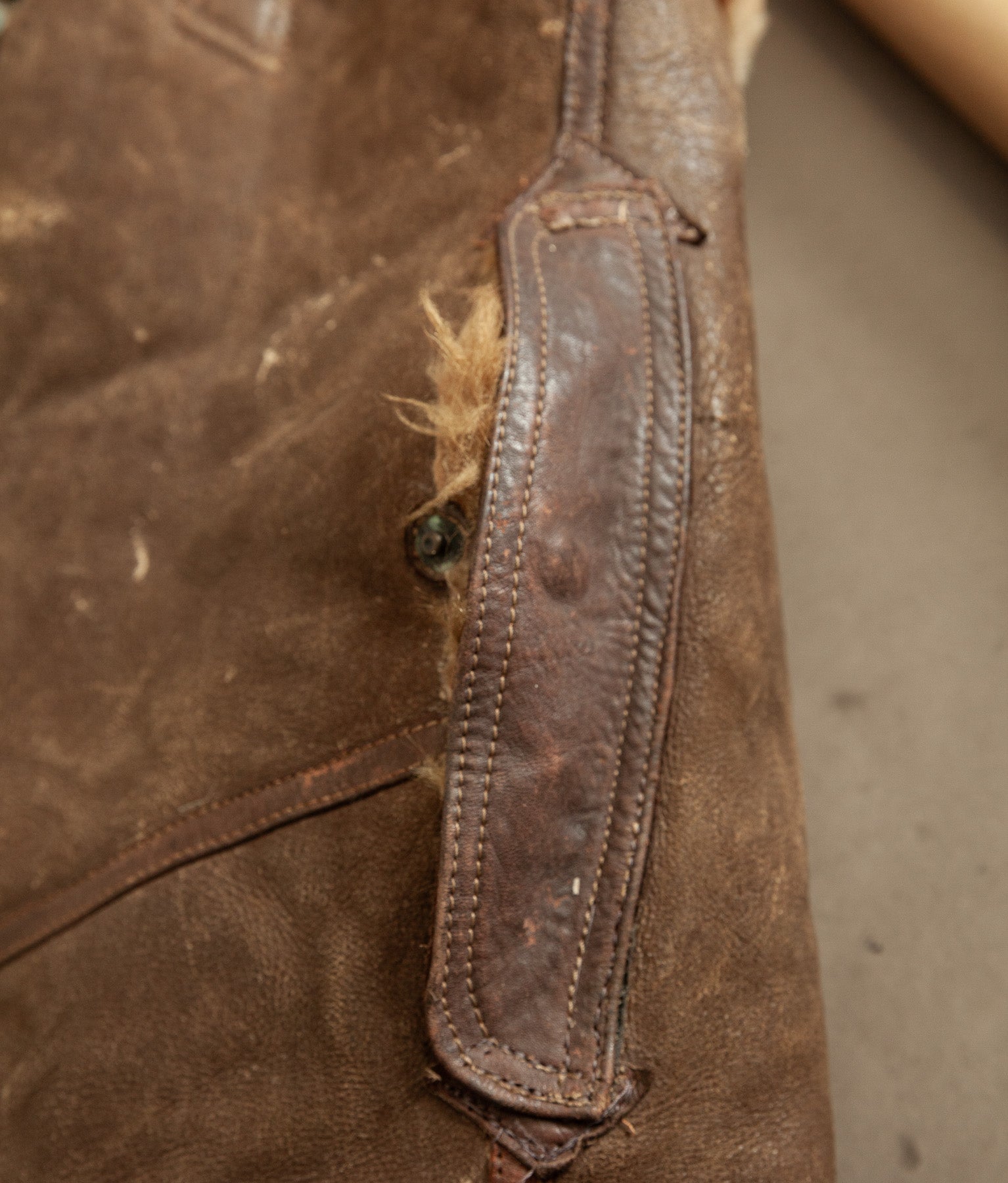The jacket leather is structurally sound, with no holes or tears. The shearling shows expected age-related wear, particularly around the edges, cuffs, hem, and collar, consistent with prolonged service use. The main jacket zip has a misaligned tooth and has not been tested under tension. At the base of the zip, the leather braiding shows a small hole, visible in the images. For this reason, the jacket should not be considered wearable without specialist intervention.