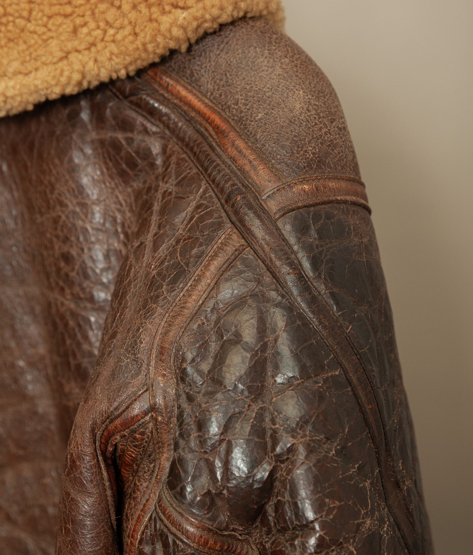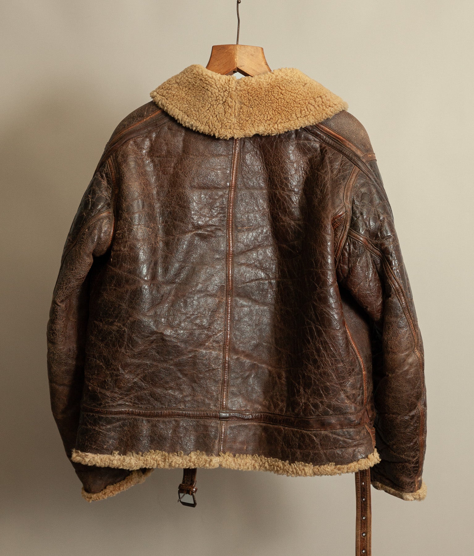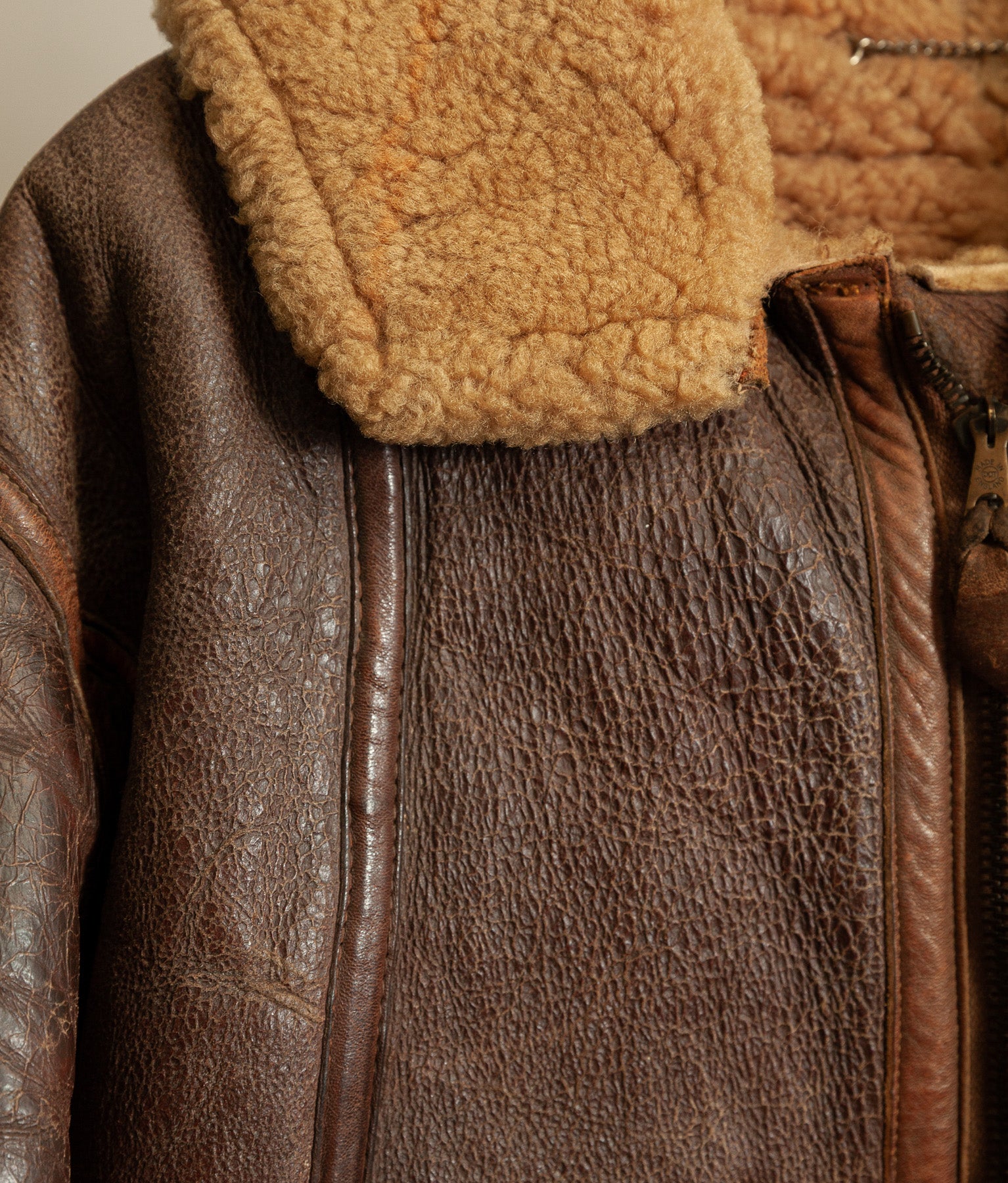 Despite the absence of the electrical components, the channels remain intact and clearly define this as a purpose-built electrically wired jacket rather than a standard Irvin variant. The jacket retains a full shearling interior and a strong, weighty leather outer consistent with wartime manufacture.