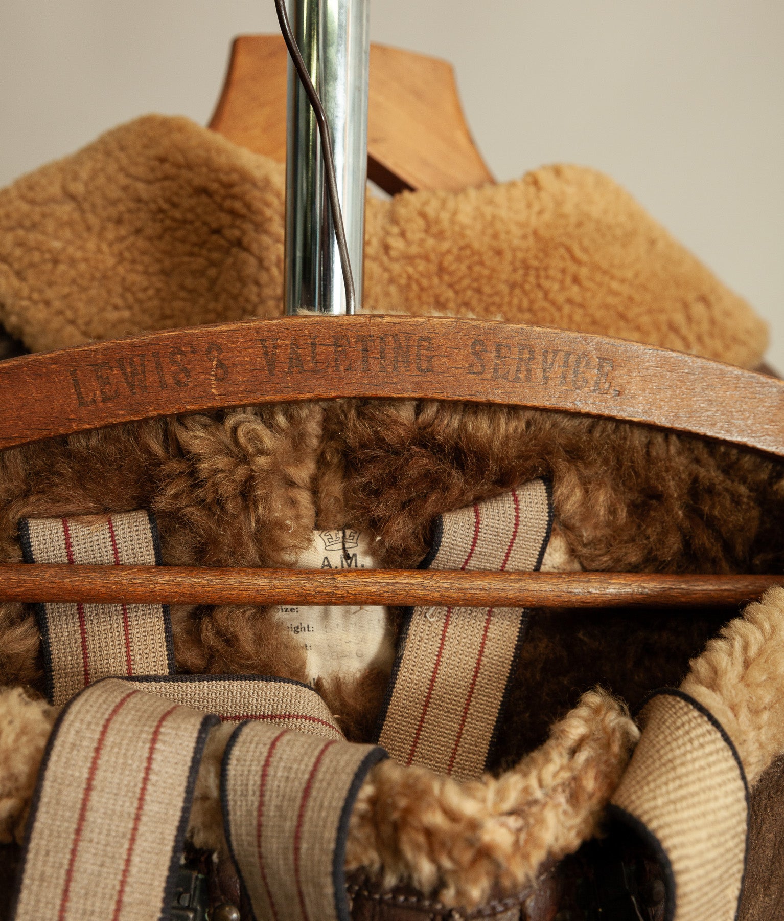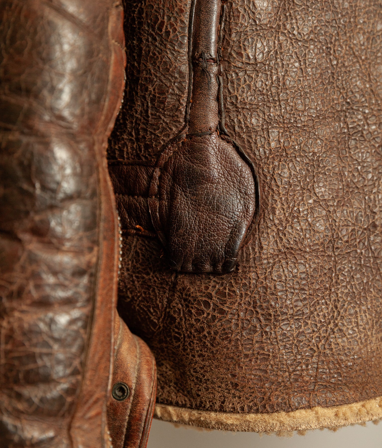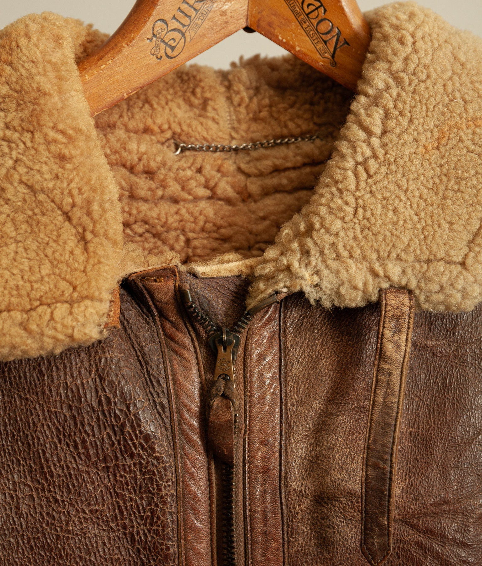 Despite the absence of the electrical components, the channels remain intact and clearly define this as a purpose-built electrically wired jacket rather than a standard Irvin variant. The jacket retains a full shearling interior and a strong, weighty leather outer consistent with wartime manufacture.