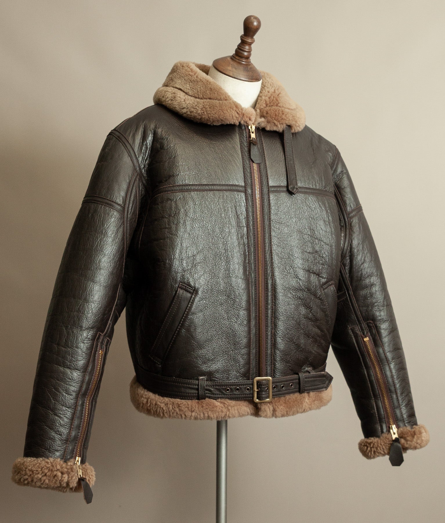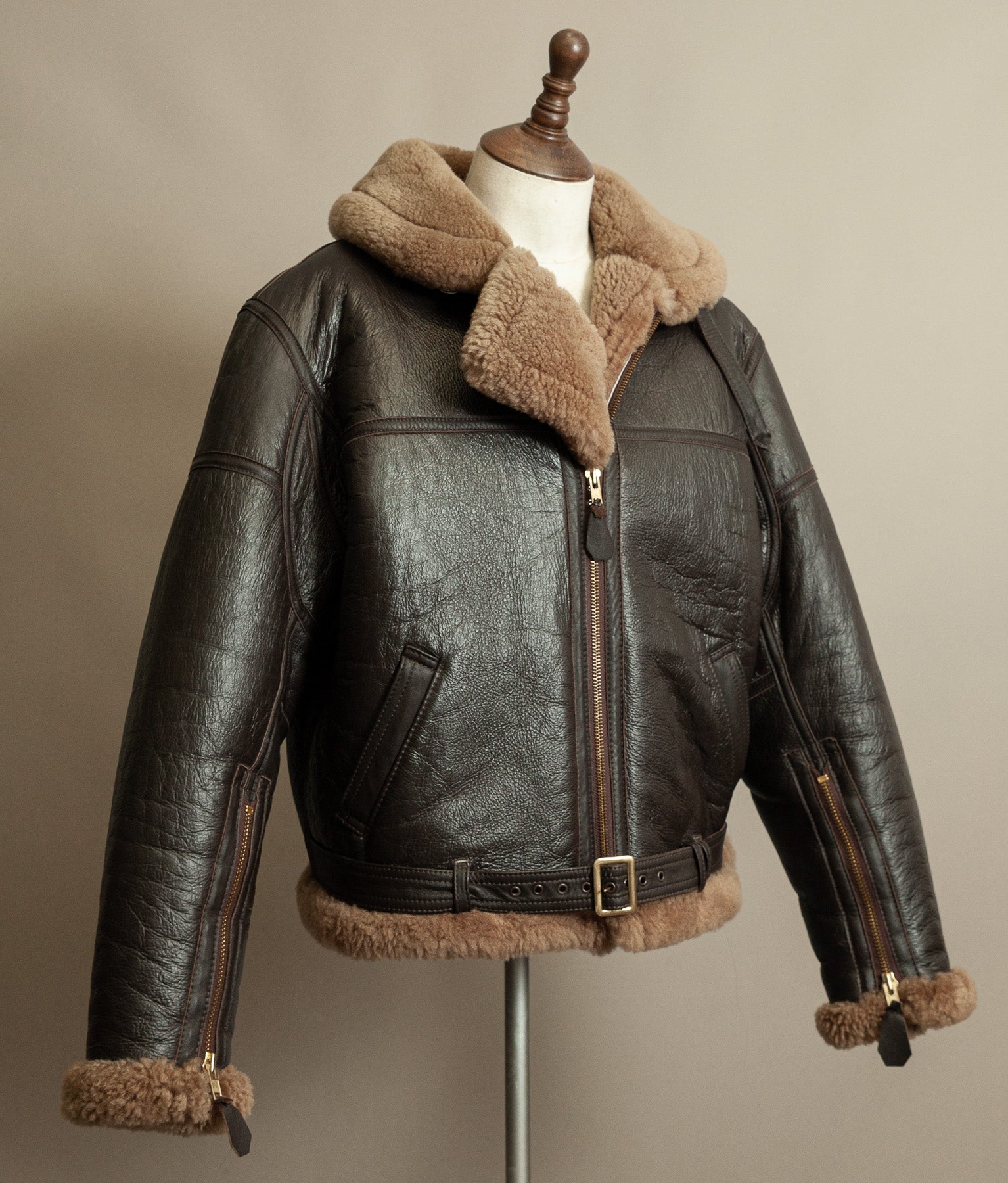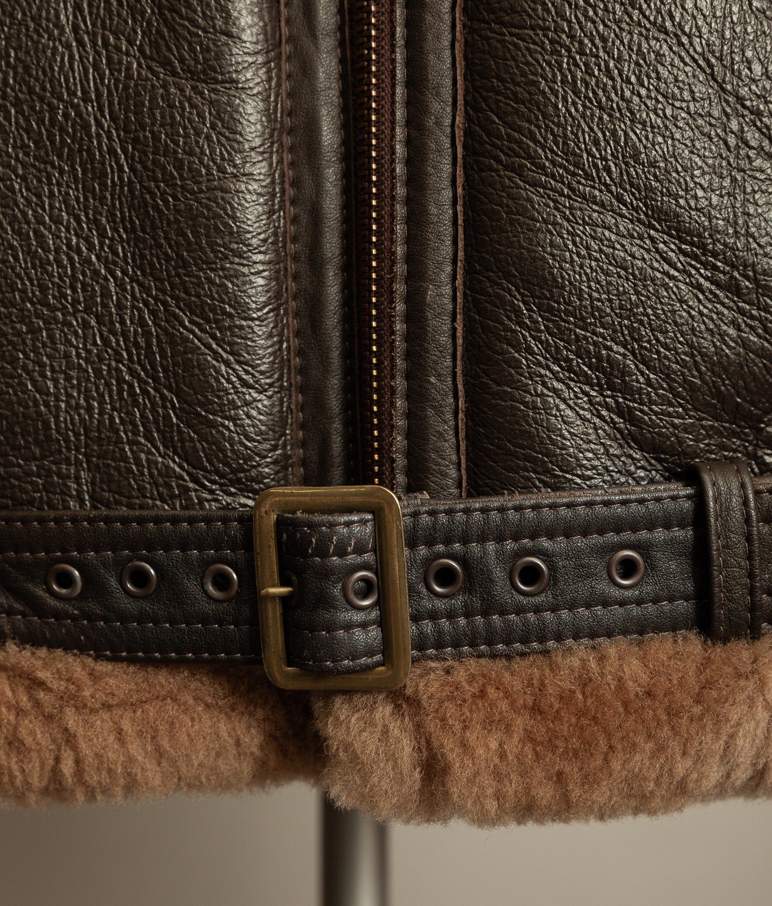 Internally, the jacket is fully shearling-lined and fitted with two internal pockets, a discreet and practical detail that adds everyday usability without disturbing the original design language. Original-style hardware is retained throughout, including the main front zip, sleeve zips, belt fittings, and throat latch components, all of which function as intended.